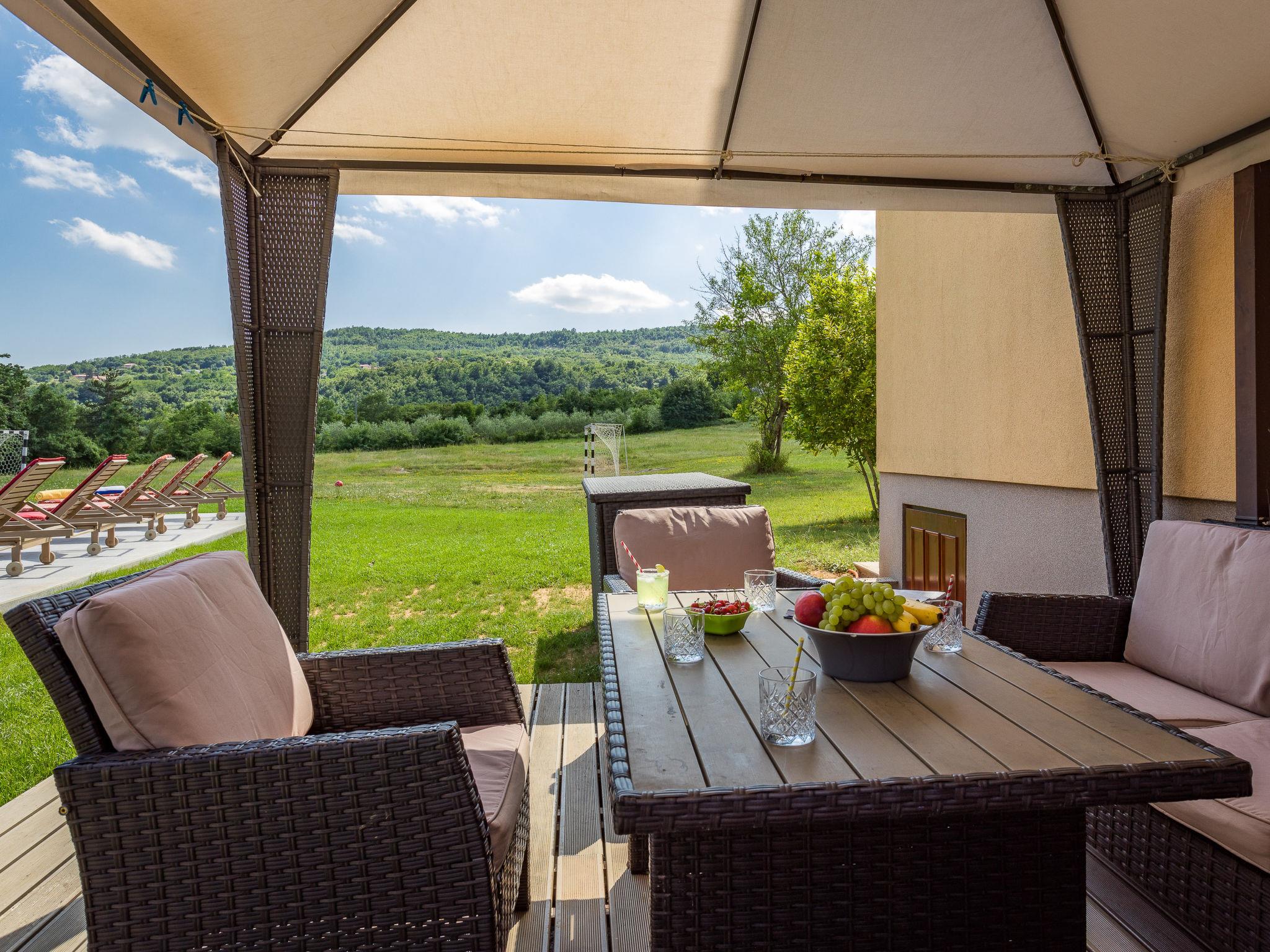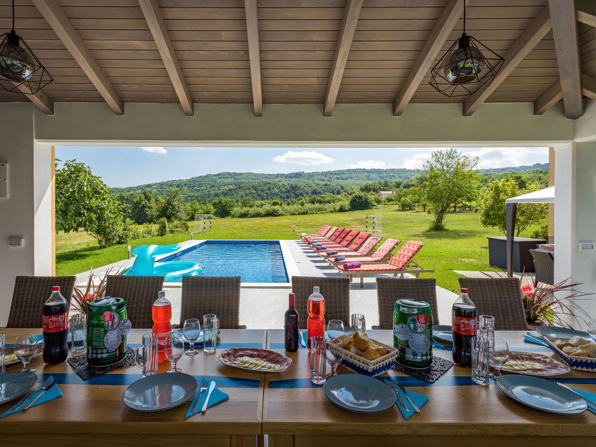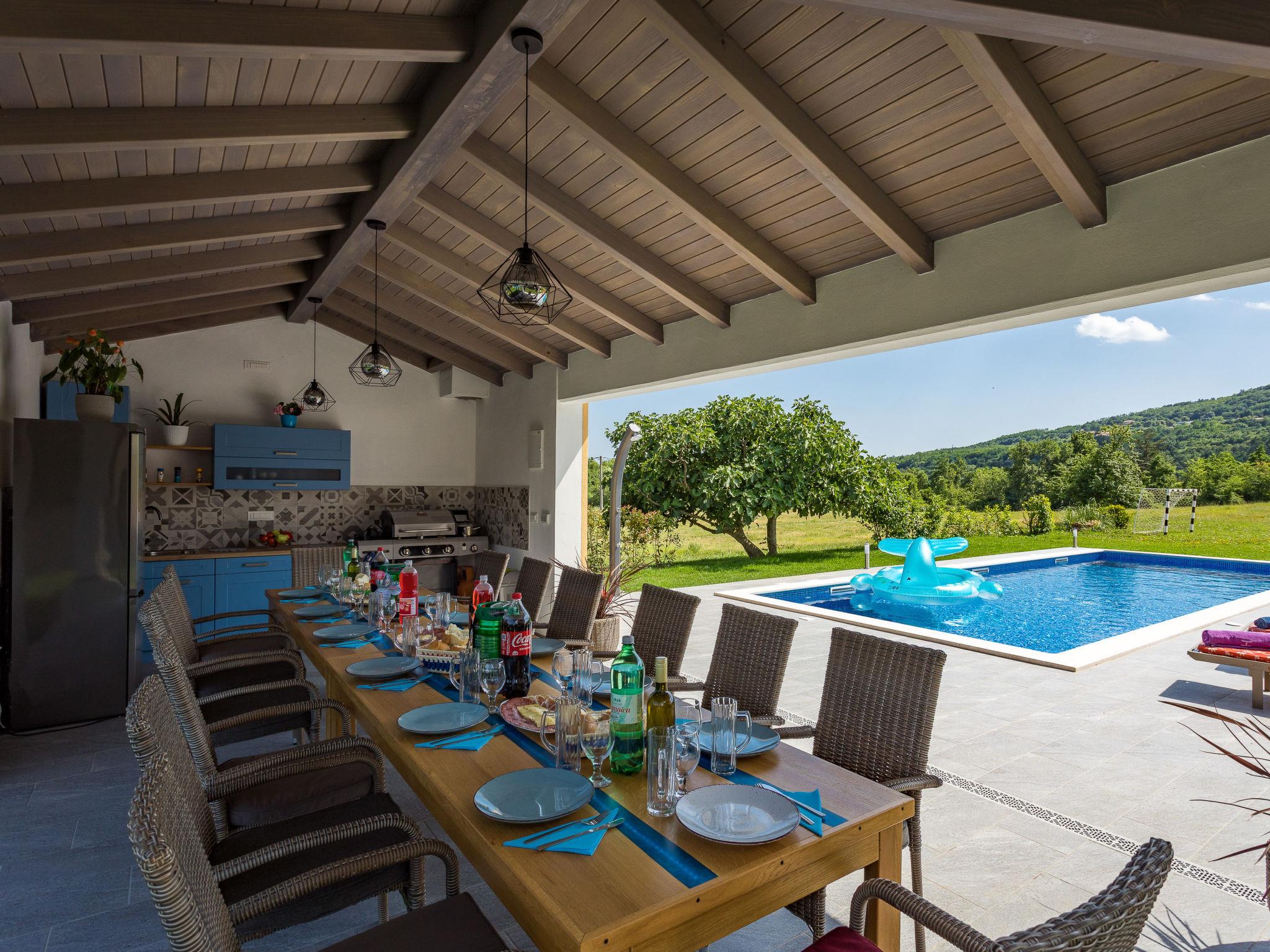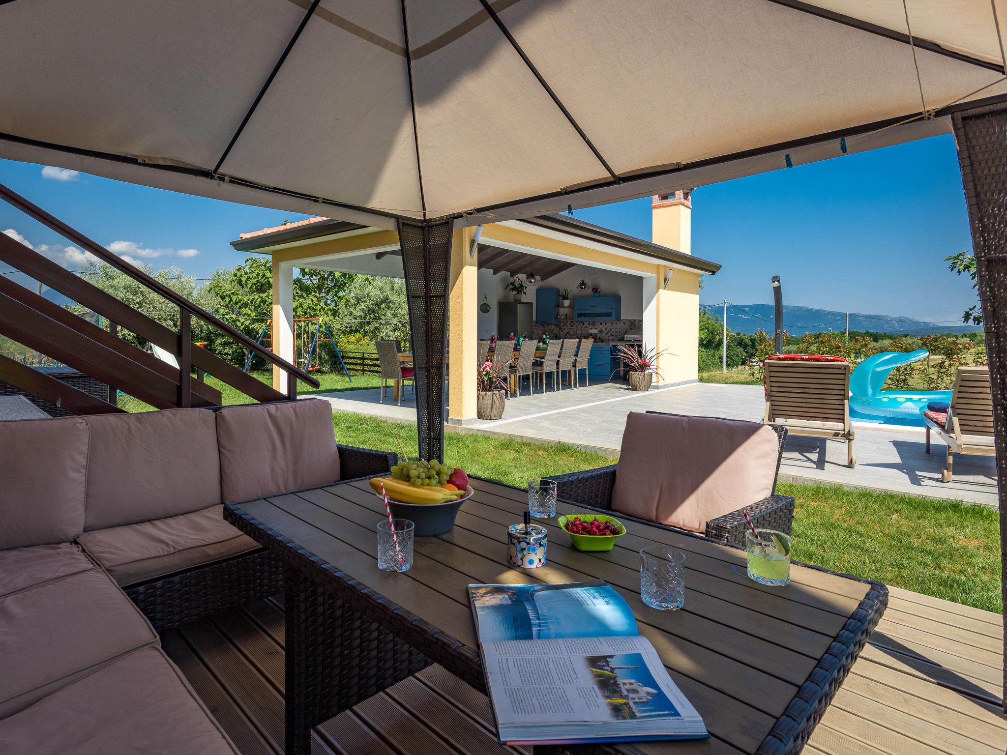Single-family house "Villa Helena", 2 storeys. 4 km from the centre of Pican, 13 km from the centre of Pazin, 20 km from the centre of Rabac, 14 km from the sea. Private: property 5'000 m2 with lawn and trees, swimming pool (11 x 4 m, depth 145 cm, seasonal availability: 20.May. - 28.Sep.). Outdoor shower, terrace, garden furniture, barbecue (slide, swing). In the house: internet access, billiard table, table football, trampoline, washing machine. Parking (for 5 cars) on the premises. Shop 4 km, bus stop 12 km, pebble beach 20 km. Private: outdoor kitchen ( 6 gas rings. oven, dishwasher, fridge, sink, terrace furniture, barbecue).