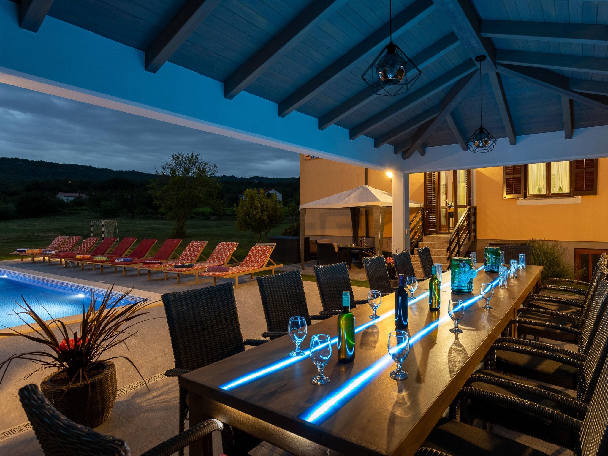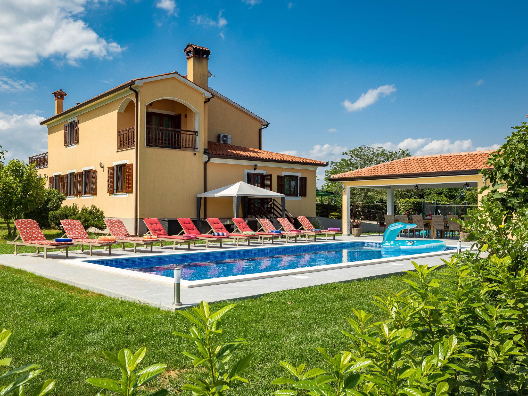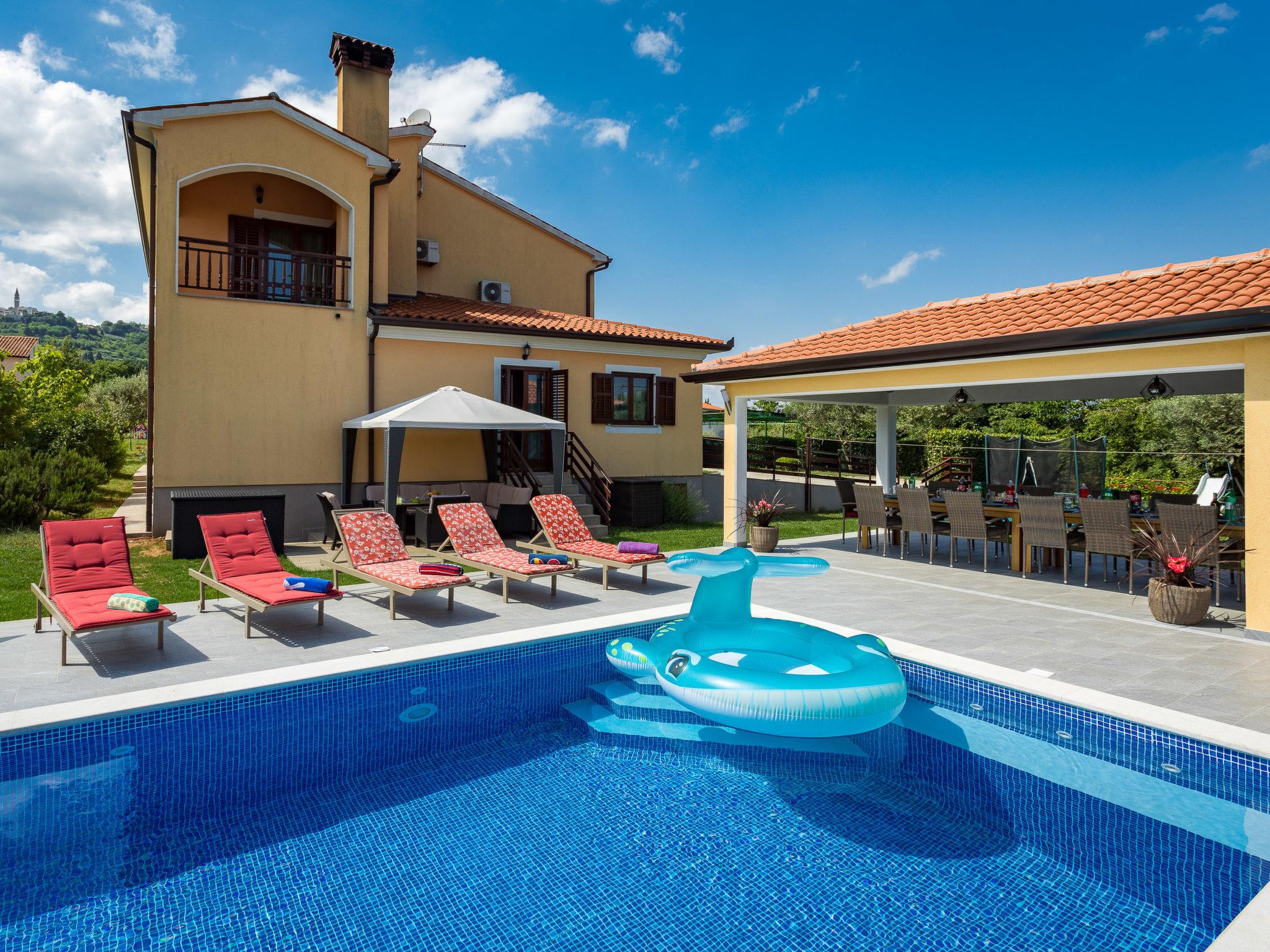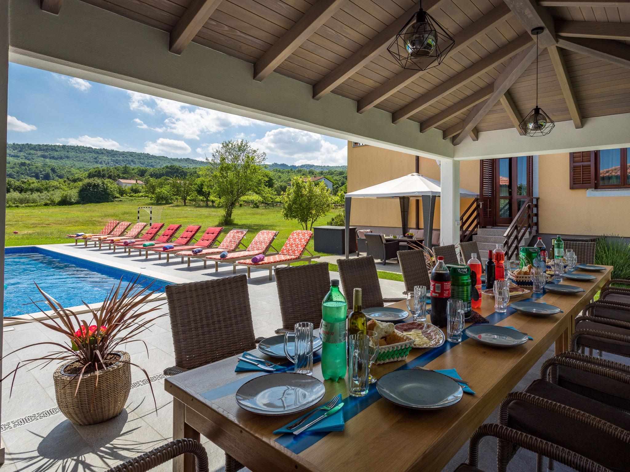 Single-family house "Villa Helena", 2 storeys. 4 km from the centre of Pican, 13 km from the centre of Pazin, 20 km from the centre of Rabac, 14 km from the sea. Private: property 5'000 m2 with lawn and trees, swimming pool (11 x 4 m, depth 145 cm, seasonal availability: 20.May. - 28.Sep.). Outdoor shower, terrace, garden furniture, barbecue (slide, swing). In the house: internet access, billiard table, table football, trampoline, washing machine. Parking (for 5 cars) on the premises. Shop 4 km, bus stop 12 km, pebble beach 20 km. Private: outdoor kitchen ( 6 gas rings. oven, dishwasher, fridge, sink, terrace furniture, barbecue).