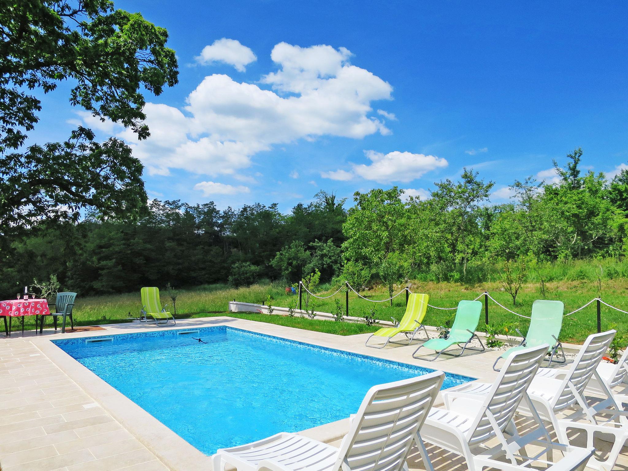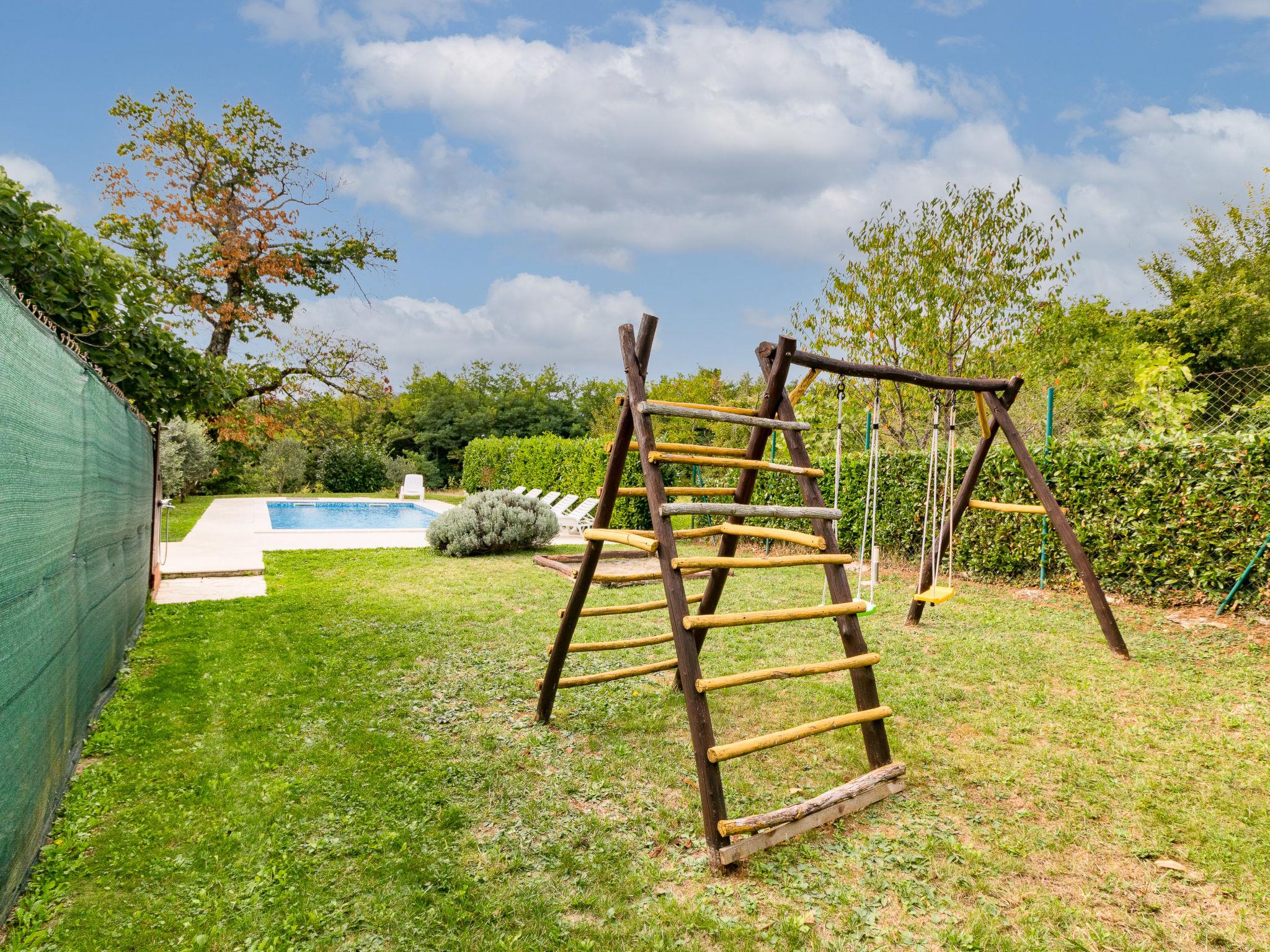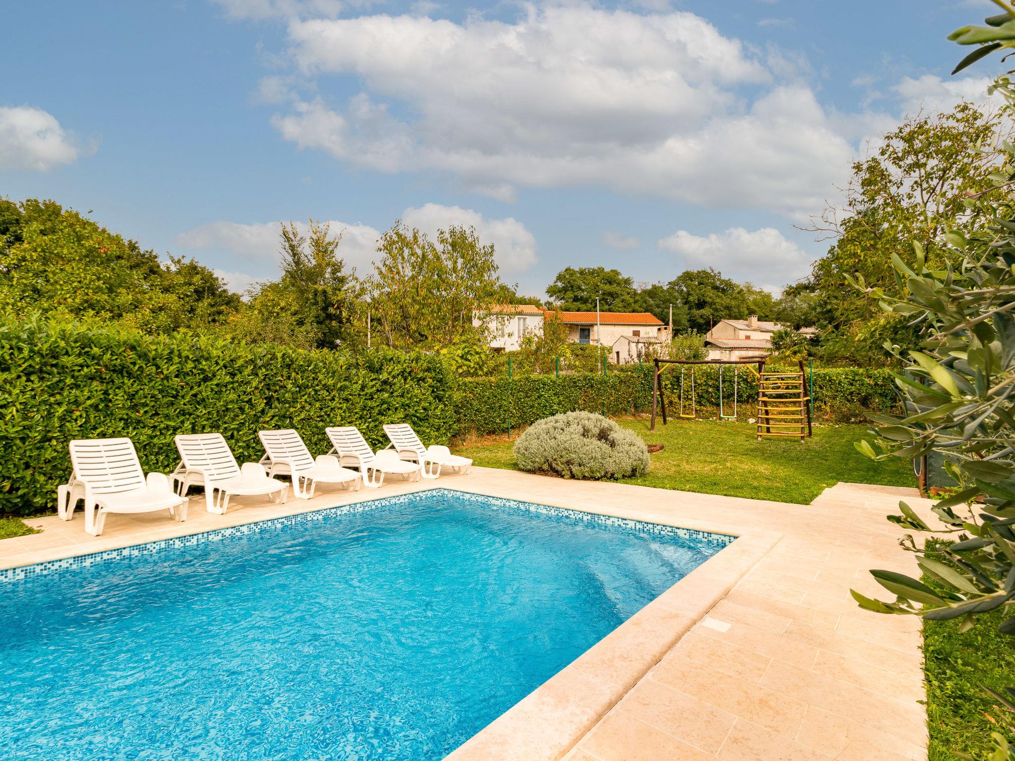 Single-family house "Sonja", 2 storeys. In the hamlet Montovani 8 km from the centre of Pican, 13 km from the centre of Žminj, 27 km from the centre of Rabac, 27 km from the sea. Private: property 1'500 m2 with lawn, swimming pool (7 x 4 m, depth 150 cm, seasonal availability: 01.May. - 09.Oct.). Basketball, terrace, garden furniture, barbecue, children's playground, pool maintenance by the owner/gardener. In the house: internet access, table football. Parking (for 3 cars) at the house on the premises. Shop 4 km, restaurant 13 km, bus stop 12.5 km, rocky beach 27 km. Groups of teenagers are not allowed.