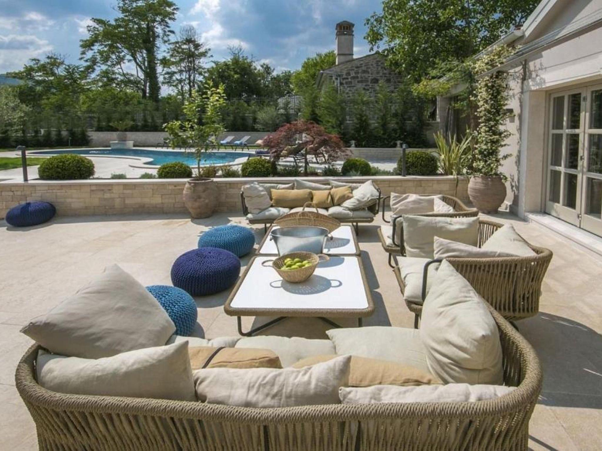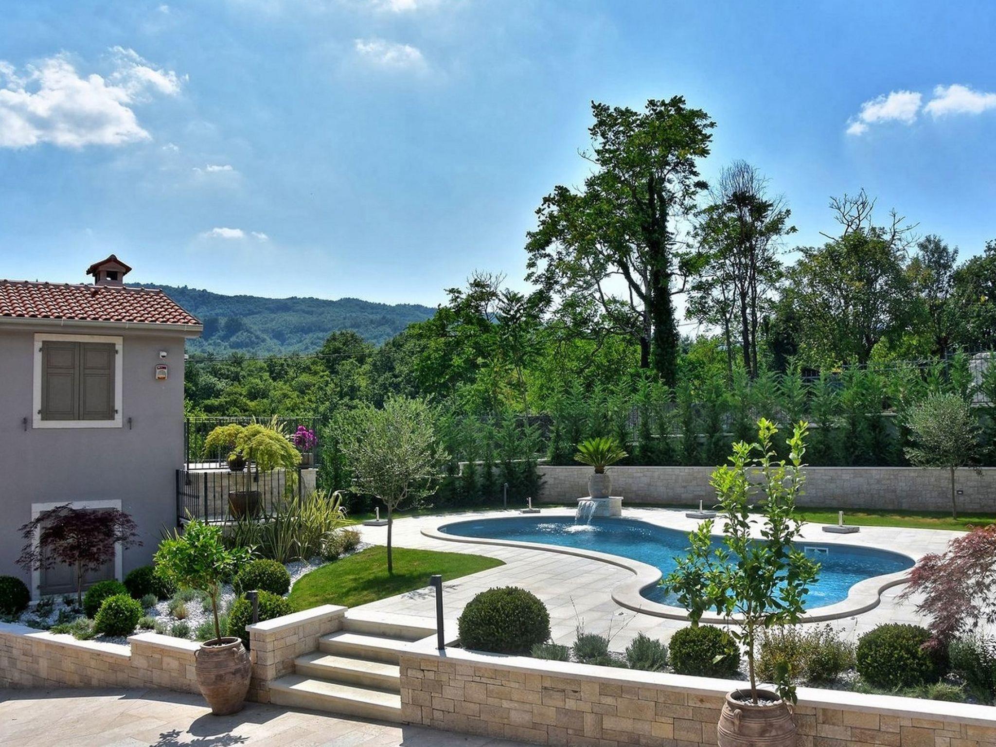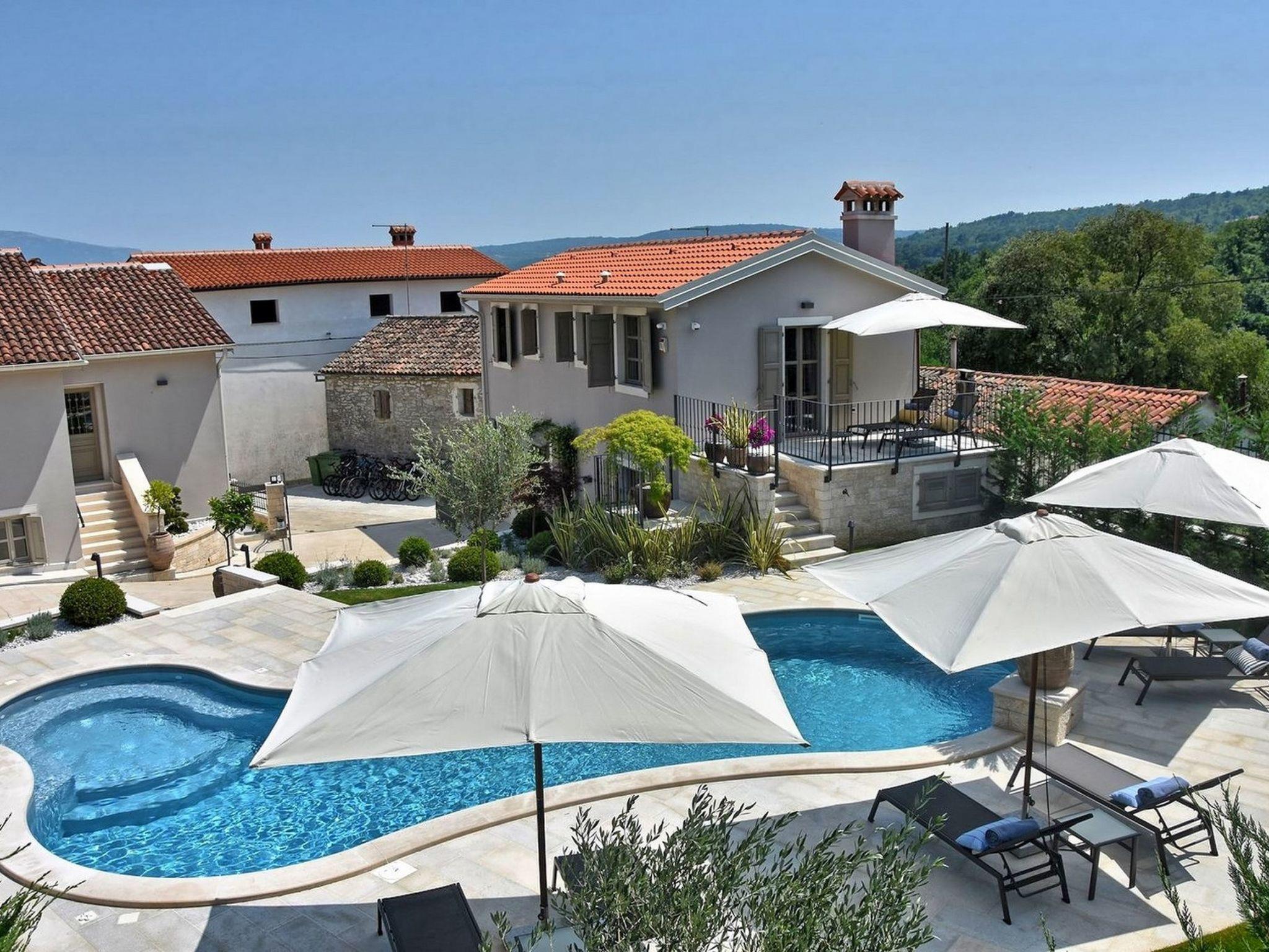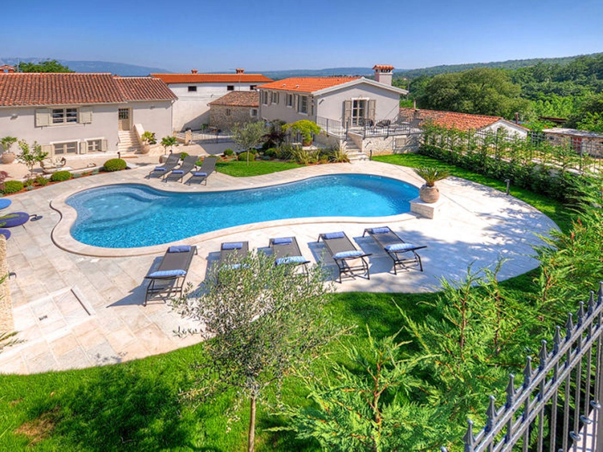 Villa Zita Exclusive is located on the edge of the quiet village of Svici near the town of Pican, about 16.5 km from the sea and 27 km from the tourist resort of Rabac. On a 650 square metre fenced plot, guests of the villa have numerous outdoor facilities at their disposal: Pool of 55 sqm with whirlpool area, counter-current swimming and waterfall, a fully equipped summer kitchen with charcoal and gas grill, bread oven, ice maker, dishwasher, table and chairs for 10 people and a large LCD TV. There is also a large sun terrace with sun loungers and an air-conditioned 50 square metre wellness area with LCD TV, Finnish sauna, shower and WC. Private parking for 4 cars is available on the property.