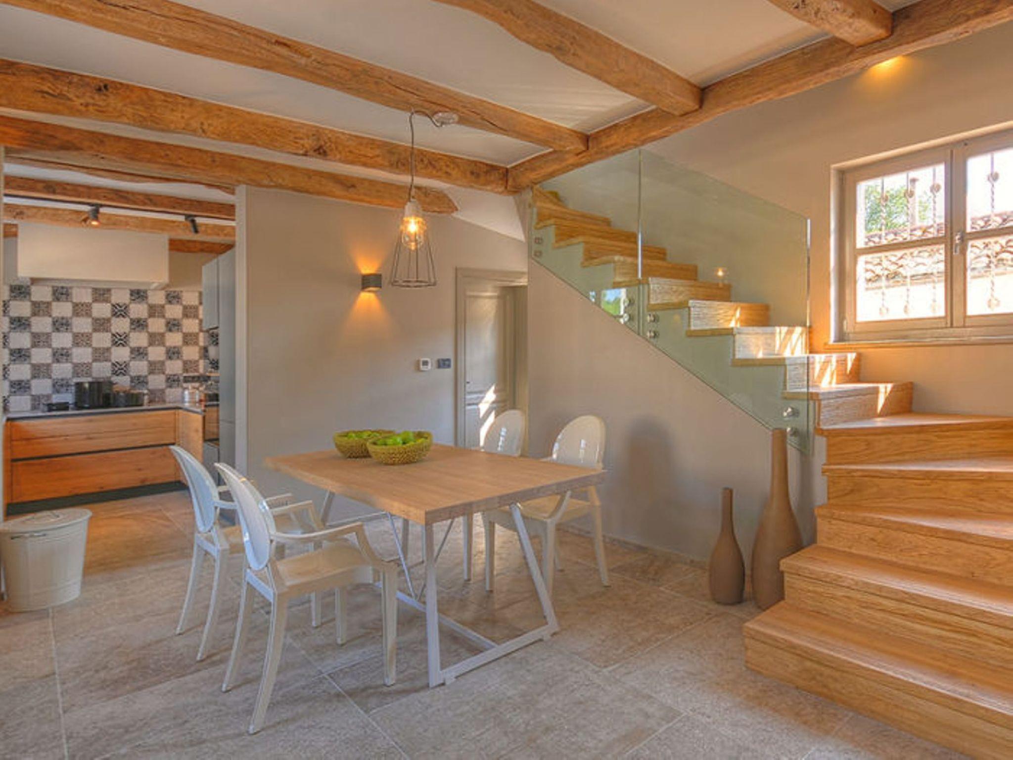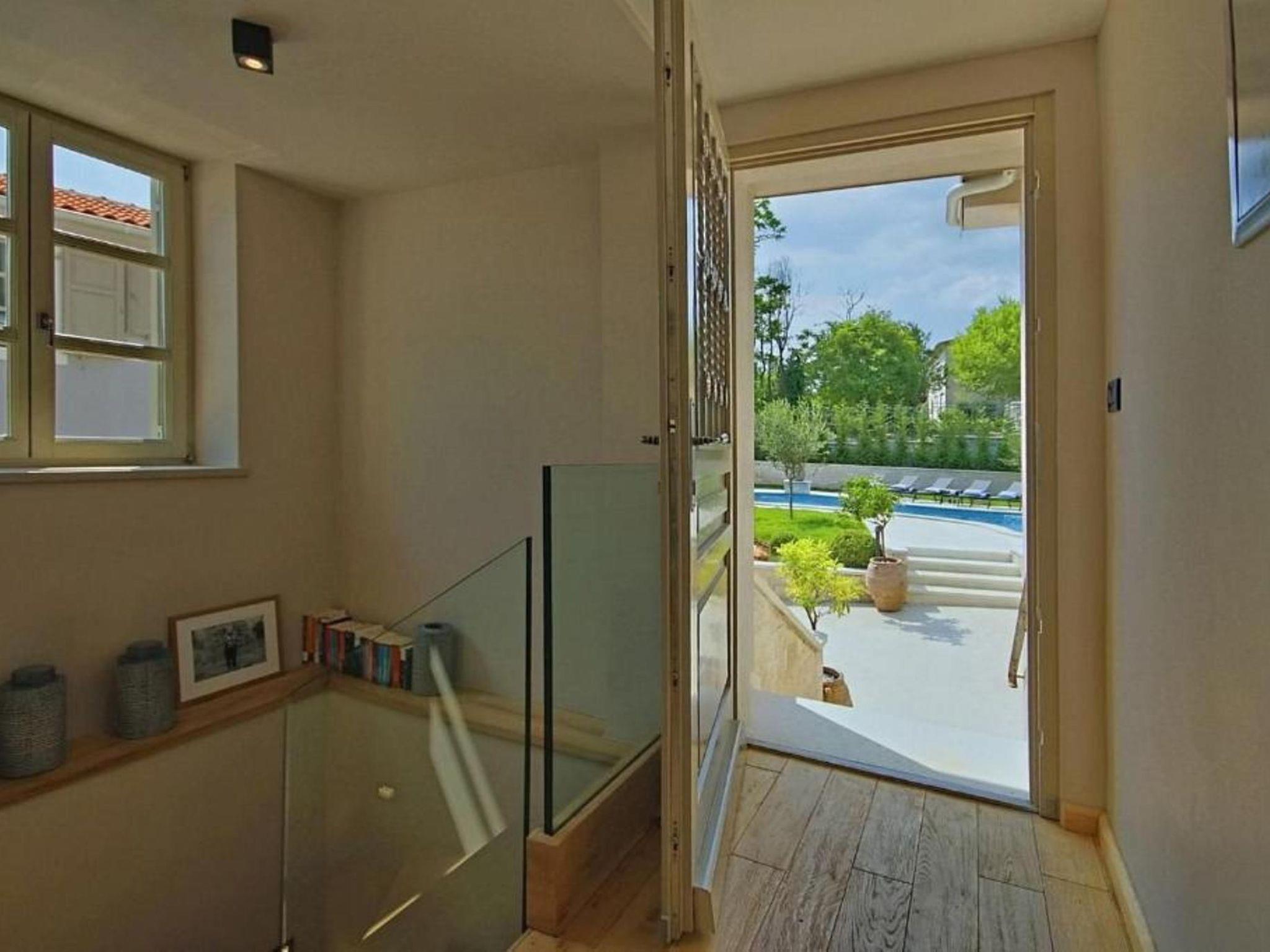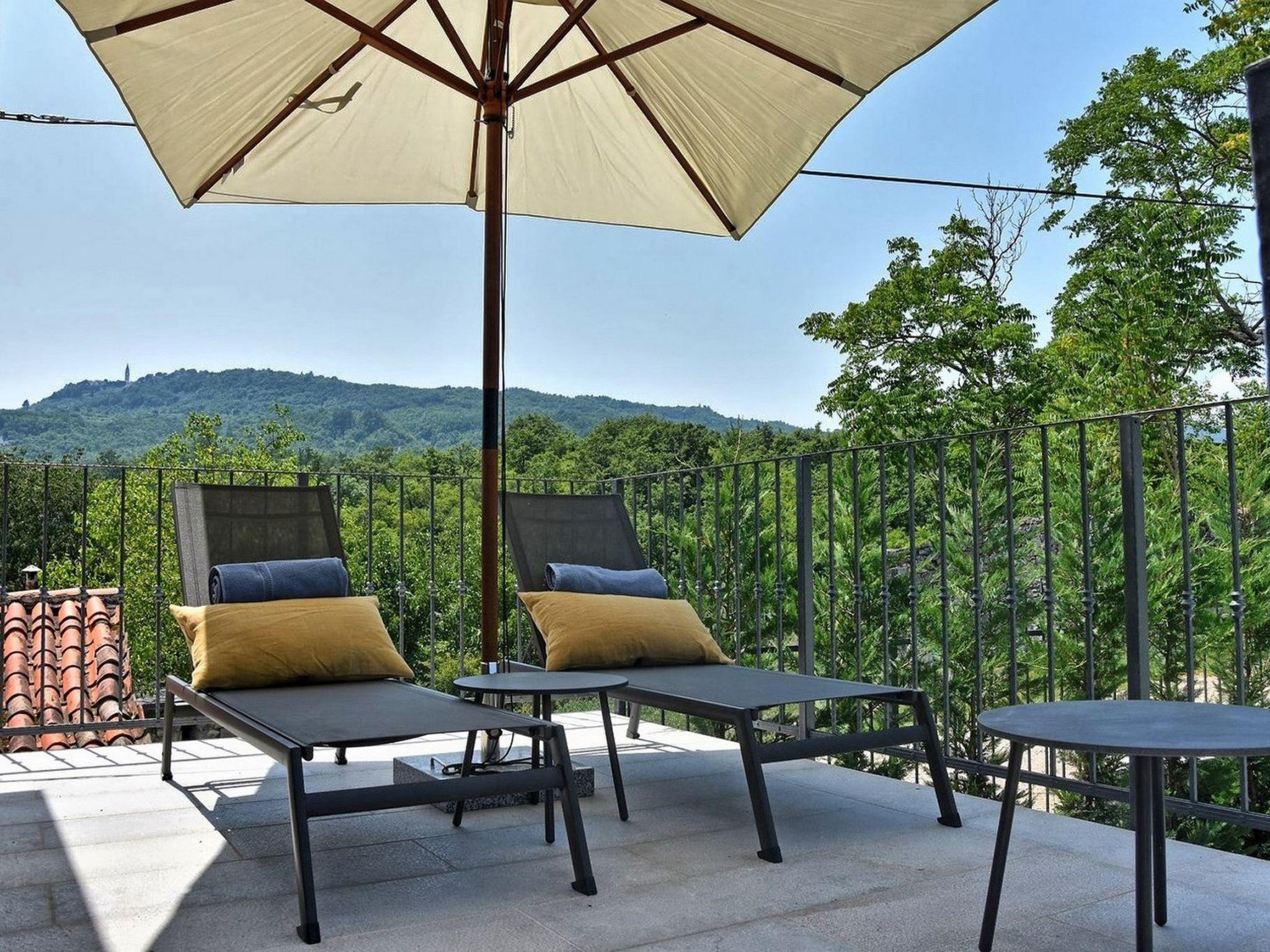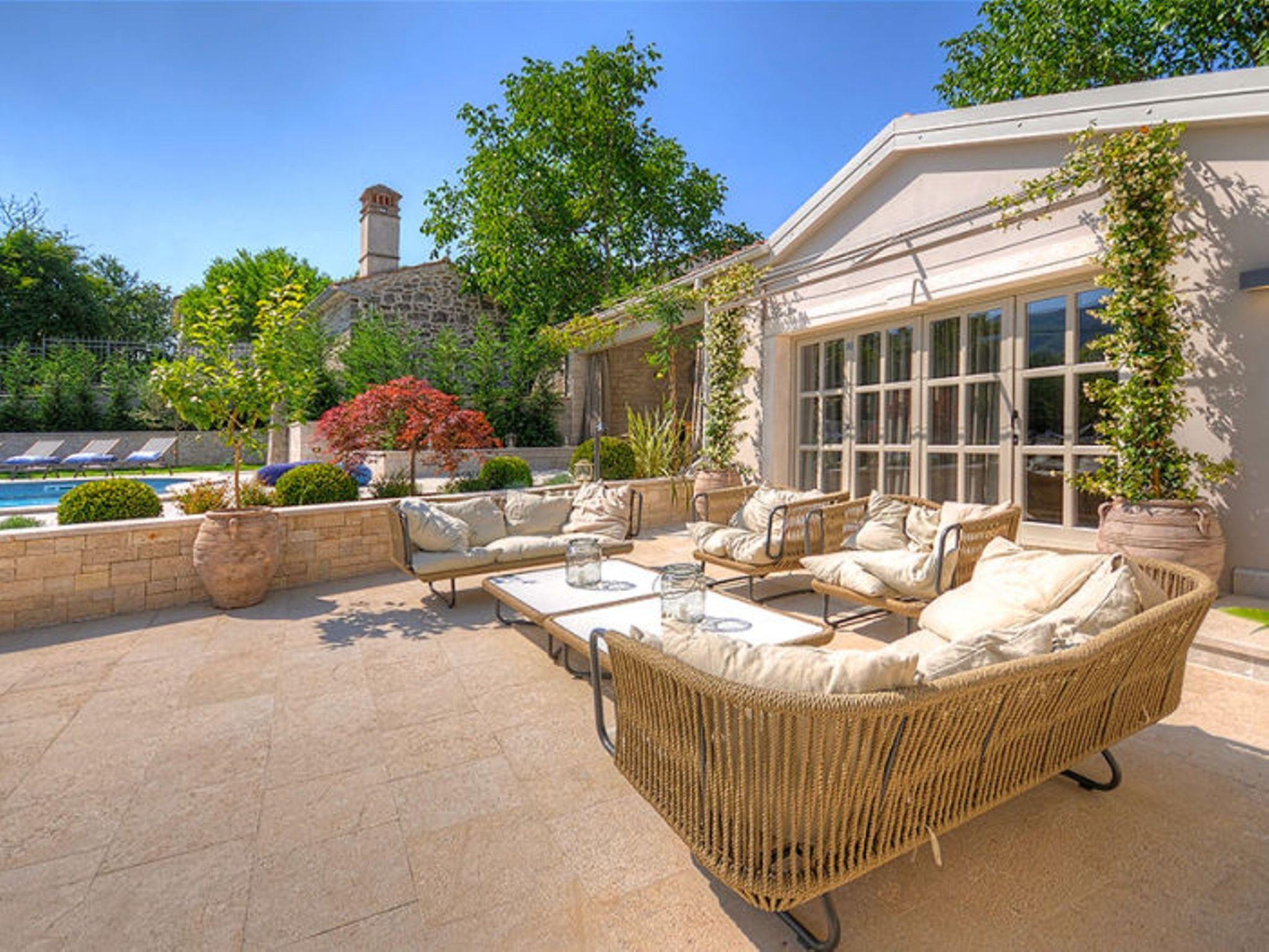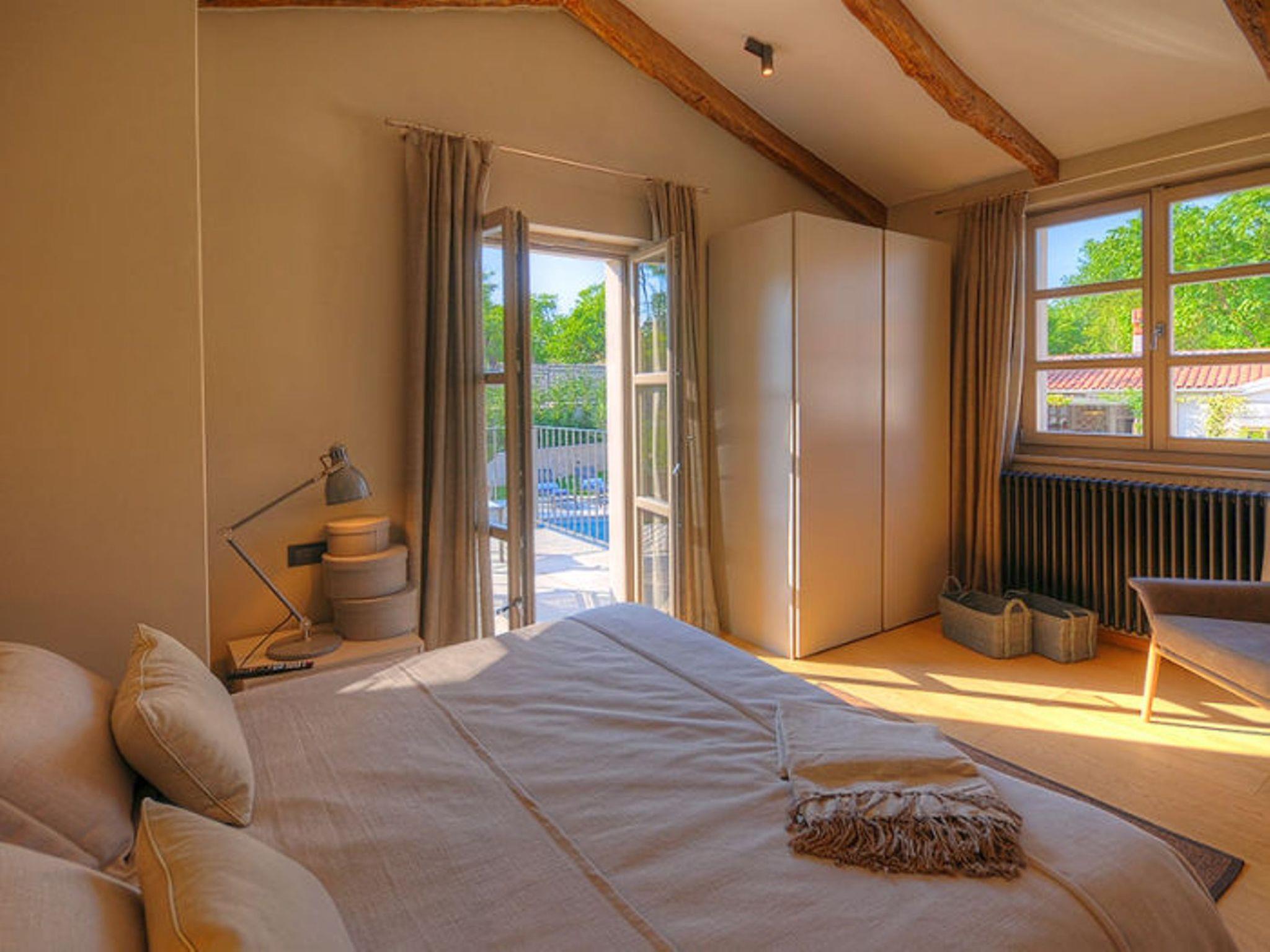 Villa Zita Exclusive is located on the edge of the quiet village of Svici near the town of Pican, about 16.5 km from the sea and 27 km from the tourist resort of Rabac. On a 650 square metre fenced plot, guests of the villa have numerous outdoor facilities at their disposal: Pool of 55 sqm with whirlpool area, counter-current swimming and waterfall, a fully equipped summer kitchen with charcoal and gas grill, bread oven, ice maker, dishwasher, table and chairs for 10 people and a large LCD TV. There is also a large sun terrace with sun loungers and an air-conditioned 50 square metre wellness area with LCD TV, Finnish sauna, shower and WC. Private parking for 4 cars is available on the property.