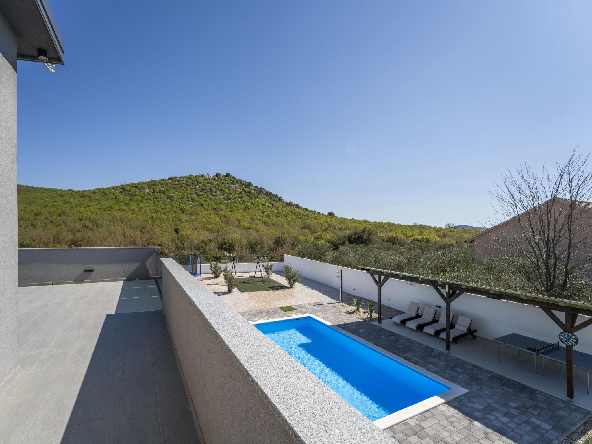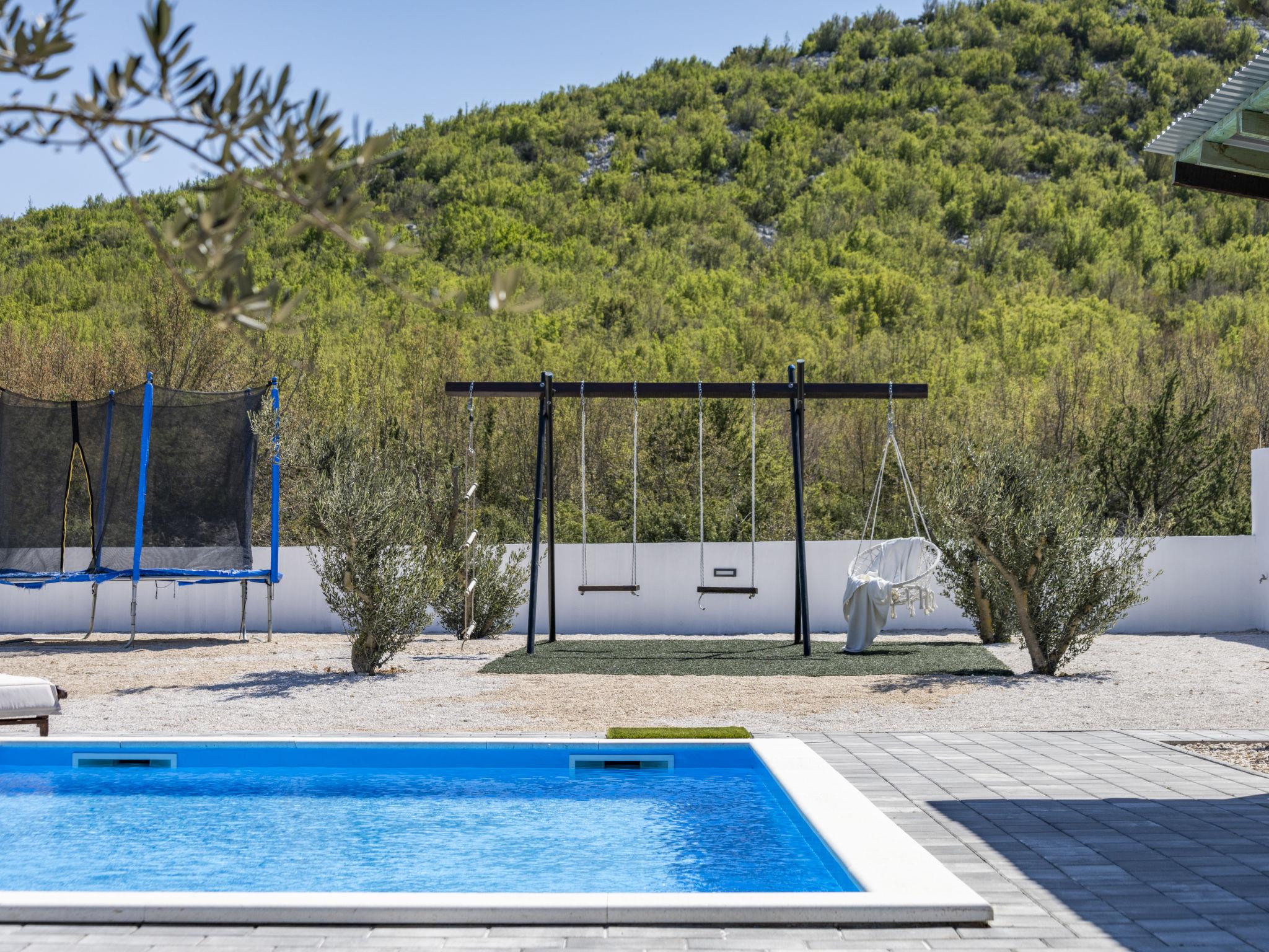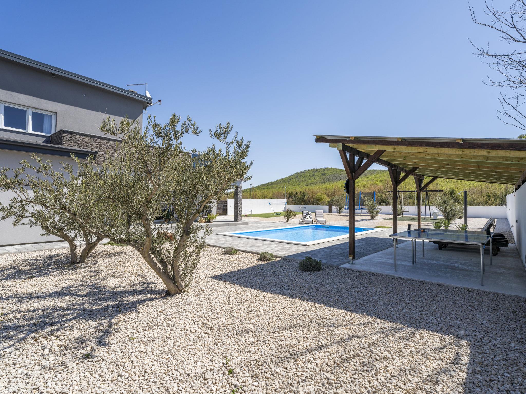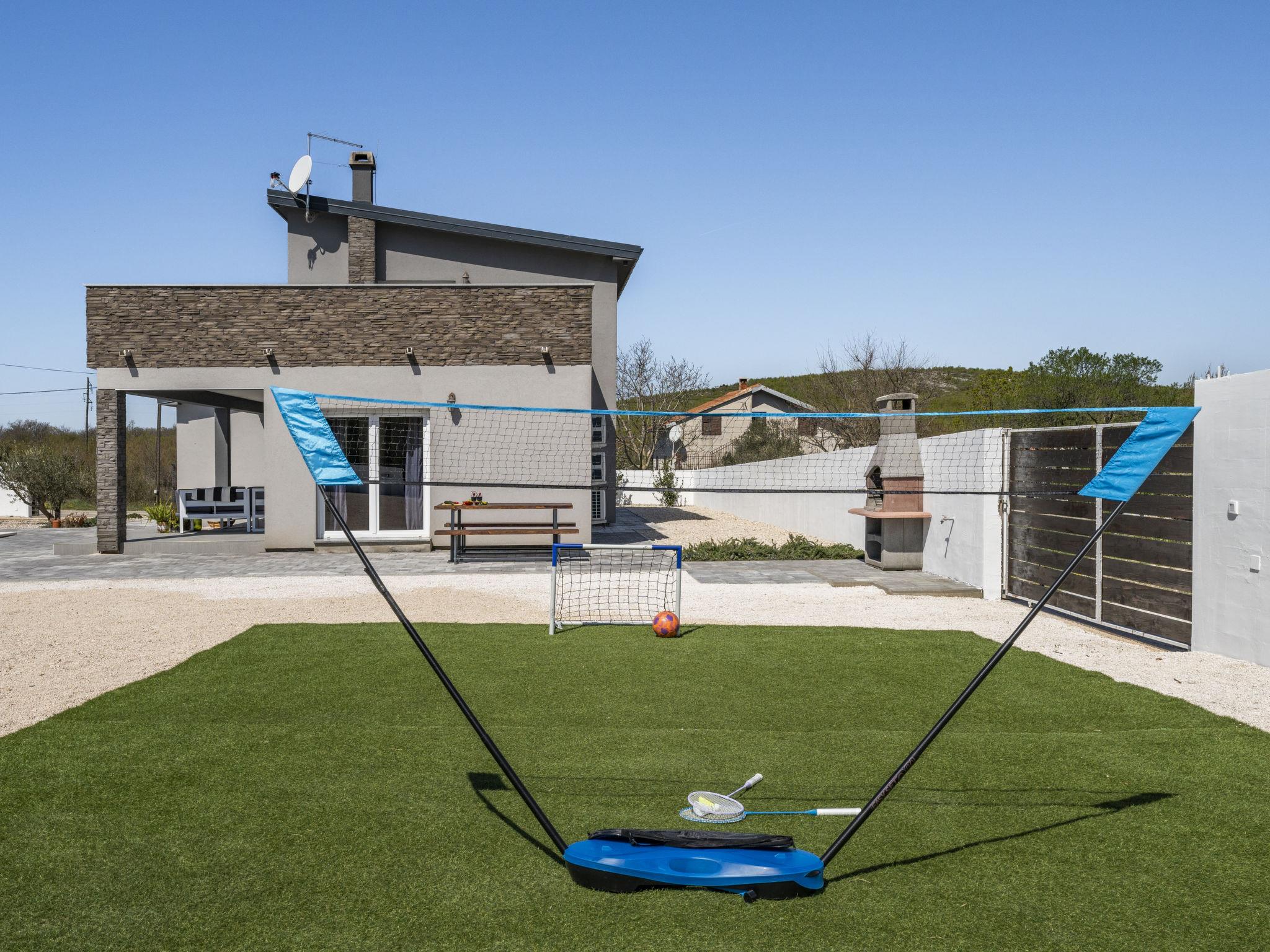 Radašinovci 13 km from Pirovac: Single-family house "Gala". 21 km from the centre of Tisno, 23 km from the centre of Vodice, 20 km from the centre of Biograd na Moru, in a sunny position, 13 km from the sea. Private: property 1'000 m2 (fenced), swimming pool (8 x 4 m, depth 150 cm, seasonal availability: 15.May. - 30.Sep.) with internal staircase. Outdoor shower, table tennis, arbour (20 m2), garden furniture, barbecue, children's playground (swing). In the house: internet access, trampoline, washing machine. Parking (for 4 cars) at the house on the premises. Shop 3 km, restaurant 5 km, bus stop 6.8 km, pebble beach 13 km. Marina 13 km, cycle lane 2 km. Well-known lakes can easily be reached: Vransko jezero 10 km.
