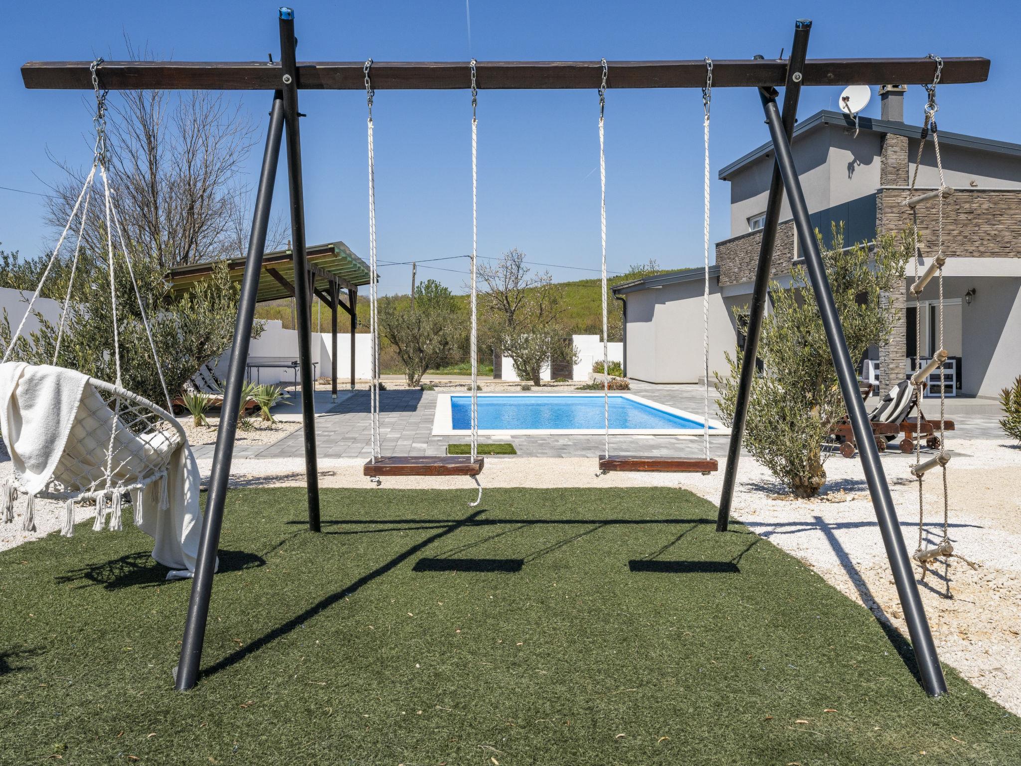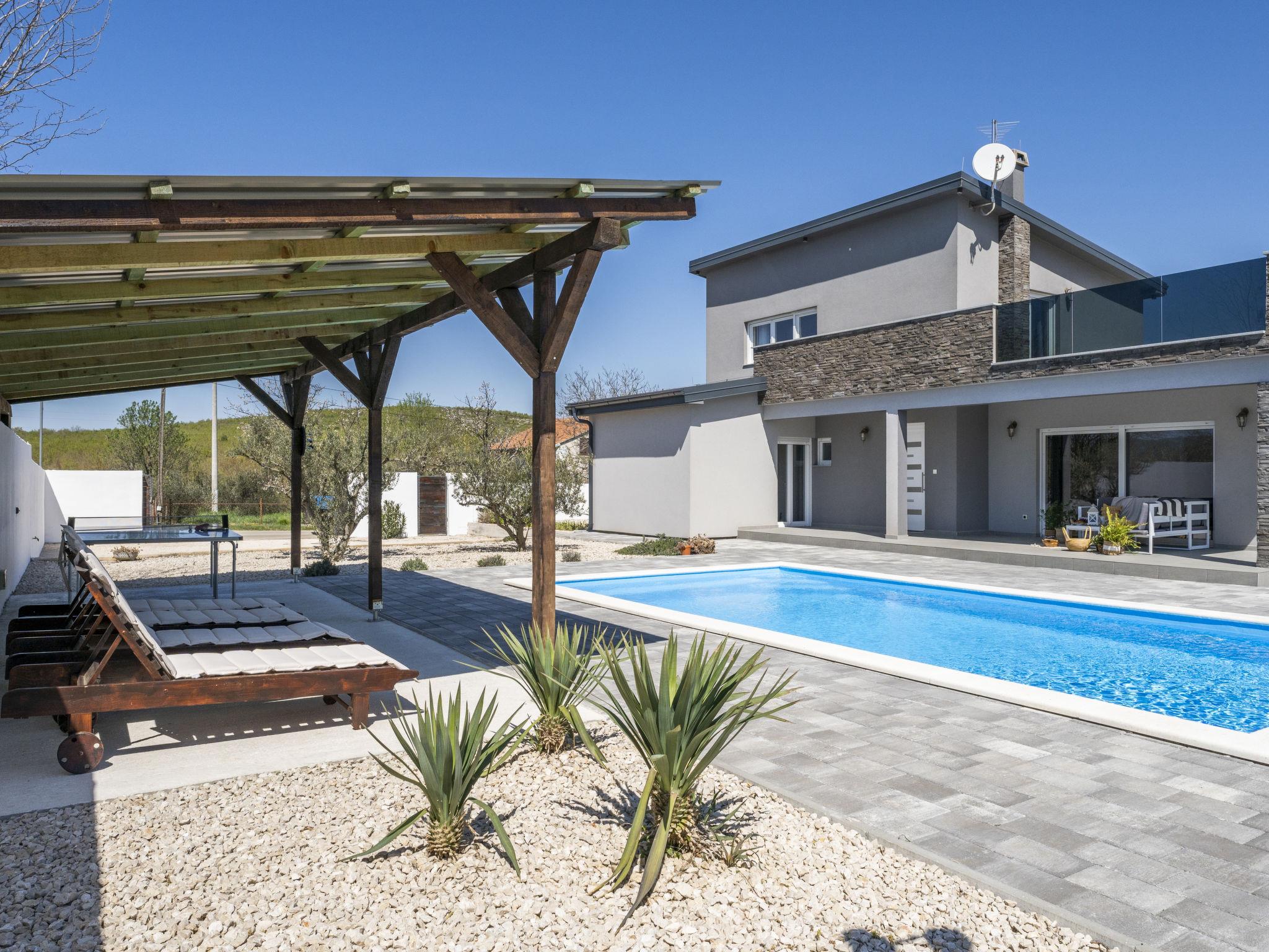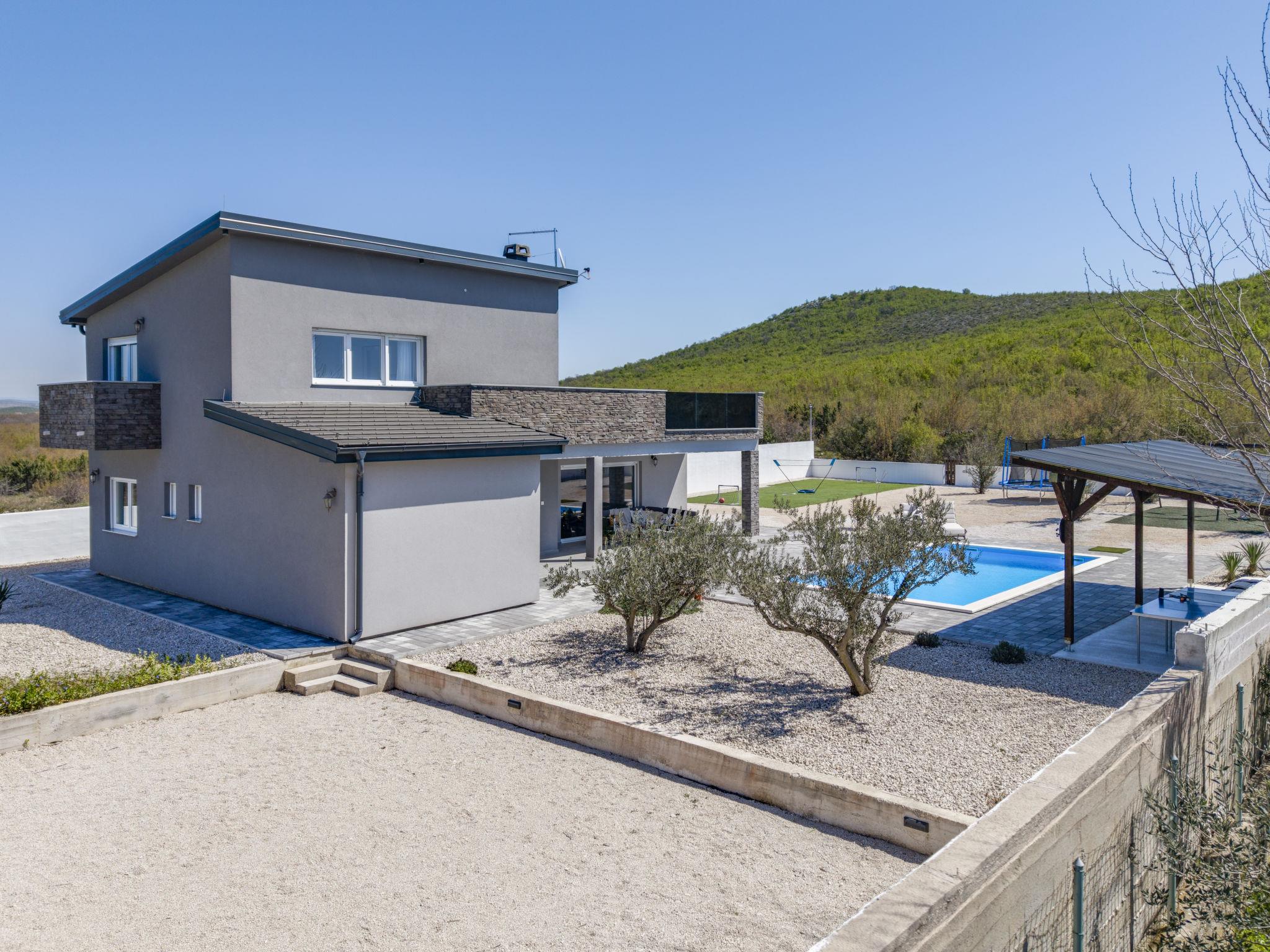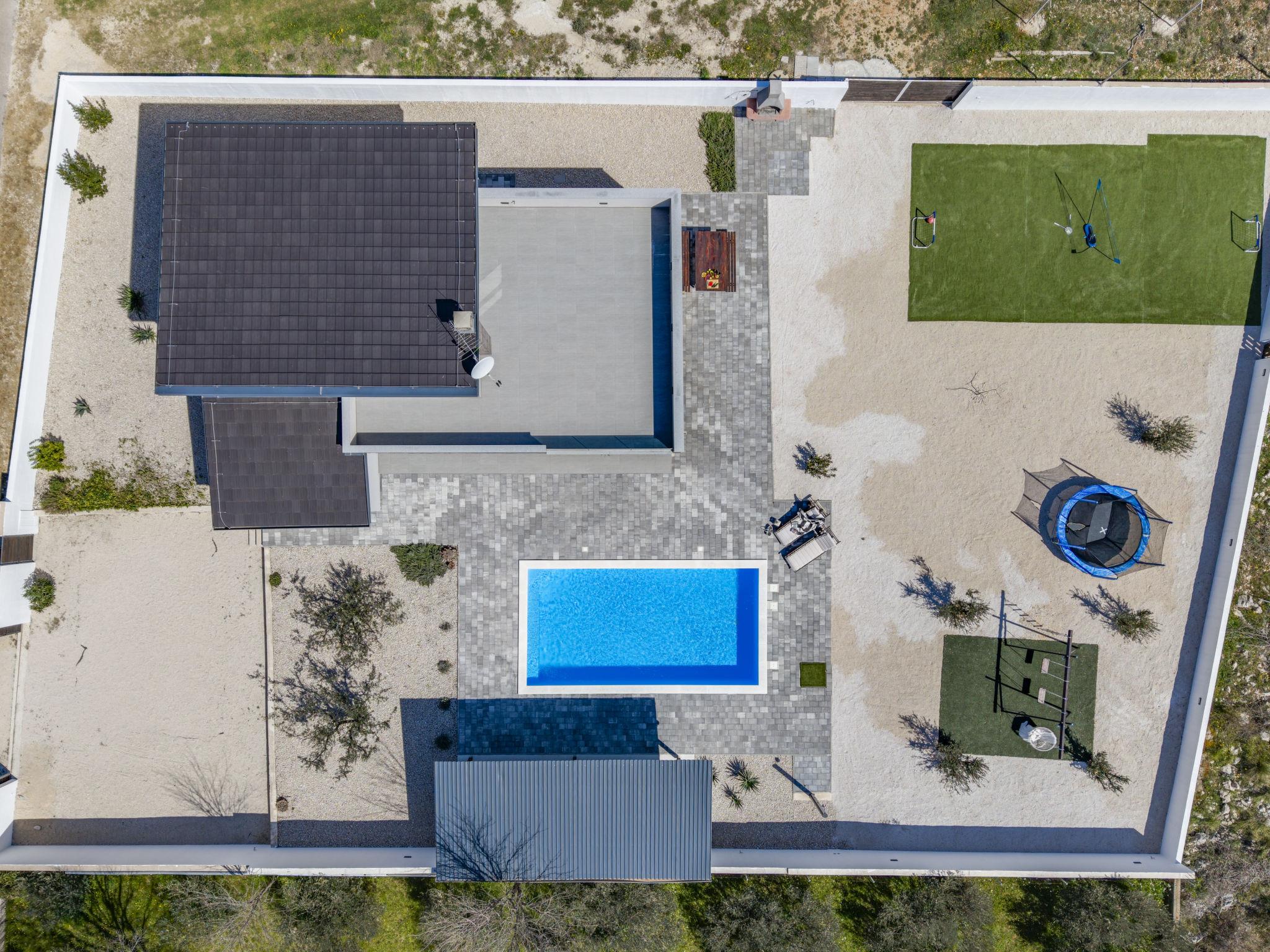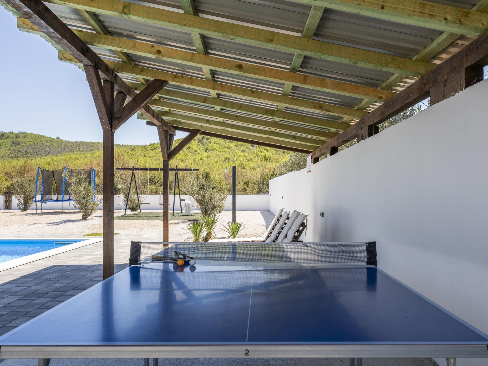 Radašinovci 13 km from Pirovac: Single-family house "Gala". 21 km from the centre of Tisno, 23 km from the centre of Vodice, 20 km from the centre of Biograd na Moru, in a sunny position, 13 km from the sea. Private: property 1'000 m2 (fenced), swimming pool (8 x 4 m, depth 150 cm, seasonal availability: 15.May. - 30.Sep.) with internal staircase. Outdoor shower, table tennis, arbour (20 m2), garden furniture, barbecue, children's playground (swing). In the house: internet access, trampoline, washing machine. Parking (for 4 cars) at the house on the premises. Shop 3 km, restaurant 5 km, bus stop 6.8 km, pebble beach 13 km. Marina 13 km, cycle lane 2 km. Well-known lakes can easily be reached: Vransko jezero 10 km.
