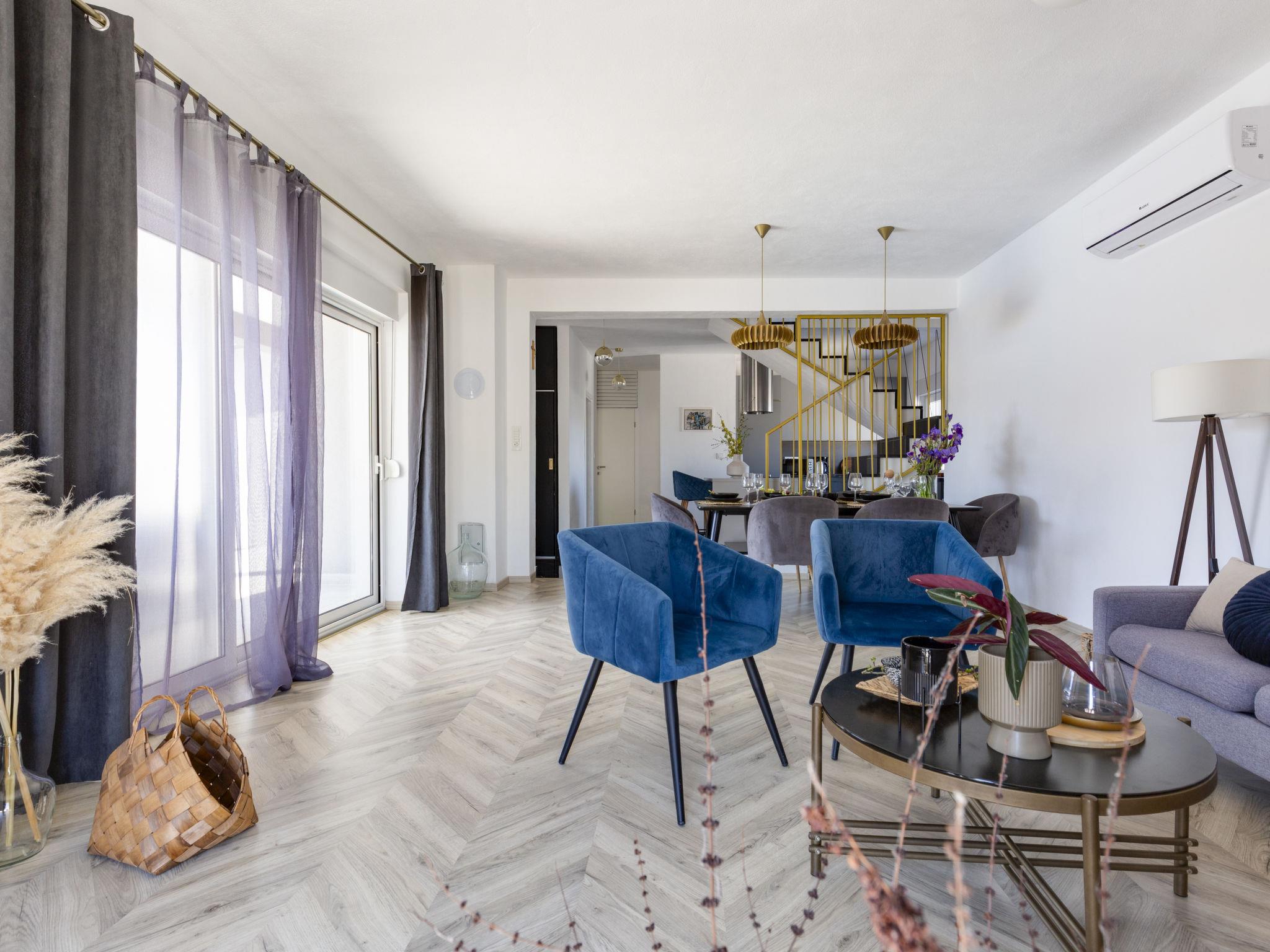 5-room villa 126 m2 on 2 levels, south-west facing position. Luxurious furnishings: living/dining room 30 m2 with satellite TV (flat screen), air conditioning. Exit to the terrace. 1 room with 1 french bed (160 cm, length 200 cm), shower/WC and air conditioning. Exit to the terrace. 1 room with 1 french bed (160 cm, length 200 cm), shower/WC and air conditioning. Open kitchen (oven, dishwasher, 2 ceramic glass hob hotplates, 2 gas rings, kettle, microwave, freezer, electric coffee machine). Sep. WC. Upper floor: 1 room with 1 french bed (160 cm, length 200 cm), hip bath and air conditioning. 1 room with 1 french bed (160 cm, length 200 cm), air conditioning. Exit to the balcony. Shower/WC. Forced-air heating. Small balcony 2 m2, terrace 20 m2 partly roofed, terrace 35 m2. Terrace furniture, deck chairs (6). View of the swimming pool. Facilities: children's high chair, baby cot, hair dryer. Internet (WiFi, free). Maximum 2 pets/ dogs allowed.