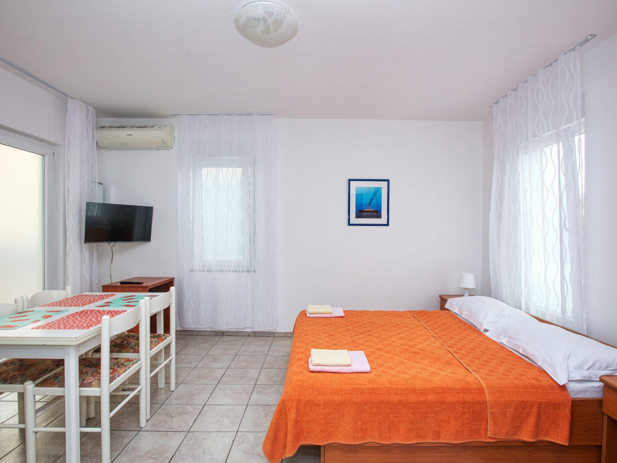 Studio bietet Platz für 2 Gäste. Die Betten sind in Schlafzimmern, die es 1 gibt, innerhalb einer Gesamtfläche von 24m2, angeordnet. Die Gäste haben eine eigene Terrasse zur Verfügung, auf der sie in warmen Sommernächten genießen können. Es ist erlaubt, Speisen auf dem Gemeinschafts-Grill vorzubereiten. IM PREIS INBEGRIFFEN: Kurtaxe, Endreinigung, Klimatisierung, Parkplatz, Internet, Fahrrad, Kinderbett, Bügeleisen, Bügelbrett, Föhn. VERBINDLICHE ZUSÄTZLICHE KOSTEN: Aufzahlung für Kurzaufenthalte (prozentualer Zuschlag pro Nächtigungsanzahl: 30% - 1, 20% - 2, 10% - 3). UNVERBINDLICHE ZUSÄTZLICHE KOSTEN: Zusatzbett (6,00 € pro Nacht). Die Verfügbarkeit zusätzlicher Dienstleistungen in Ihrem reservierten Termin und die Preise derselben (falls nicht aufgeführt) müssen im Voraus überprüft werden. Zusätzliche Dienstleistungen die in der Zahlungsaufforderung nicht aufgeführt sind werden direkt beim Vermieter bezahlt, angenommen der Gast nutzt auch diese. Ermäßigung auf den Grundpreis: Gratistag 14=13 (bei einem Aufenthalt von 14 Tagen oder mehr erhalten Sie einen Gratistag für den Aufenthalt bis 31.12.26).
