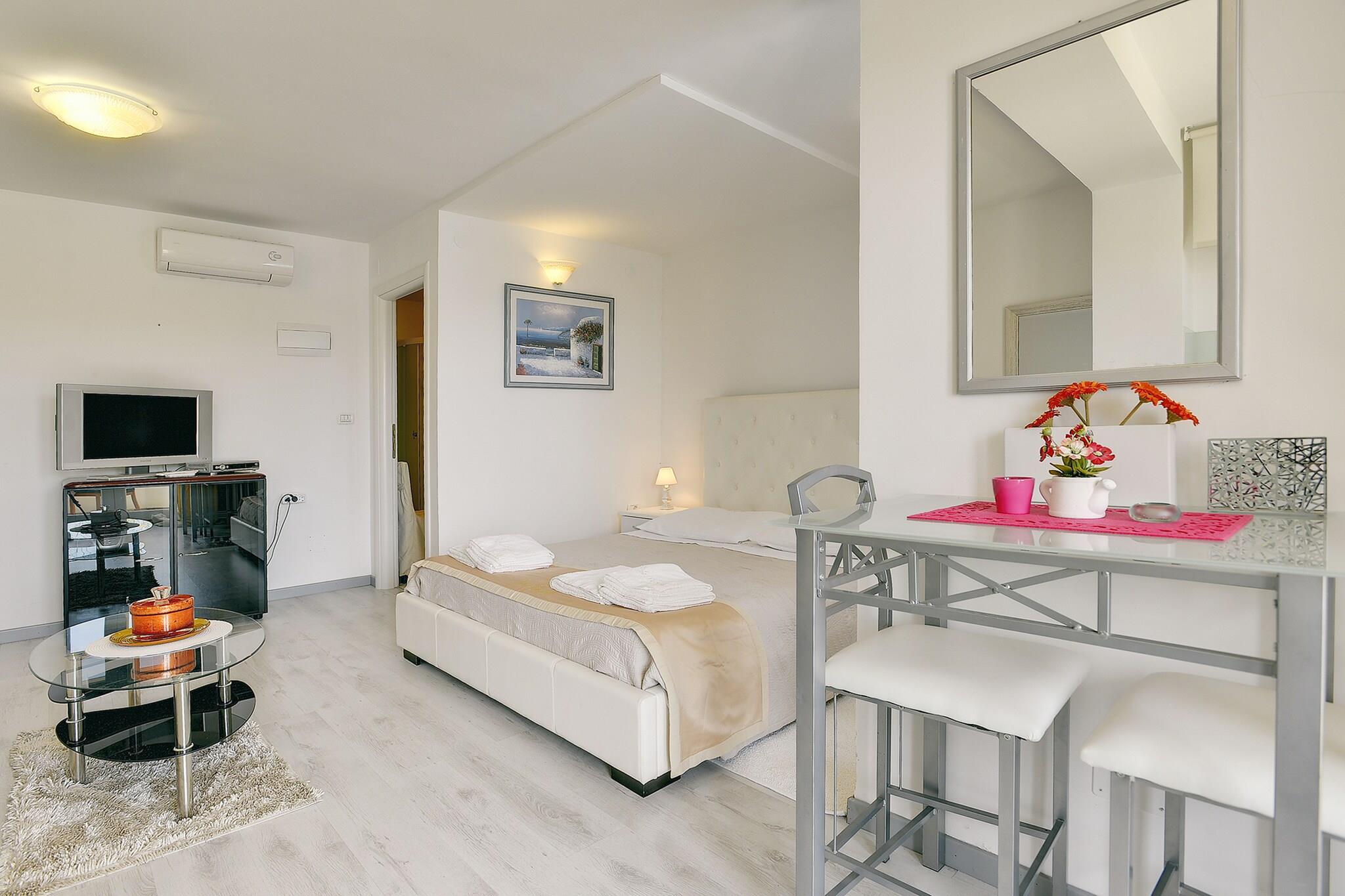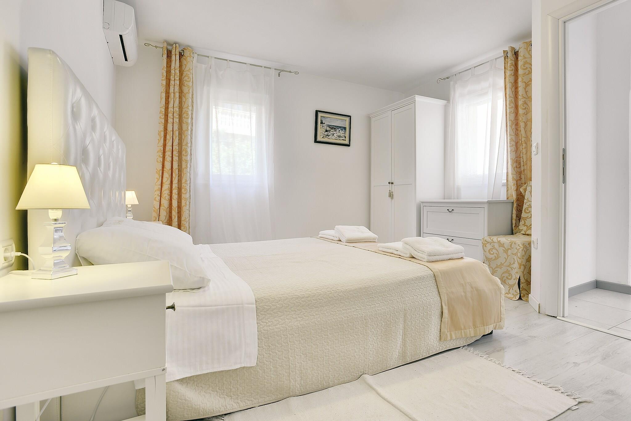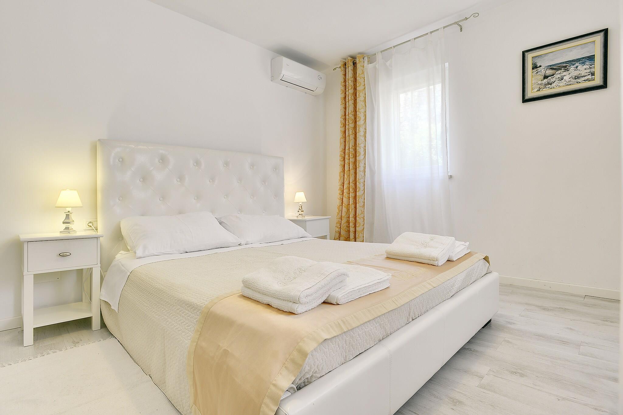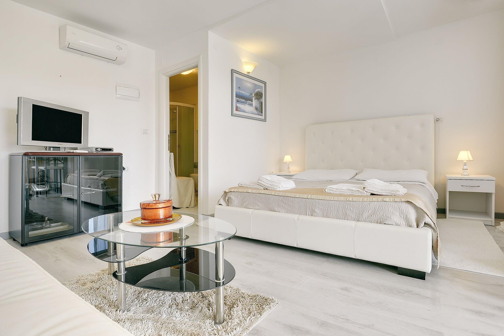 Hvilken fantastisk beliggenhed! Du vil gerne bo her permanent! Fra terrassen ser du ud over havet, det er kun få skridt til stranden, havet er kun 40 meter væk. Har du lyst til at svømme i havet? Der er også en swimmingpool, hvor du kan køle ned. Haven har en grill og et sommer køkken. Villaen består af tre etager, der er plads til syv personer. Der er tre soveværelser og tre badeværelser. Alle værelser har aircondition. Villa Bonelli ligger i nærheden af Pula. Det historiske centrum af Pula har flere meget interessante monumenter som amfiteateret og der er nogle gode restauranter og butikker. Derudover anbefales byer som Porec (51 km) og Rovinj (30 km), og en cykeltur gennem Istriens smukke interiør bør bestemt ikke springes over.