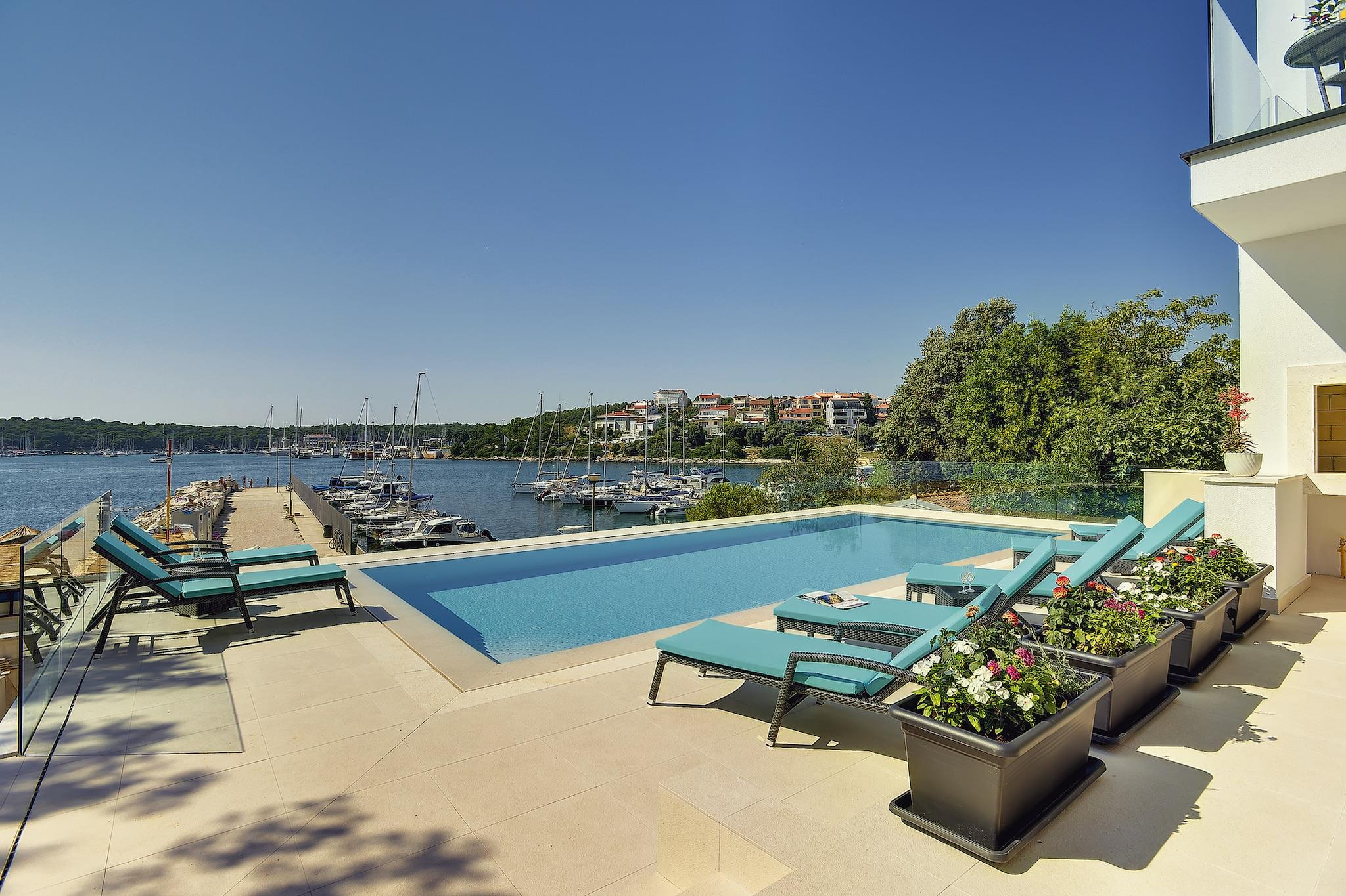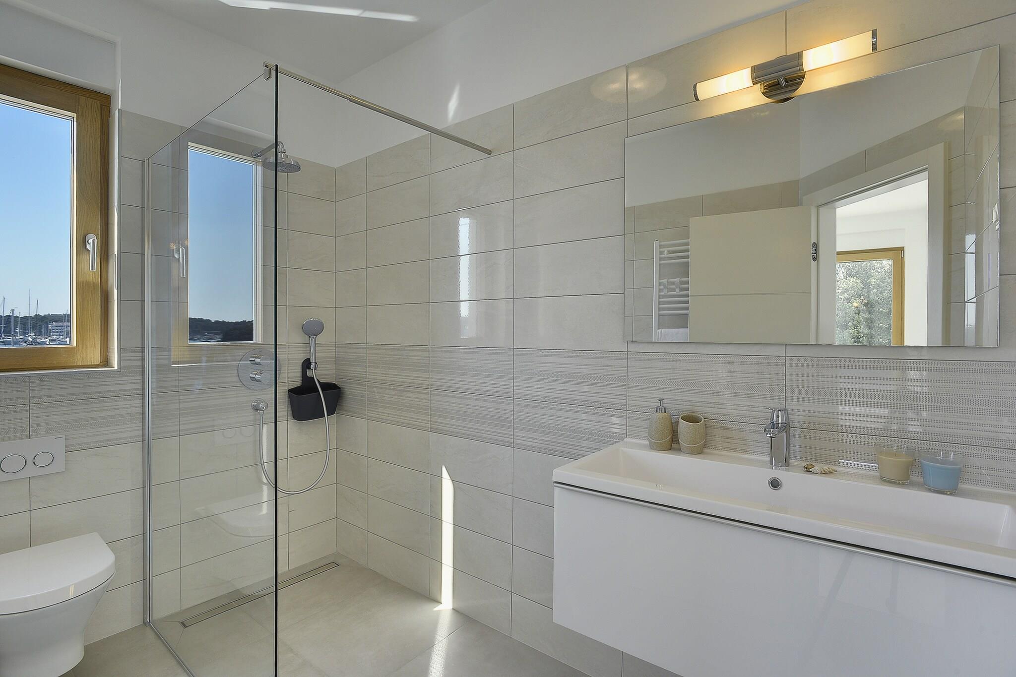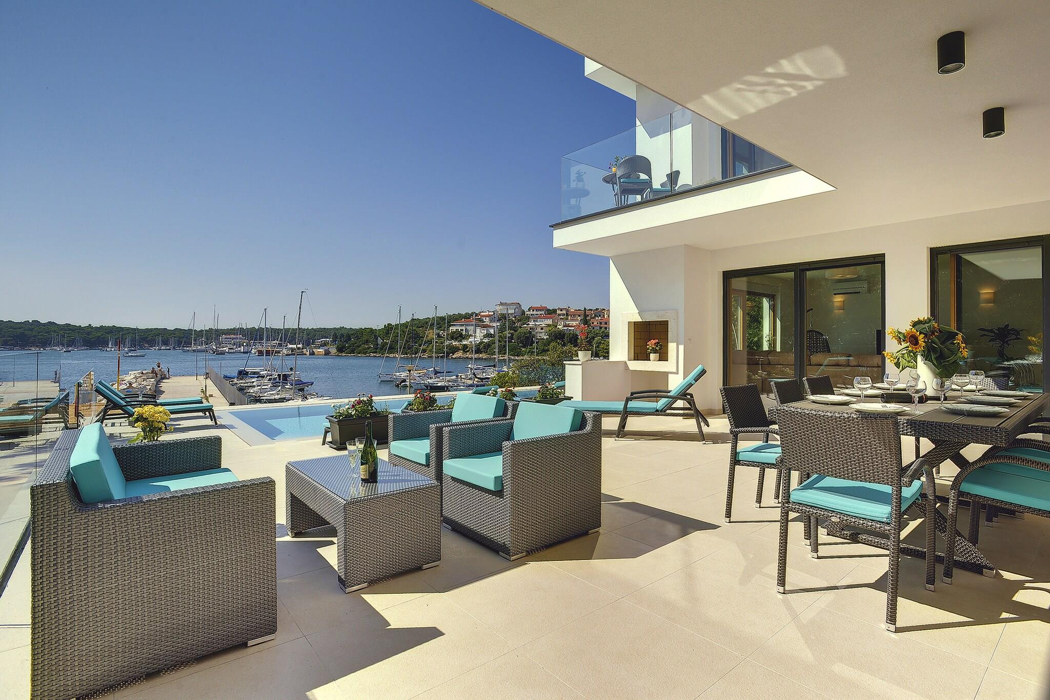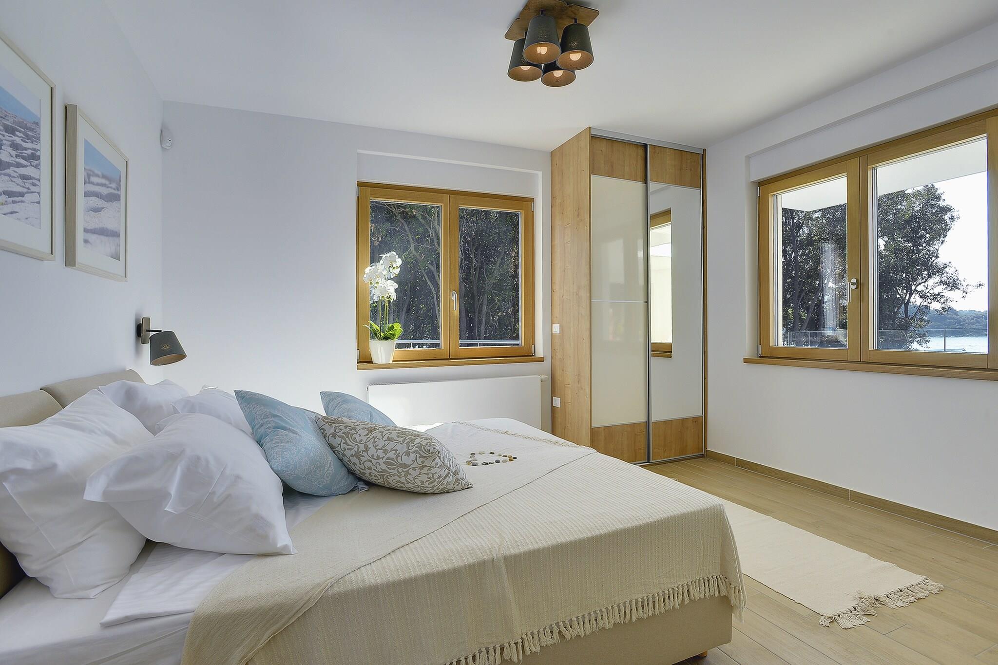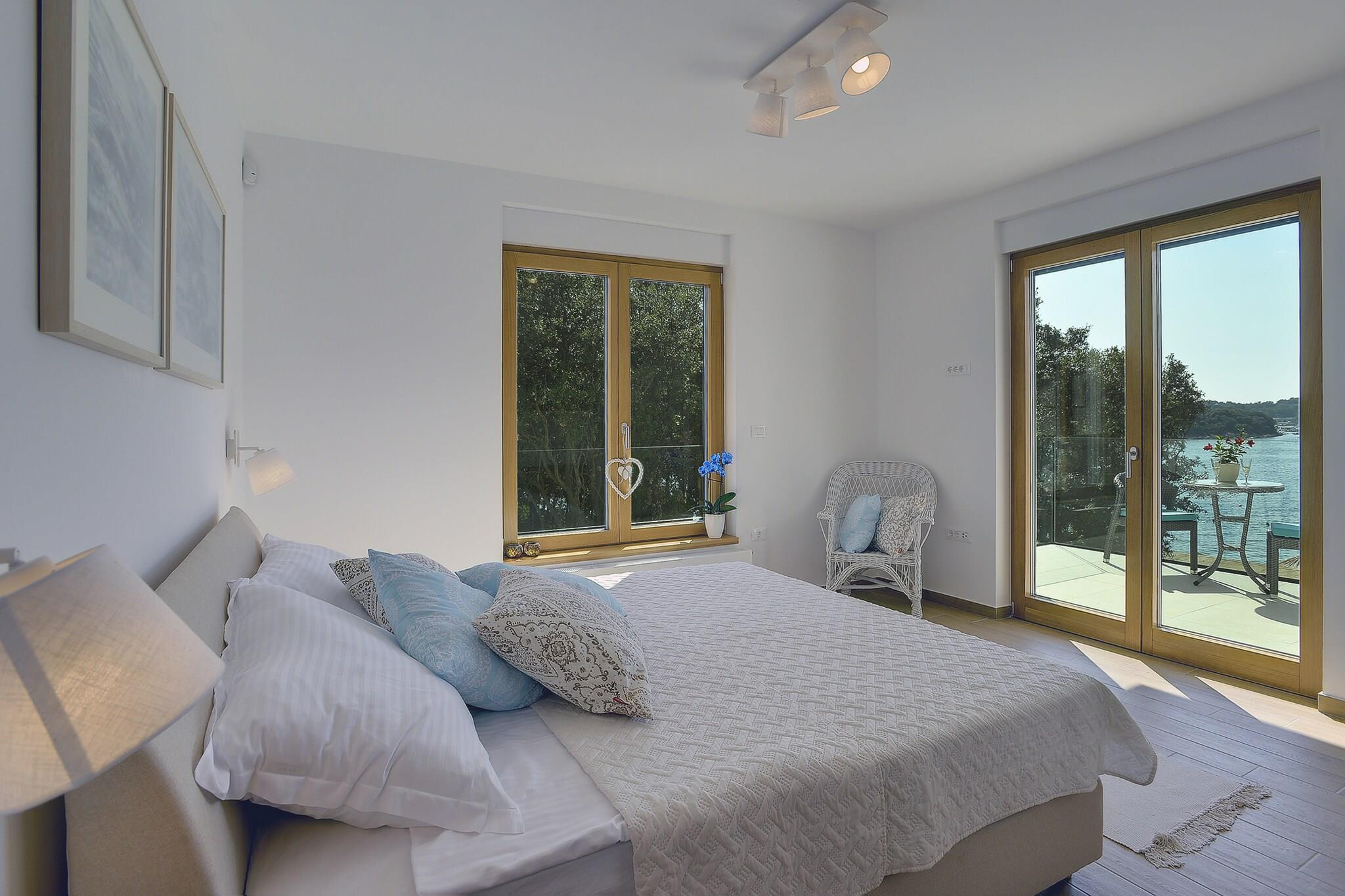 Sikke en udsigt! Denne luksusvilla med privat badestrand er beliggende i den sydlige del af Istrien, i landsbyen Pješcana Uvala. Der er et supermarked og nogle restauranter i umiddelbar nærhed. Centrum af den historiske by Pula ligger kun 10 minutters kørsel derfra. Din villa ligger på lukket grund, som har en swimmingpool med hydromassage, en solterrasse med liggestole og en overdækket terrasse med spisebord og grill. Interiøret er moderne og komfortabelt med mange blå og maritime tema tilbehør hele vejen igennem. I stueetagen finder du en stue med åbent køkken og adgang til terrassen samt en soveværelse med en-suite badeværelse. På første sal finder du yderligere tre soveværelser med eget badeværelse og balkon. Dette er et godt sted at sidde og nyde din morgenkaffe mens du beundrer den fantastiske udsigt! In the periods from 04/04 until 31/10, it's possible to have the pool heated upon request for an additional fee of EURO 250 per week.