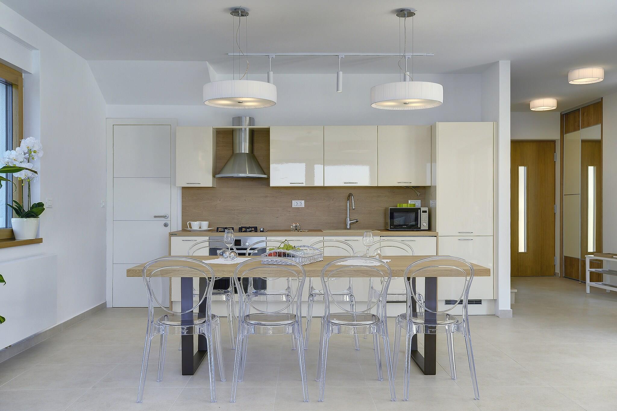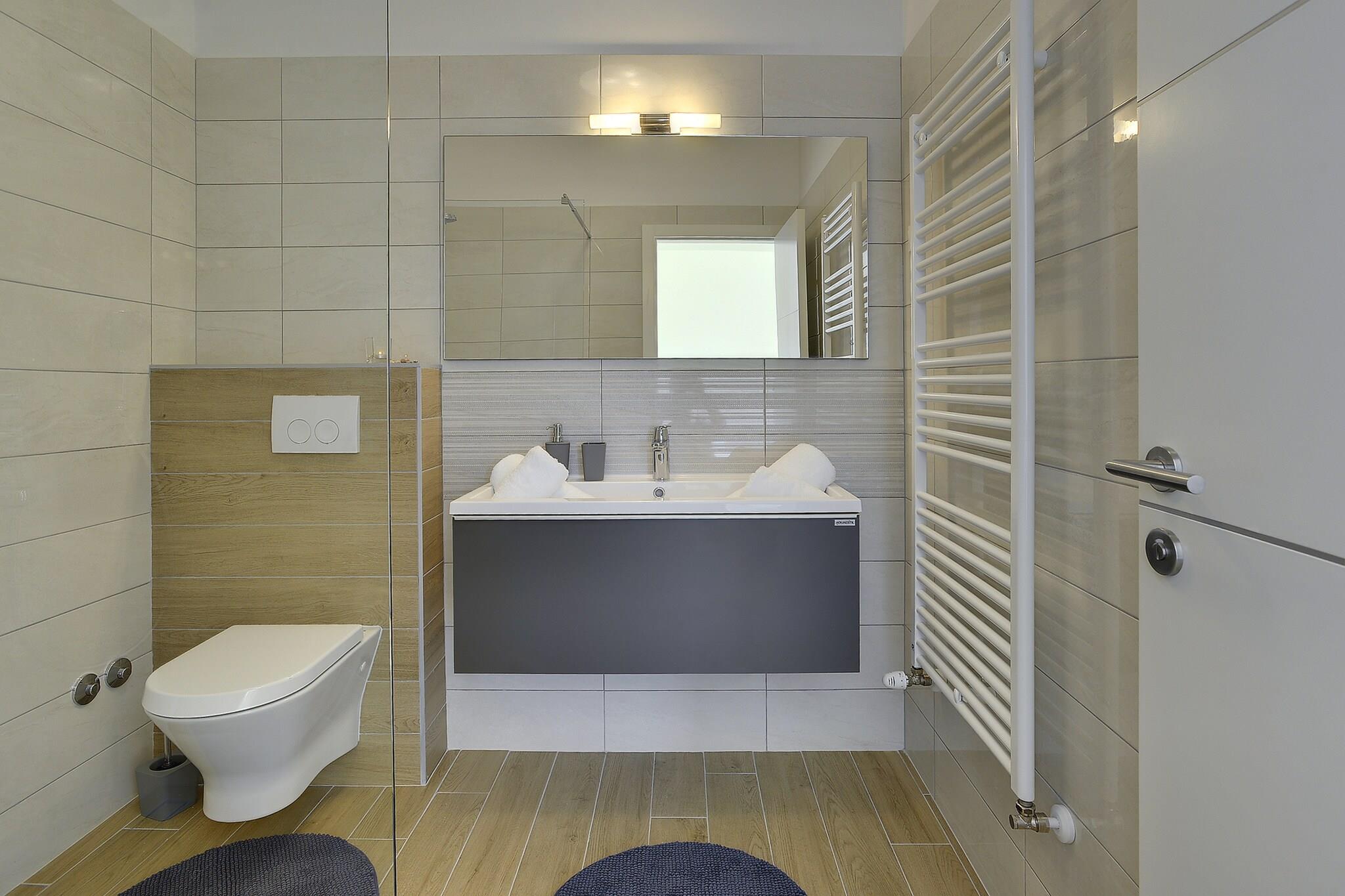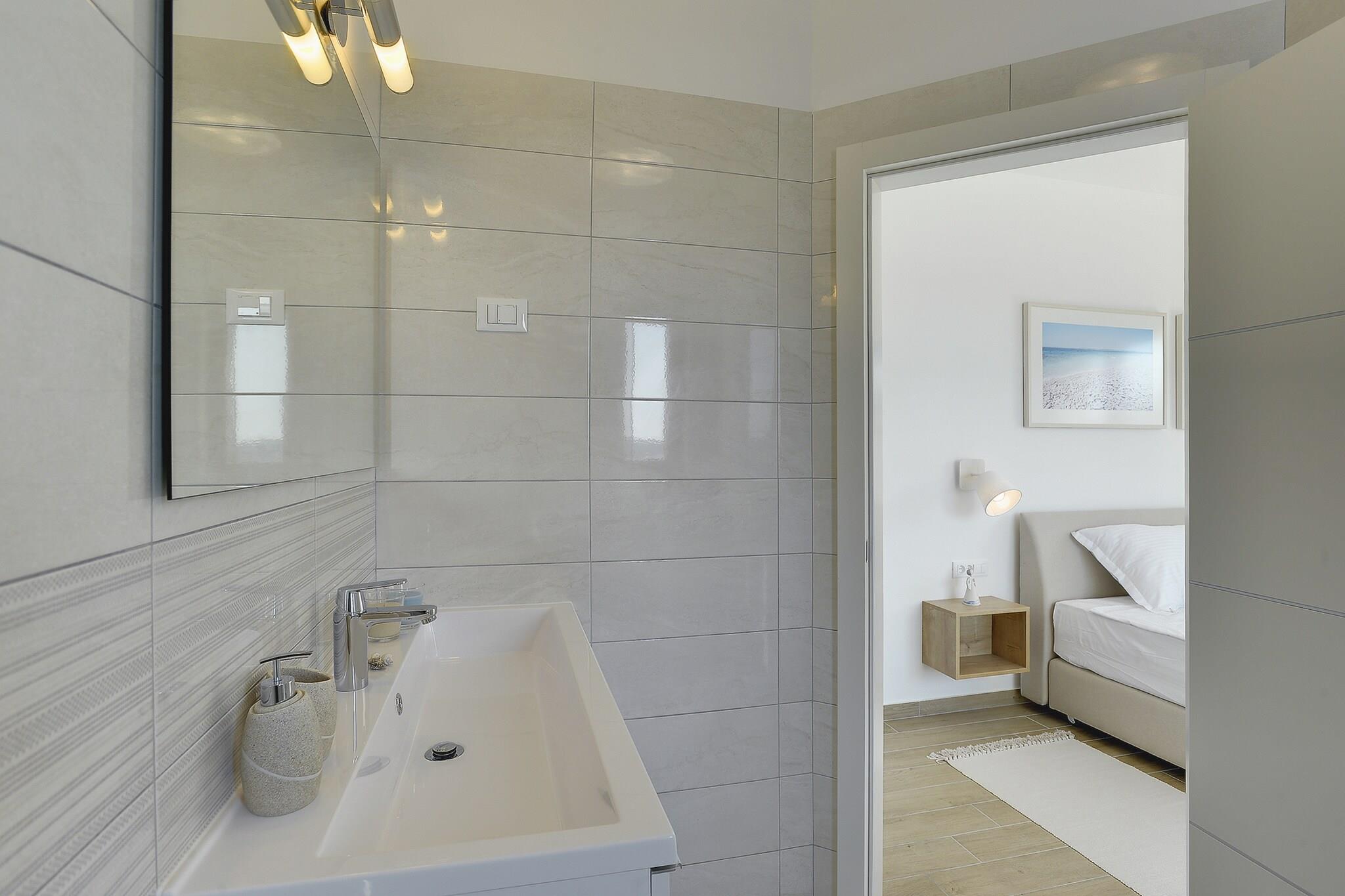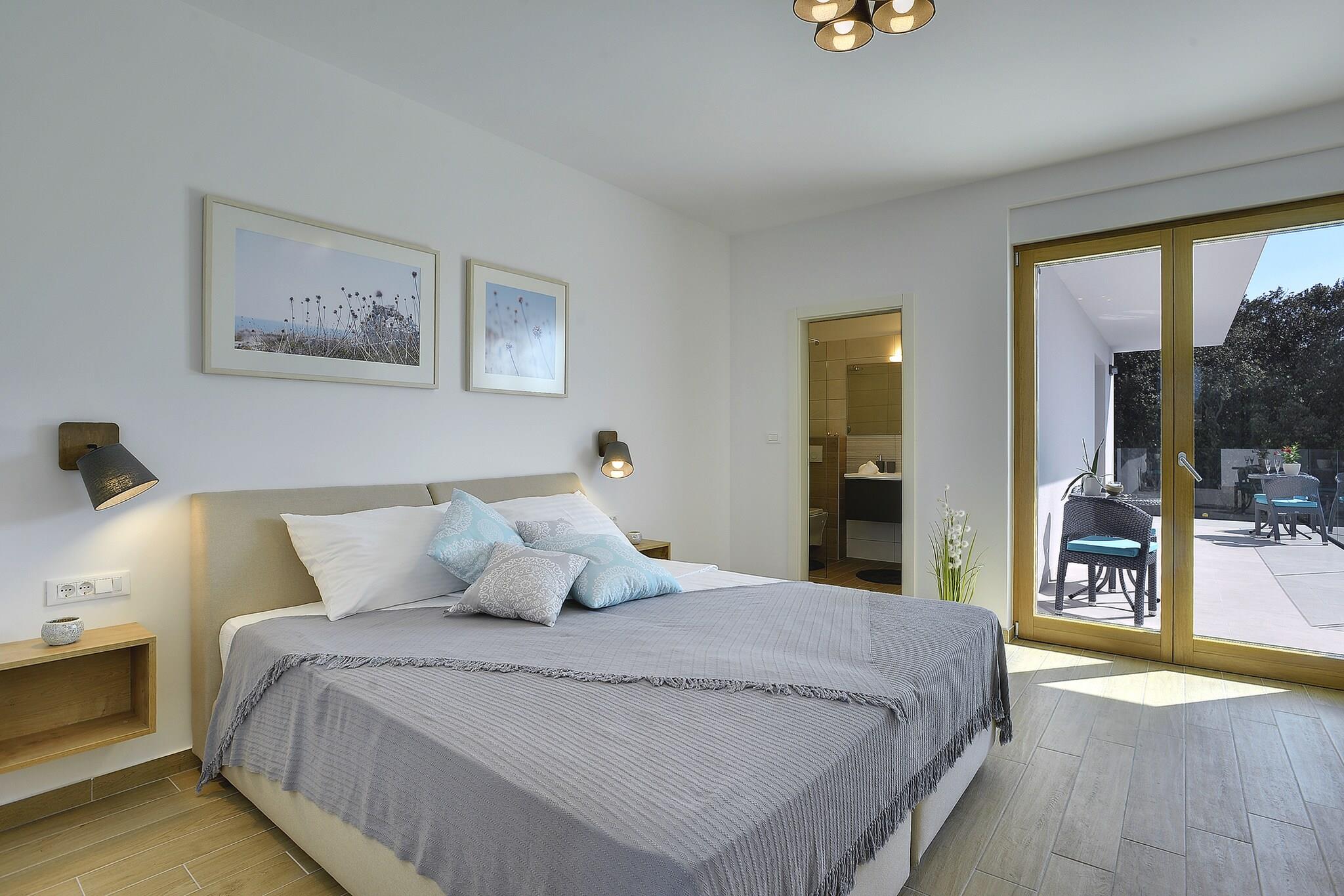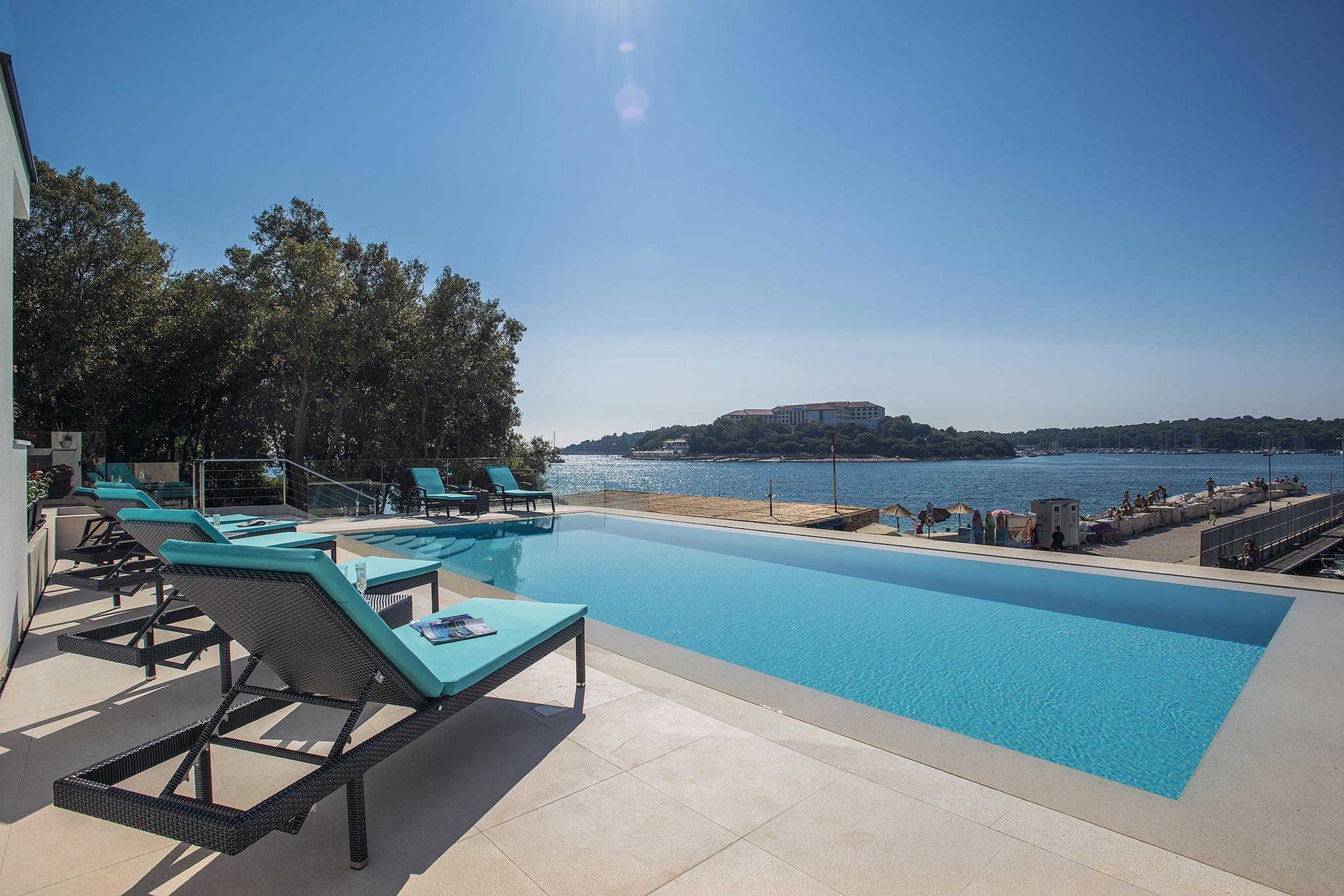 Sikke en udsigt! Denne luksusvilla med privat badestrand er beliggende i den sydlige del af Istrien, i landsbyen Pješcana Uvala. Der er et supermarked og nogle restauranter i umiddelbar nærhed. Centrum af den historiske by Pula ligger kun 10 minutters kørsel derfra. Din villa ligger på lukket grund, som har en swimmingpool med hydromassage, en solterrasse med liggestole og en overdækket terrasse med spisebord og grill. Interiøret er moderne og komfortabelt med mange blå og maritime tema tilbehør hele vejen igennem. I stueetagen finder du en stue med åbent køkken og adgang til terrassen samt en soveværelse med en-suite badeværelse. På første sal finder du yderligere tre soveværelser med eget badeværelse og balkon. Dette er et godt sted at sidde og nyde din morgenkaffe mens du beundrer den fantastiske udsigt! In the periods from 04/04 until 31/10, it's possible to have the pool heated upon request for an additional fee of EURO 250 per week.