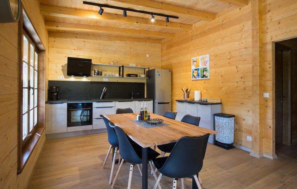 Indenfor finder du masser af smukt træinteriør kombineret med moderne møbler af høj kvalitet. Køkkenet, stuen og spiseområderne er alle i et rum og muliggør således en dejlig, åben atmosfære og en masse fællesskab.