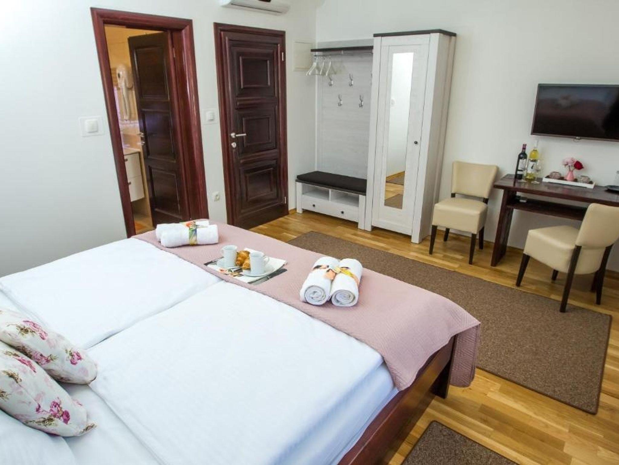 Zimmer bietet Platz für 2 Gäste. Die Betten sind in Schlafzimmern, die es 1 gibt, innerhalb einer Gesamtfläche von 21m2, angeordnet. Die reservierte Unterkunftseinheit hat keinen Balkon und keine Terrasse. Die reservierte Unterkunftseinheit ist ein Zimmer mit eigenem Badezimmer ohne die Möglichkeit der Nutzung einer Küche. IM PREIS INBEGRIFFEN: Kurtaxe, Endreinigung, Klimatisierung, Zentralheizung, Parkplatz, Internet, Föhn. UNVERBINDLICHE ZUSÄTZLICHE KOSTEN: Frühstück (10,00 €, 50% Nachlass für Kinder zwischen 4 und 12 Jahren, Kinder bis 4 Jahre sind frei.). Die Verfügbarkeit zusätzlicher Dienstleistungen in Ihrem reservierten Termin und die Preise derselben (falls nicht aufgeführt) müssen im Voraus überprüft werden. Zusätzliche Dienstleistungen die in der Zahlungsaufforderung nicht aufgeführt sind werden direkt beim Vermieter bezahlt, angenommen der Gast nutzt auch diese.