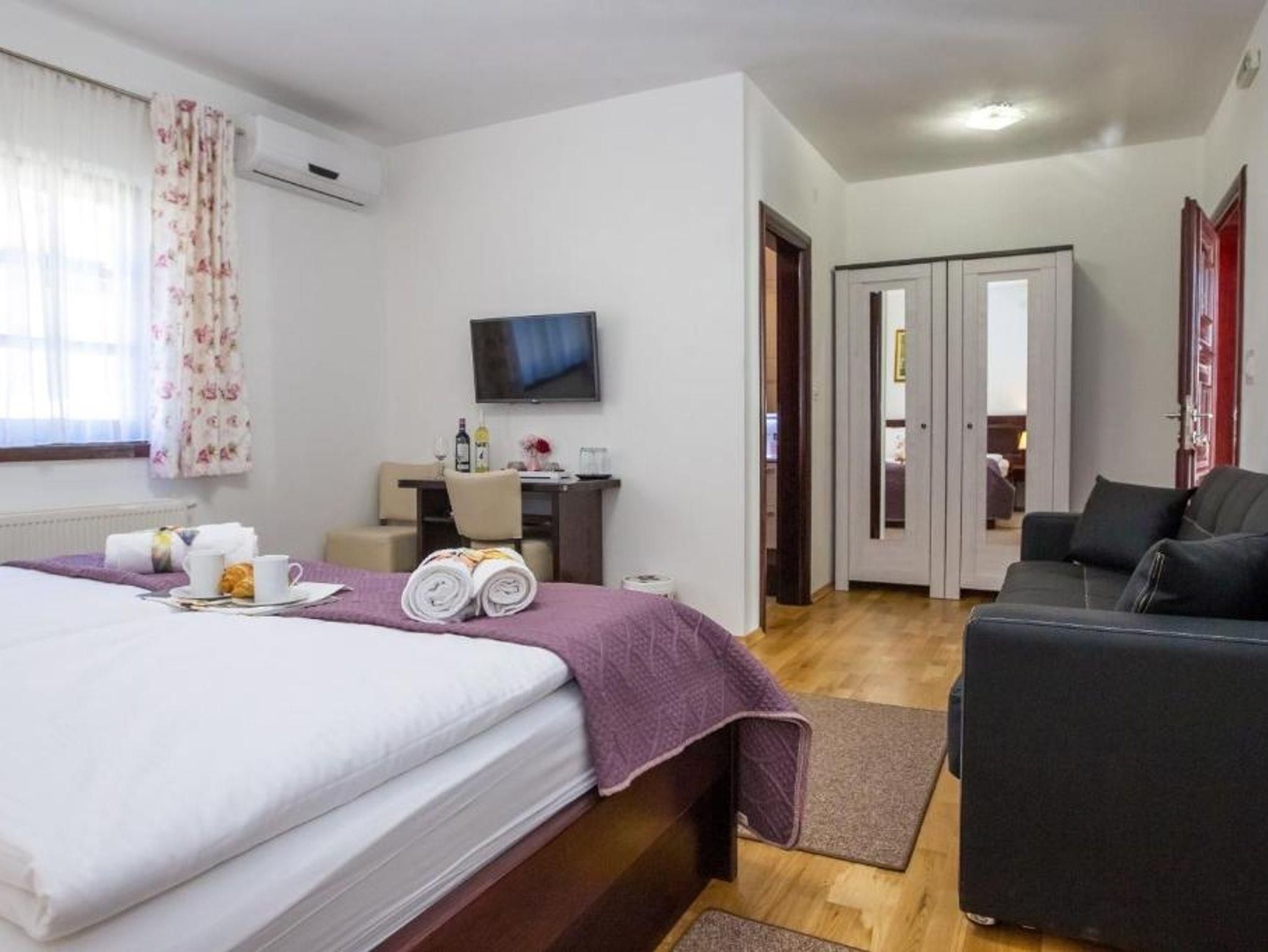 Zimmer bietet Platz für 3 Gäste. Die Betten sind in Schlafzimmern, die es 1 gibt, innerhalb einer Gesamtfläche von 26m2, angeordnet. Die reservierte Unterkunftseinheit hat keinen Balkon und keine Terrasse. Die reservierte Unterkunftseinheit ist ein Zimmer mit eigenem Badezimmer ohne die Möglichkeit der Nutzung einer Küche. IM PREIS INBEGRIFFEN: Kurtaxe, Endreinigung, Klimatisierung, Zentralheizung, Parkplatz, Internet, Föhn. UNVERBINDLICHE ZUSÄTZLICHE KOSTEN: Frühstück (10,00 €, 50% Nachlass für Kinder zwischen 4 und 12 Jahren, Kinder bis 4 Jahre sind frei.). Die Verfügbarkeit zusätzlicher Dienstleistungen in Ihrem reservierten Termin und die Preise derselben (falls nicht aufgeführt) müssen im Voraus überprüft werden. Zusätzliche Dienstleistungen die in der Zahlungsaufforderung nicht aufgeführt sind werden direkt beim Vermieter bezahlt, angenommen der Gast nutzt auch diese.