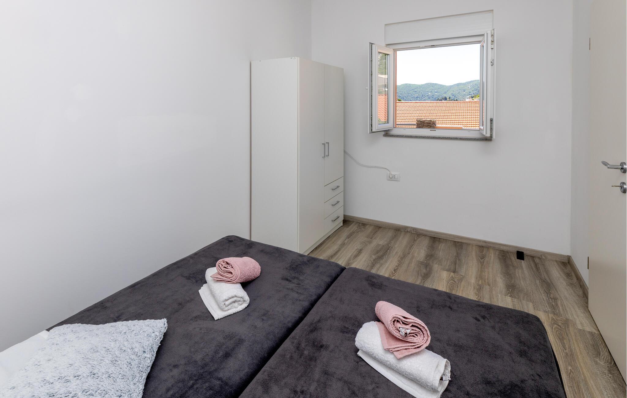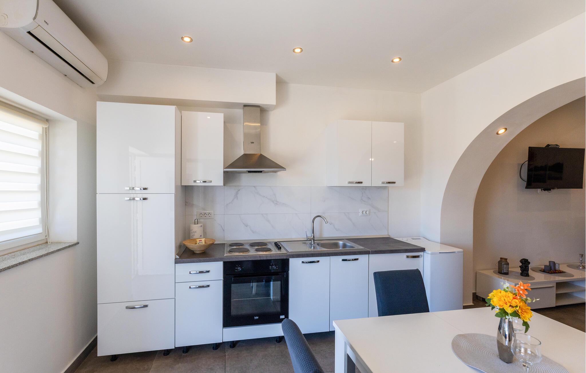 Nyd en behagelig ferie i denne charmerende ferielejlighed. Beliggende nær kysten og attraktive destinationer byder denne moderne lejlighed i stueetagen jer velkommen. Tilbered lækre måltider med lokale ingredienser, og planlæg jeres udflugter til afslappede måltider. Efter en lang dag kan I slappe af på sofaen, streame jeres yndlingsserie eller være vært for en spilleaften. Start dagen med morgenmad på den åbne terrasse og nyd den behagelige atmosfære ved solnedgang. Tag en bådtur til de nærliggende strande og køb friskfanget fisk i havnen i Ploce. Cykl gennem det idylliske Neretva-delta og tag dagsture til de historiske byer Ston og Dubrovnik. Prøv lokale vine på en nærliggende vingård, eller slap af med en kajaktur gennem Neretva-flodens rolige vandveje. For de eventyrlystne anbefales en dagstur til Biokovo Naturpark, hvor I kan udforske de spektakulære klipper og panoramaudsigten.
