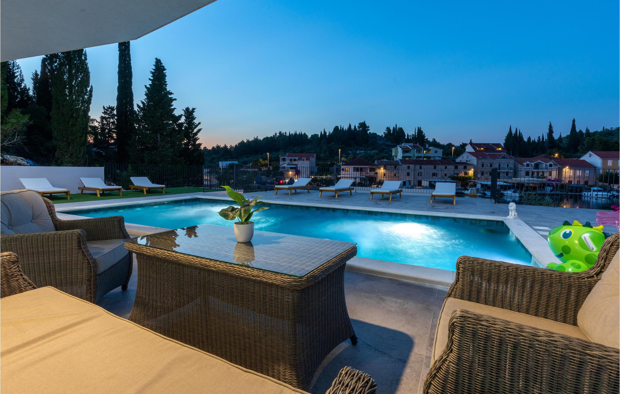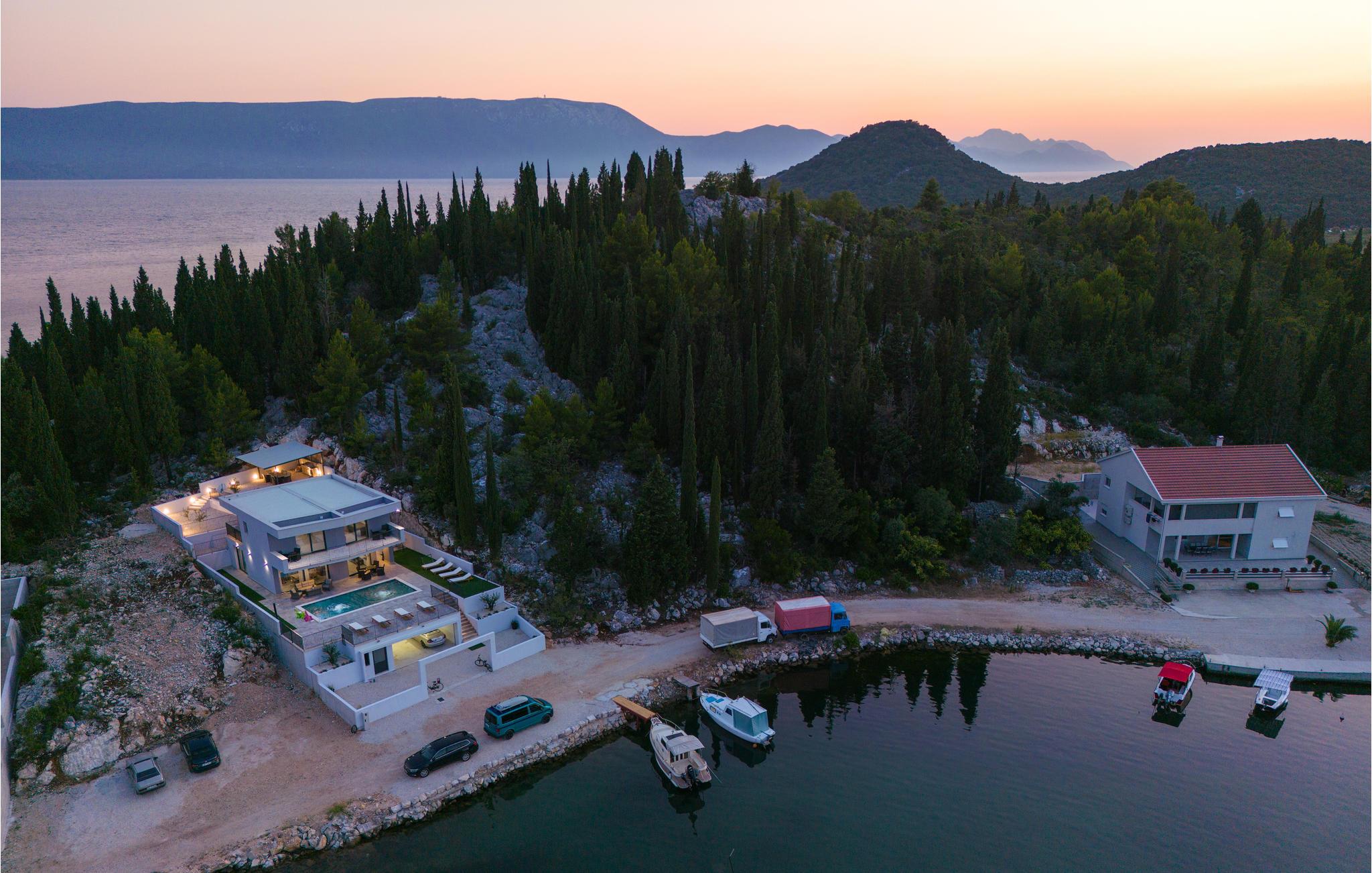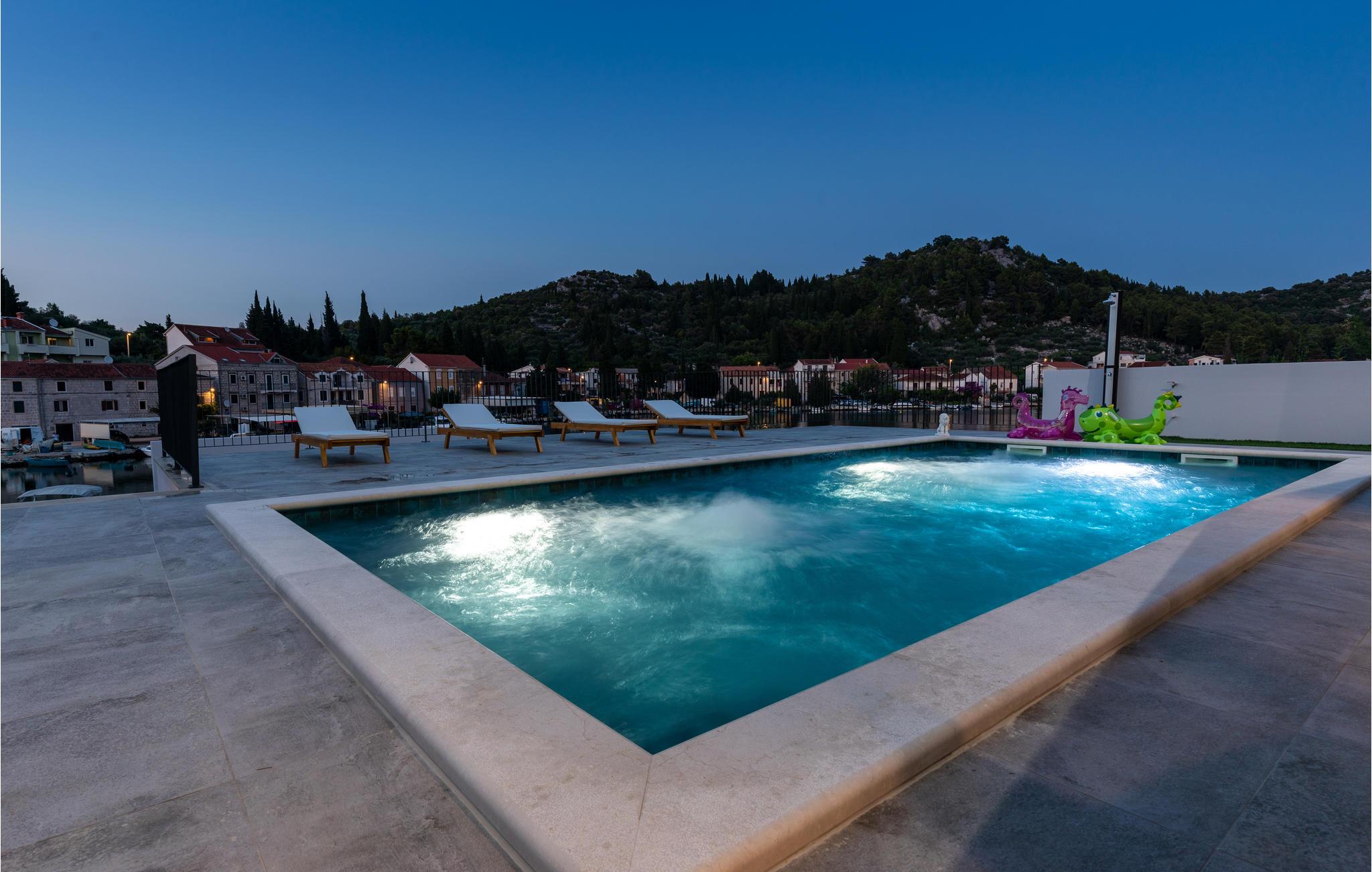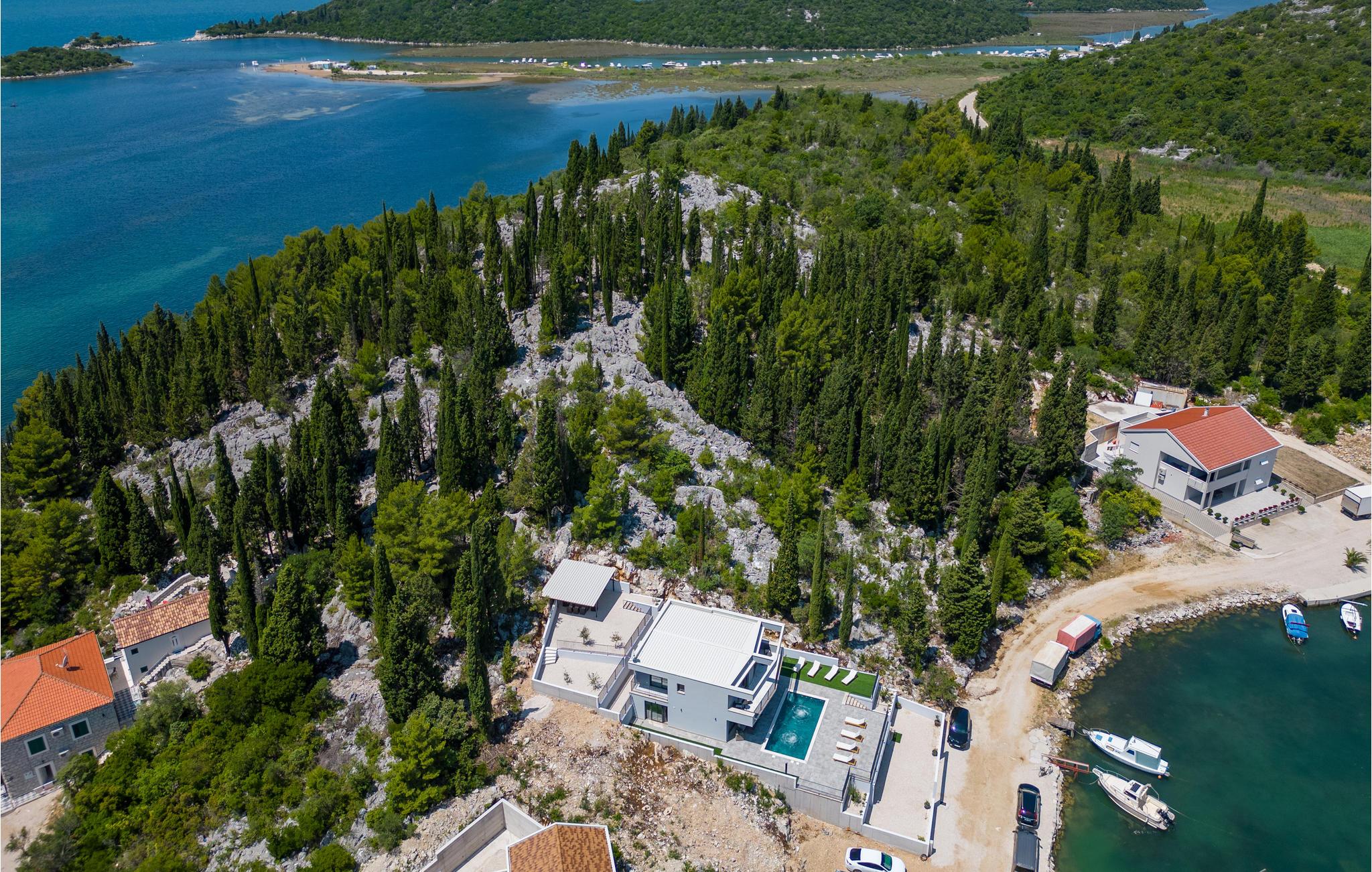Tilbring en dejlig ferie i dette attraktive feriehus med pool nær havet. Velkommen til dette attraktive og komfortable hus, der tilbyder dig alle de faciliteter, du har brug for til din ferie. Nyd en uforglemmelig tid med familien i huset, som imponerer med sin smagfulde indretning og store panoramavinduer. Tilbring hyggelige aftener her med spil og gode samtaler ved det lange spisebord eller på de indbydende sofaer. Omkring huset er der talrige muligheder for at tilbringe dejlige timer udendørs. Uanset om du nyder udsigten og en kop kaffe på altanen, læser en bog i skyggen på en af terrasserne eller tager sol ved poolen, er du sikker på at slappe af på ferien. Du kan nemt nå den smukke sandstrand til fods. Du kan nyde det krystalklare hav i afsondrede bugter og på små strande. Slap af i det maleriske naturscenarie mellem fyrreskove, floder, havet og imponerende klippeformationer. Den nærliggende Dubrovnik eller Peljesac-halvøen med sine berømte vinmarker samt øen Korcula, kendt som hjemsted for opdagelsesrejsende Marco Polo, er velegnede til længere ture. I nord finder du Mostar med den Unesco-beskyttede bro, pilgrimsrejsestedet Medjugorje og øerne Hvar og Brac. Glæd dig til en mindeværdig ferie i det sydlige Dalmatien.