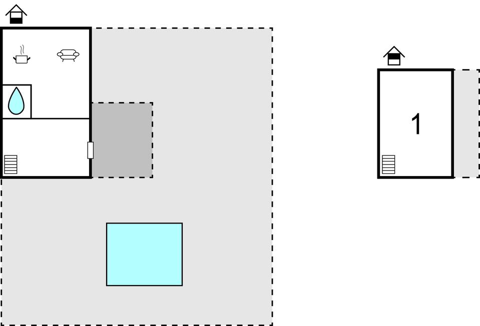 Huset består af to bygninger på en indhegnet grund. I stueetagen af ??hovedhuset er der stue med pejs, køkken og badeværelse, og på første sal er der soveværelse. I en mindre bygning er der en studielejlighed med et ekstra køkken, badeværelse og stue.