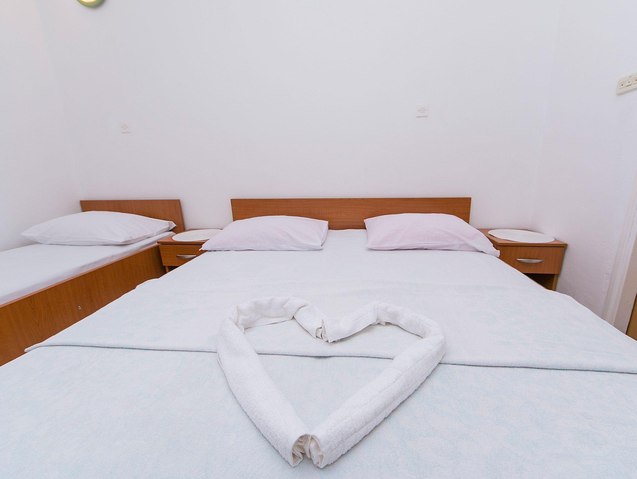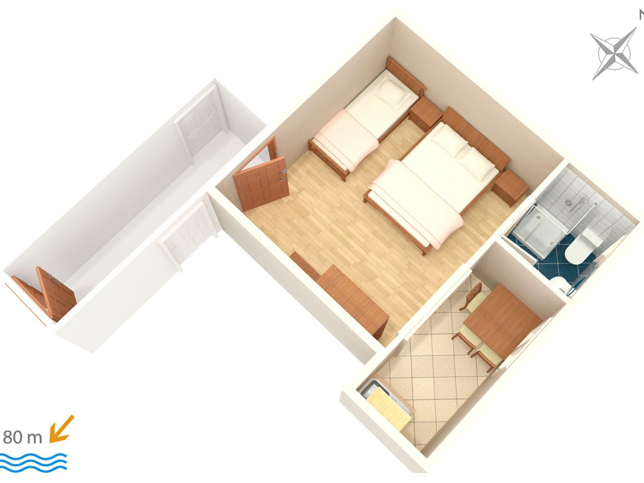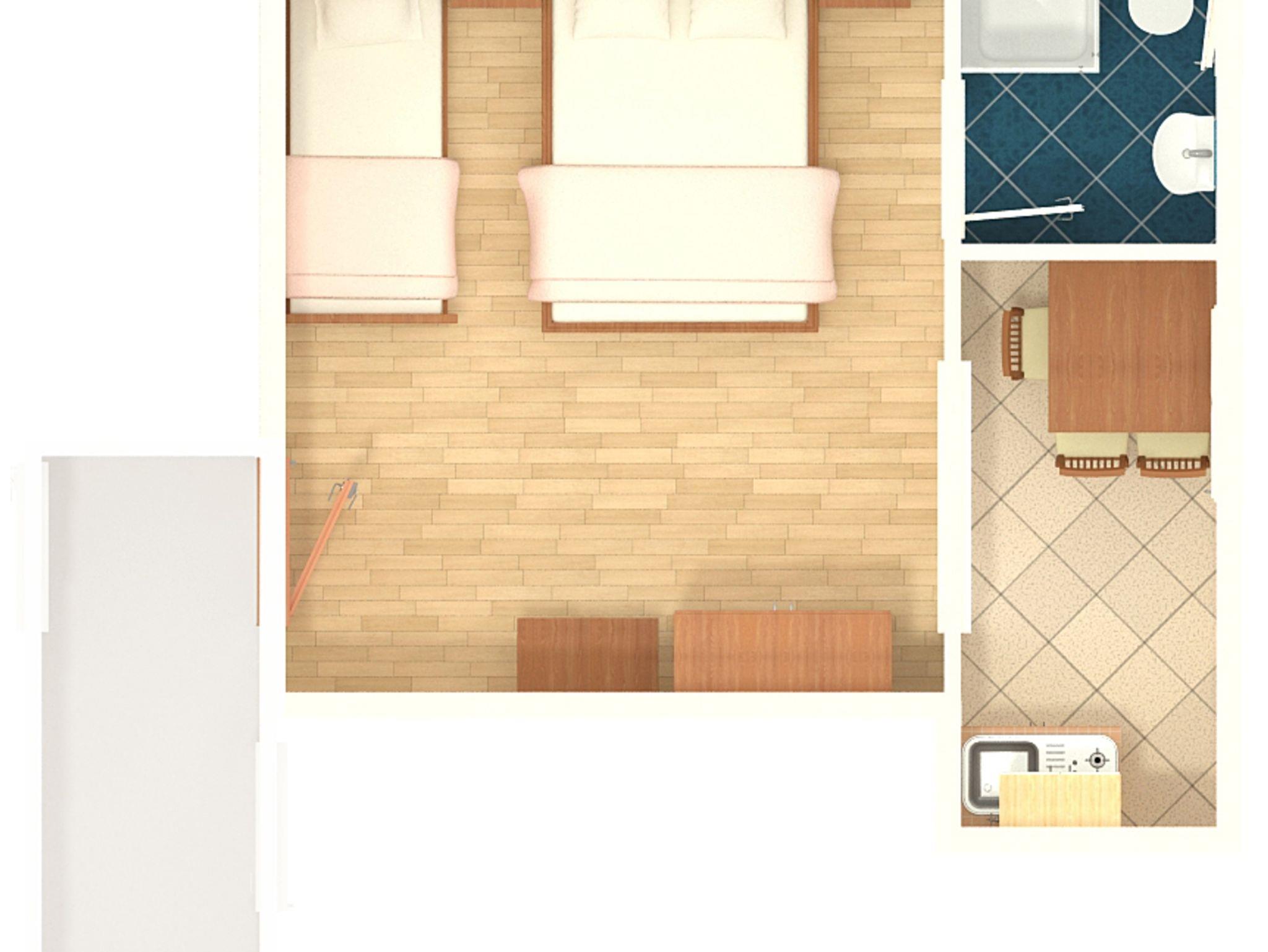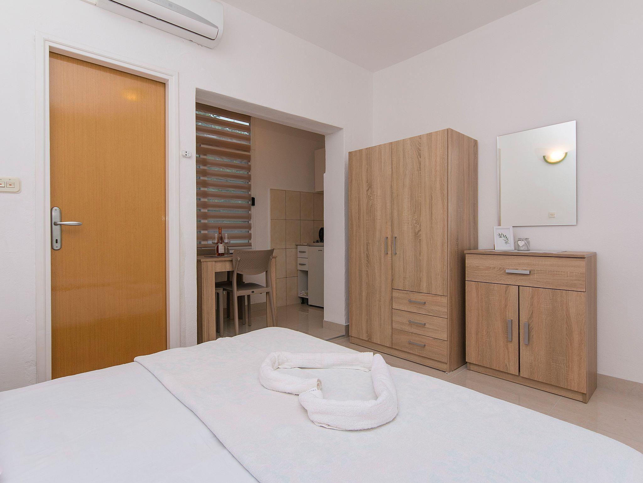 Studio bietet Platz für 3 Gäste. Die Betten sind in Schlafzimmern, die es 1 gibt, innerhalb einer Gesamtfläche von 19m2, angeordnet. Es ist erlaubt, Speisen auf dem Gemeinschafts-Grill vorzubereiten. Die reservierte Unterkunftseinheit hat keinen Balkon und keine Terrasse. IM PREIS INBEGRIFFEN: Kurtaxe, Endreinigung, Klimatisierung, Parkplatz, Internet, Bügeleisen, Bügelbrett, Föhn, tragbarer Grill. VERBINDLICHE ZUSÄTZLICHE KOSTEN: Aufzahlung für Kurzaufenthalte (prozentualer Zuschlag pro Nächtigungsanzahl: 30% - 1, 20% - 2, 10% - 3). UNVERBINDLICHE ZUSÄTZLICHE KOSTEN: Wäschewaschen (7,00 € Waschen), Zusatzbett (6,00 € pro Nacht). Die Verfügbarkeit zusätzlicher Dienstleistungen in Ihrem reservierten Termin und die Preise derselben (falls nicht aufgeführt) müssen im Voraus überprüft werden. Zusätzliche Dienstleistungen die in der Zahlungsaufforderung nicht aufgeführt sind werden direkt beim Vermieter bezahlt, angenommen der Gast nutzt auch diese. Ermäßigung auf den Grundpreis: Gratistag 28=25 (bei einem Aufenthalt von 28 oder mehr Tagen erhalten Sie 3 kostenlose Tage für den Aufenthalt bis 31.12.26).