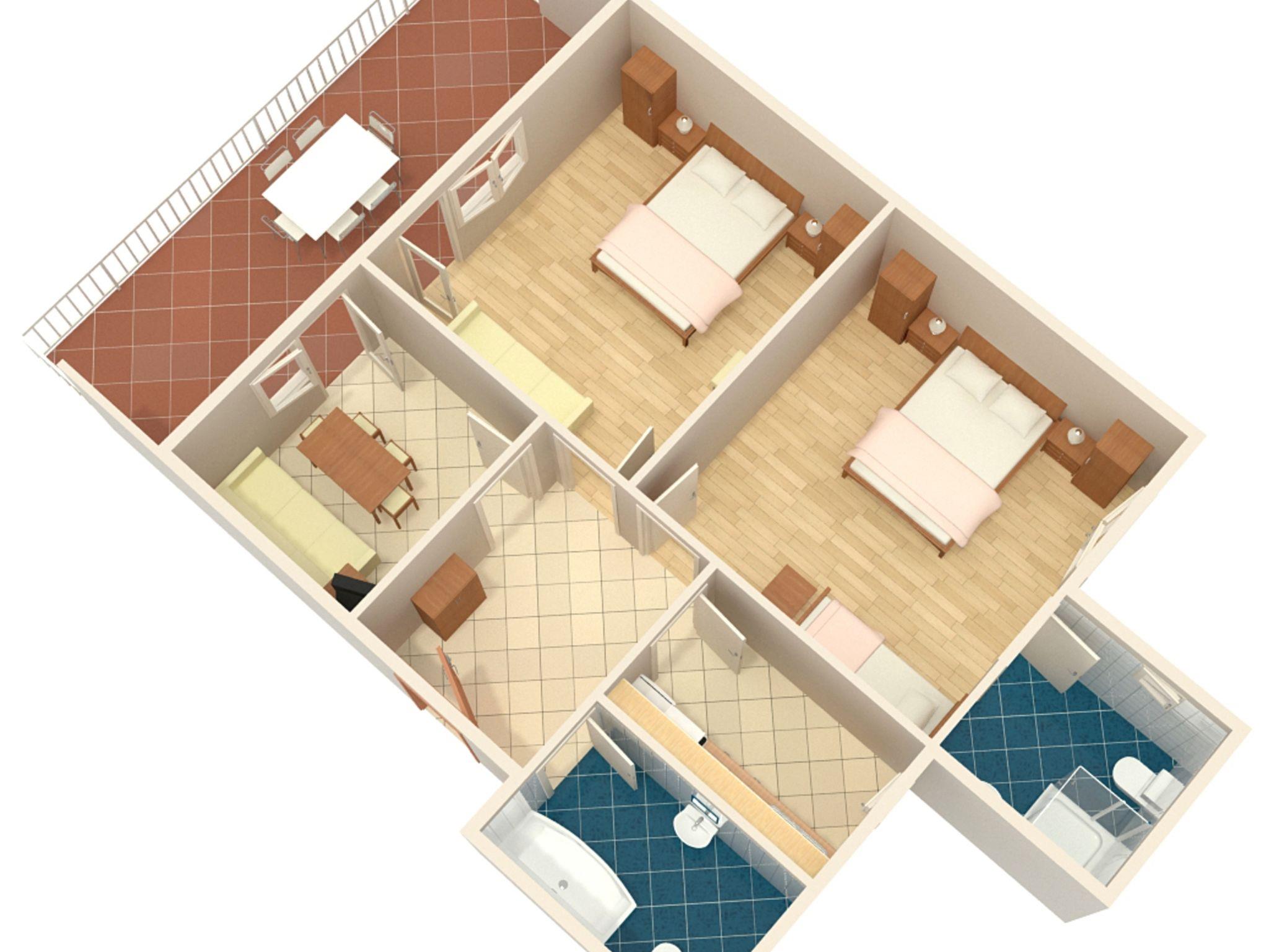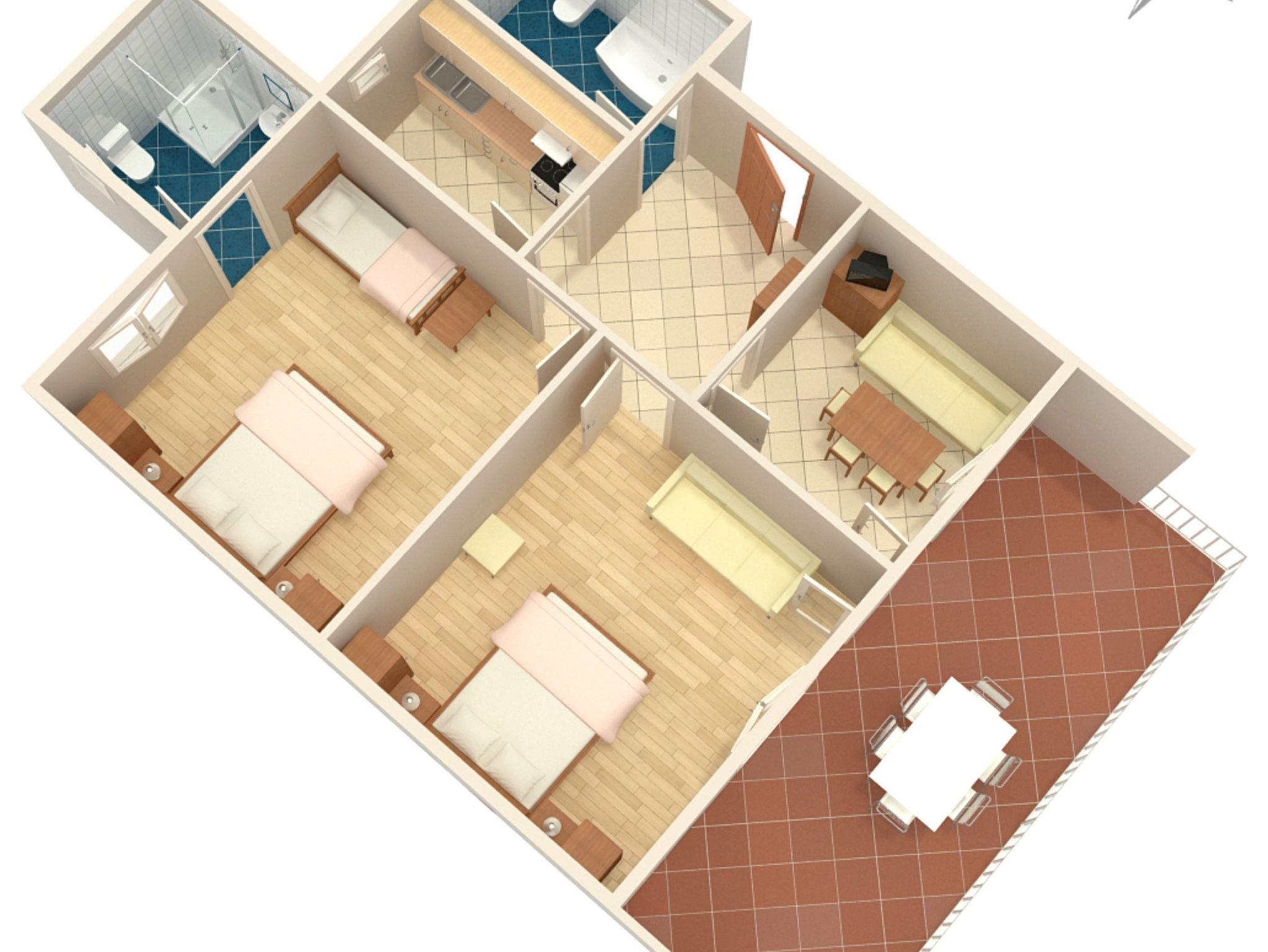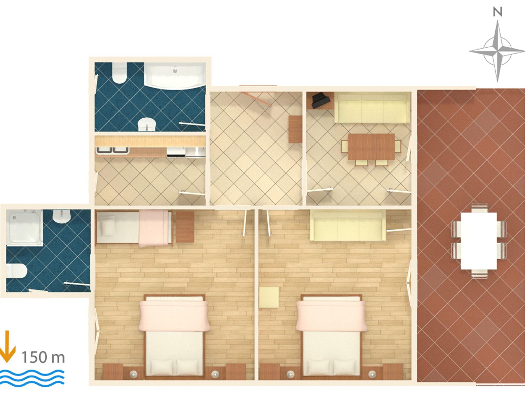 Ferienwohnung bietet Platz für 8 Gäste. Die Betten sind in Schlafzimmern, die es 2 gibt, und in Esszimmer, innerhalb einer Gesamtfläche von 52m2, angeordnet. Die Gäste haben eine eigene Terrasse zur Verfügung, auf der sie in warmen Sommernächten genießen können. Es ist erlaubt, Speisen auf dem Gemeinschafts-Grill vorzubereiten. In der Unterkunftseinheit besteht die Möglichkeit des Mitbringens von Haustieren gegen Aufpreis. IM PREIS INBEGRIFFEN: Kurtaxe, Endreinigung, Klimatisierung, Parkplatz, Internet, Bügeleisen, Bügelbrett, Föhn, tragbarer Grill. UNVERBINDLICHE ZUSÄTZLICHE KOSTEN: Haustiere (5,00 € pro Nacht). Die Verfügbarkeit zusätzlicher Dienstleistungen in Ihrem reservierten Termin und die Preise derselben (falls nicht aufgeführt) müssen im Voraus überprüft werden. Zusätzliche Dienstleistungen die in der Zahlungsaufforderung nicht aufgeführt sind werden direkt beim Vermieter bezahlt, angenommen der Gast nutzt auch diese.