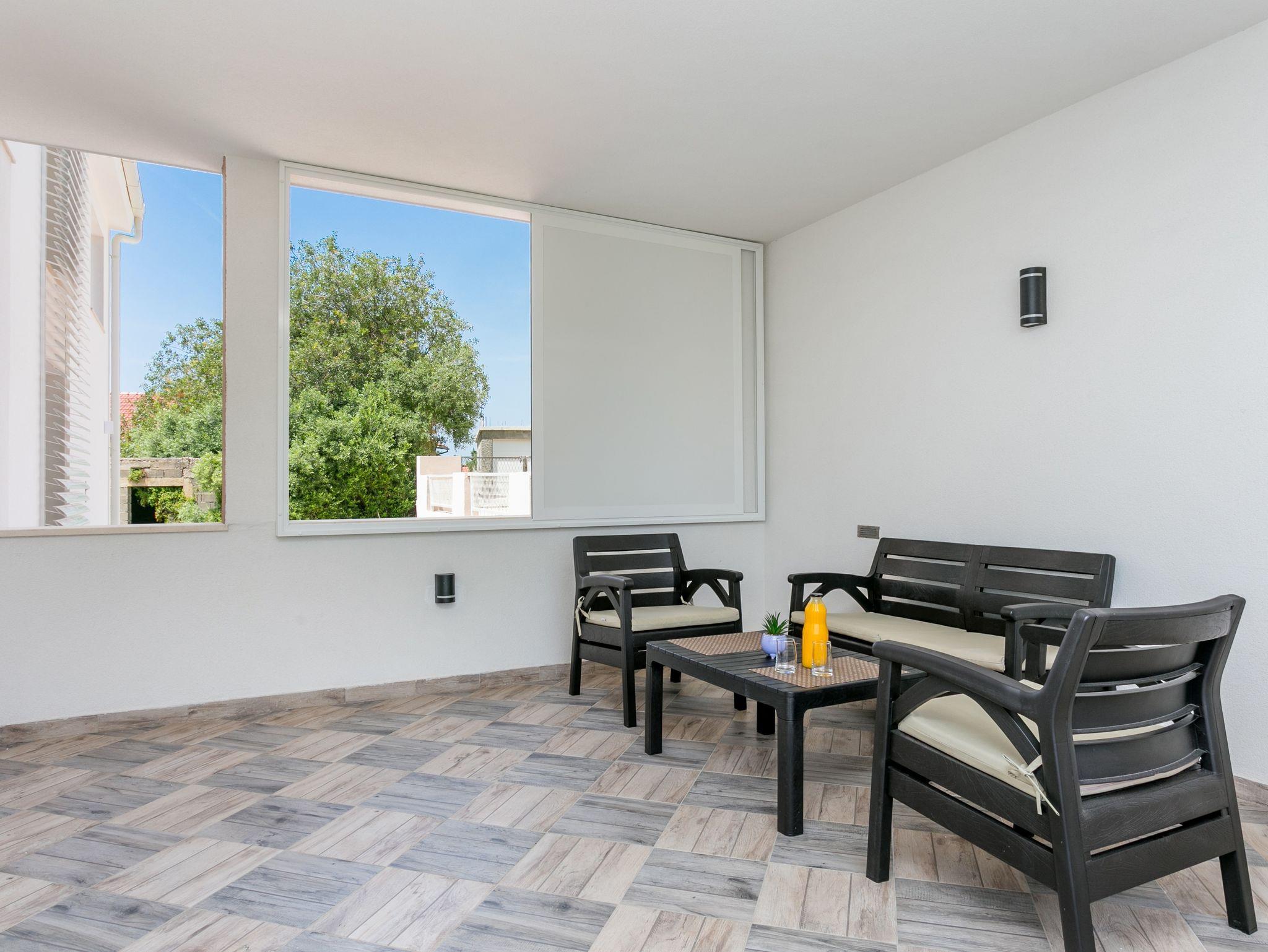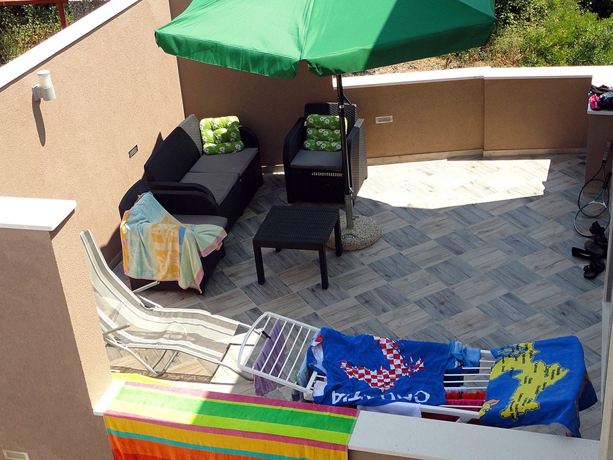 Ferienwohnung bietet Platz für 5 Gäste. Die Betten sind in Schlafzimmern, die es 1 gibt, und in Wohnzimmer, innerhalb einer Gesamtfläche von 33m2, angeordnet. Die Gäste haben eine eigene Terrasse zur Verfügung, auf der sie in warmen Sommernächten genießen können. Das Apartment bietet Meerblick. IM PREIS INBEGRIFFEN: Kurtaxe, Endreinigung, Parkplatz, Internet, Kinderbett, Bügeleisen, Bügelbrett, Föhn, Sonnenschirm, Liegestühle. VERBINDLICHE ZUSÄTZLICHE KOSTEN: Aufzahlung für Kurzaufenthalte (prozentualer Zuschlag pro Nächtigungsanzahl: 30% - 1, 20% - 2, 10% - 3). UNVERBINDLICHE ZUSÄTZLICHE KOSTEN: Klimatisierung (8,00 € pro Nacht). Die Verfügbarkeit zusätzlicher Dienstleistungen in Ihrem reservierten Termin und die Preise derselben (falls nicht aufgeführt) müssen im Voraus überprüft werden. Zusätzliche Dienstleistungen die in der Zahlungsaufforderung nicht aufgeführt sind werden direkt beim Vermieter bezahlt, angenommen der Gast nutzt auch diese. Ermäßigung auf den Grundpreis: Gratistag 14=13 (bei einem Aufenthalt von 14 Tagen oder mehr erhalten Sie einen Gratistag für den Aufenthalt bis 31.12.26).