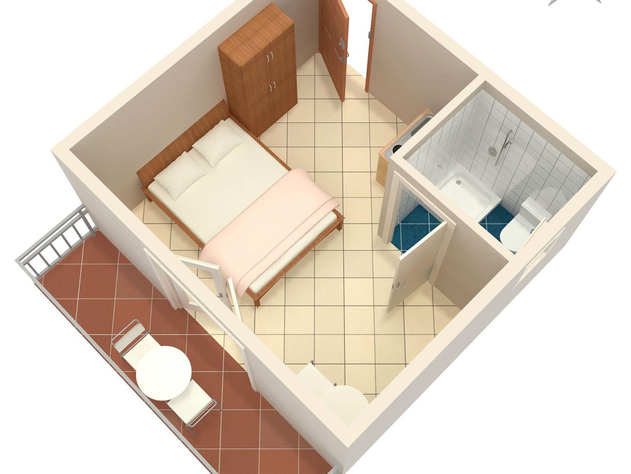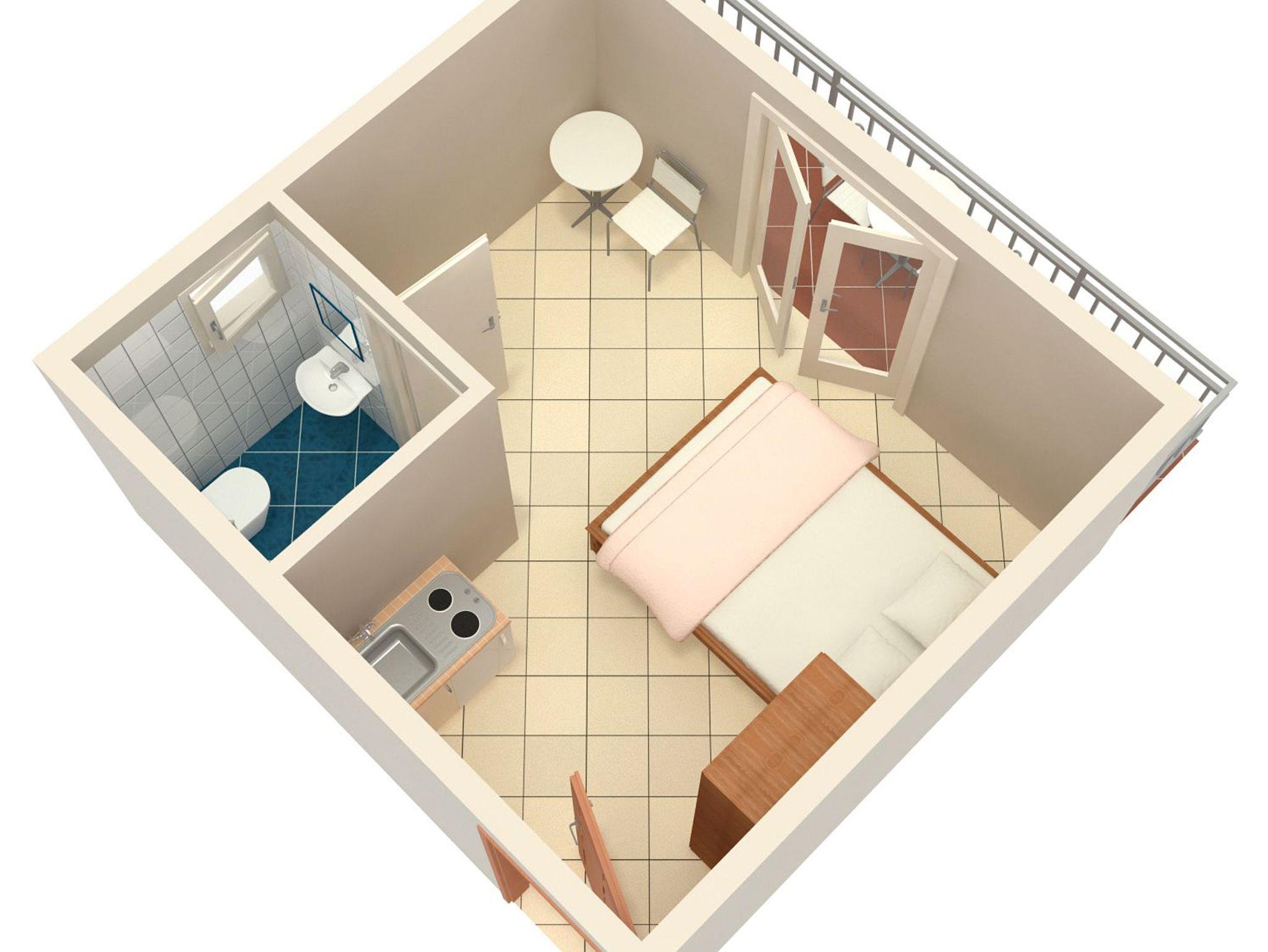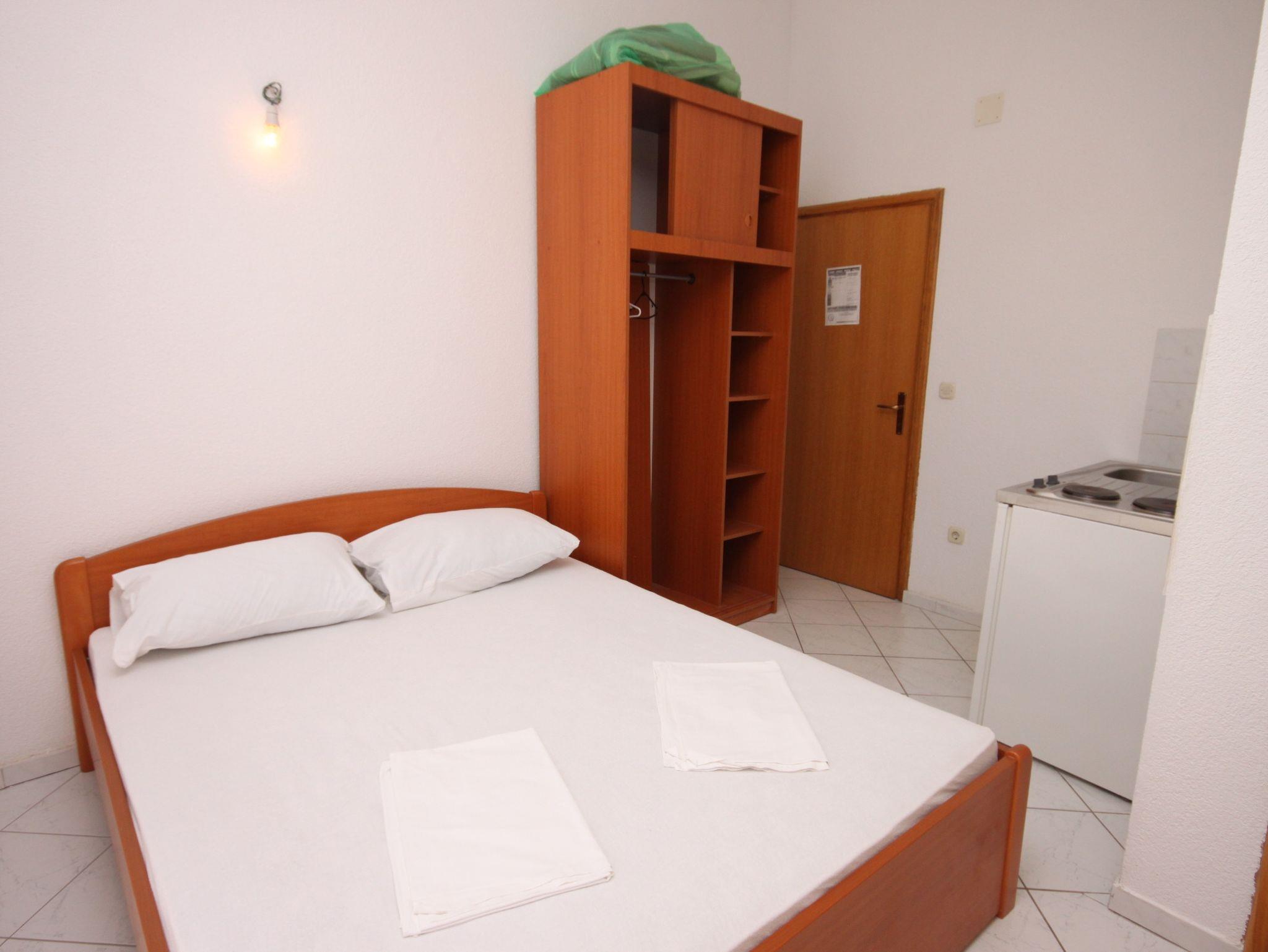 Studio bietet Platz für 2 Gäste. Die Betten sind in Schlafzimmern, die es 1 gibt, innerhalb einer Gesamtfläche von 16m2, angeordnet. Die Gäste haben einen eigenen Balkon zur Verfügung, auf der sie in warmen Sommernächten genießen können. Das Studio-Apartment bietet Meerblick. IM PREIS INBEGRIFFEN: Kurtaxe, Endreinigung, Klimatisierung, Parkplatz, Internet, Bügeleisen, Bügelbrett, Föhn. VERBINDLICHE ZUSÄTZLICHE KOSTEN: Aufzahlung für Kurzaufenthalte (prozentualer Zuschlag pro Nächtigungsanzahl: 30% - 1, 20% - 2, 10% - 3). Die Verfügbarkeit zusätzlicher Dienstleistungen in Ihrem reservierten Termin und die Preise derselben (falls nicht aufgeführt) müssen im Voraus überprüft werden. Zusätzliche Dienstleistungen die in der Zahlungsaufforderung nicht aufgeführt sind werden direkt beim Vermieter bezahlt, angenommen der Gast nutzt auch diese. Ermäßigung auf den Grundpreis: Gratistag 14=13 (bei einem Aufenthalt von 14 Tagen oder mehr erhalten Sie einen Gratistag für den Aufenthalt bis 31.12.26).
