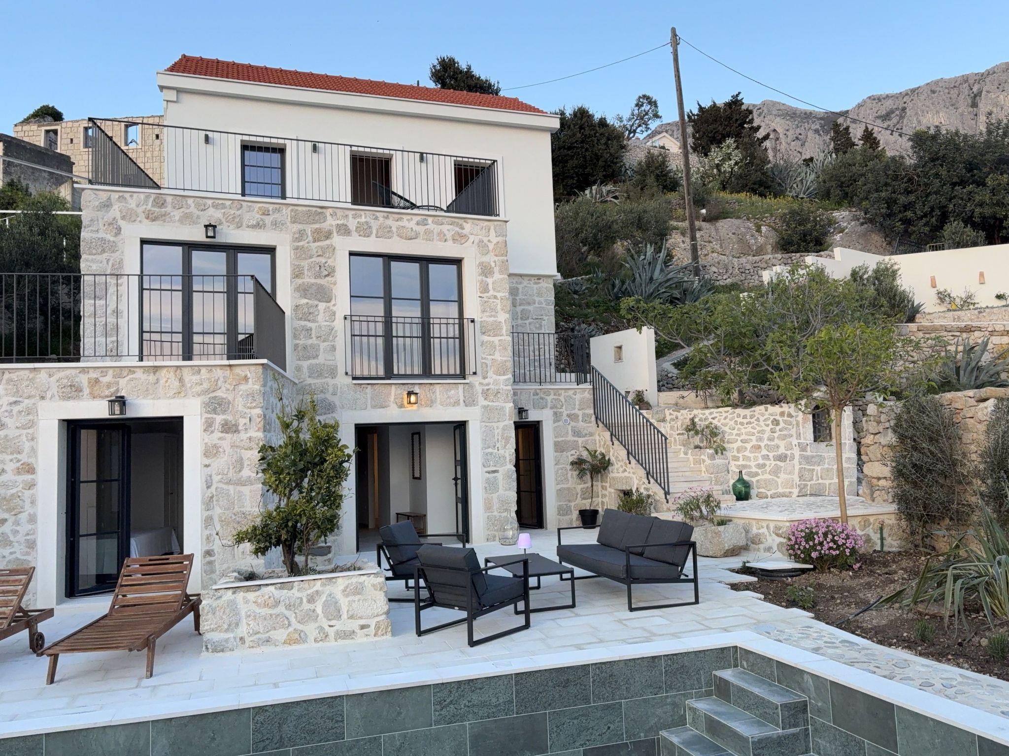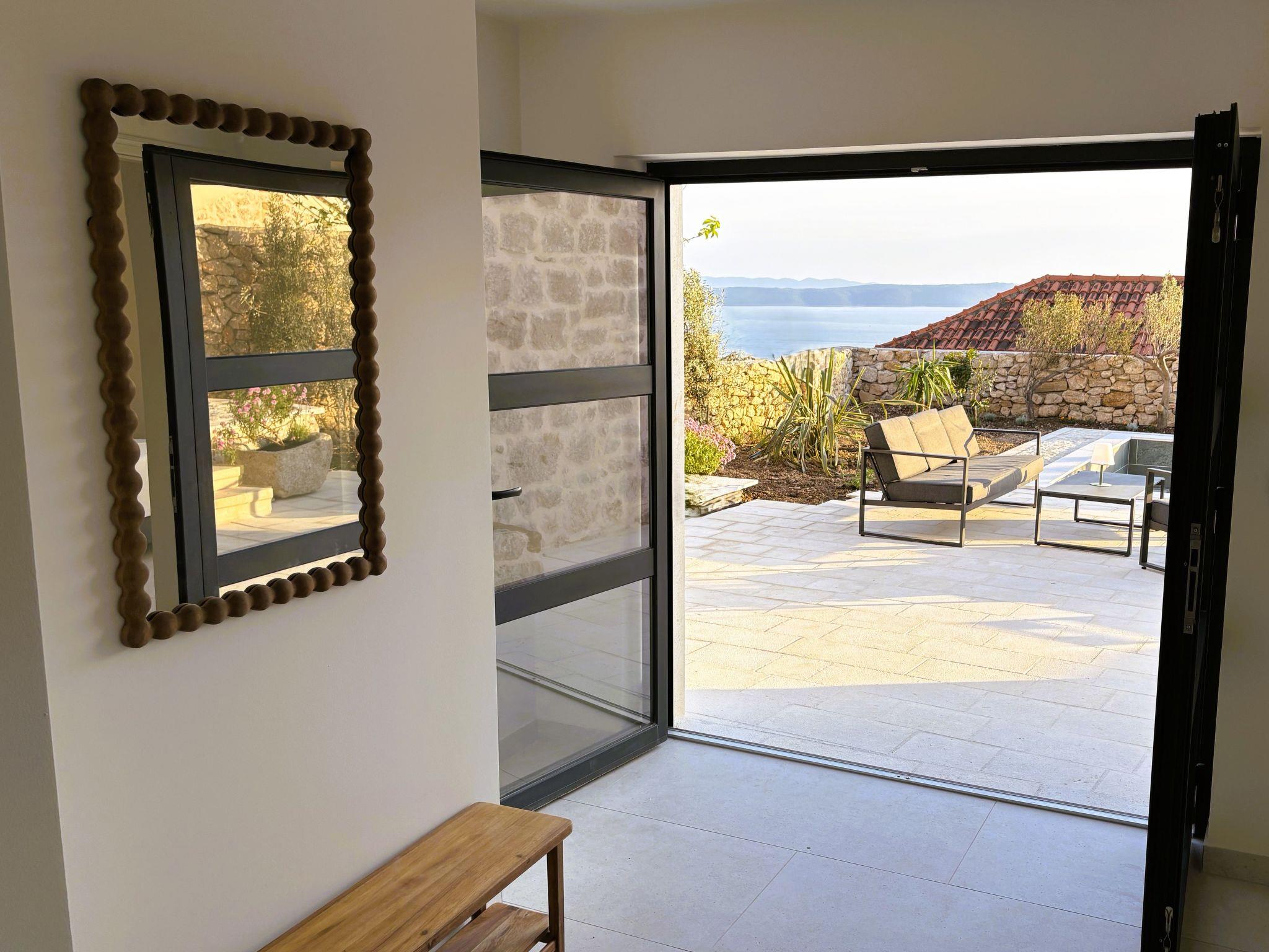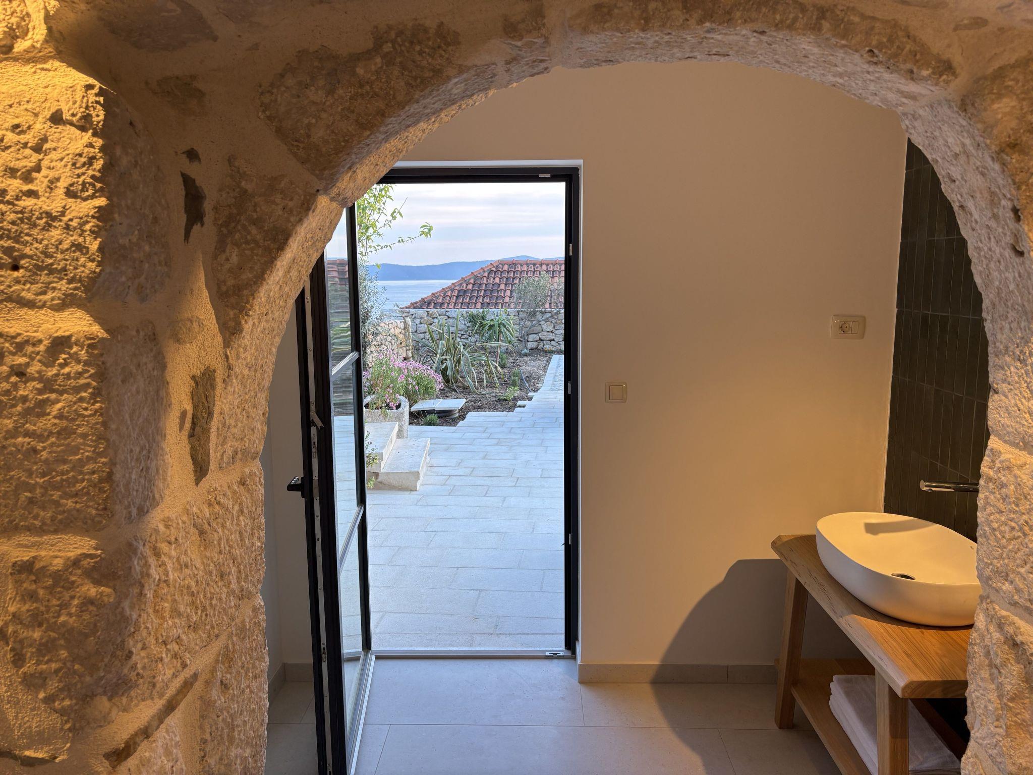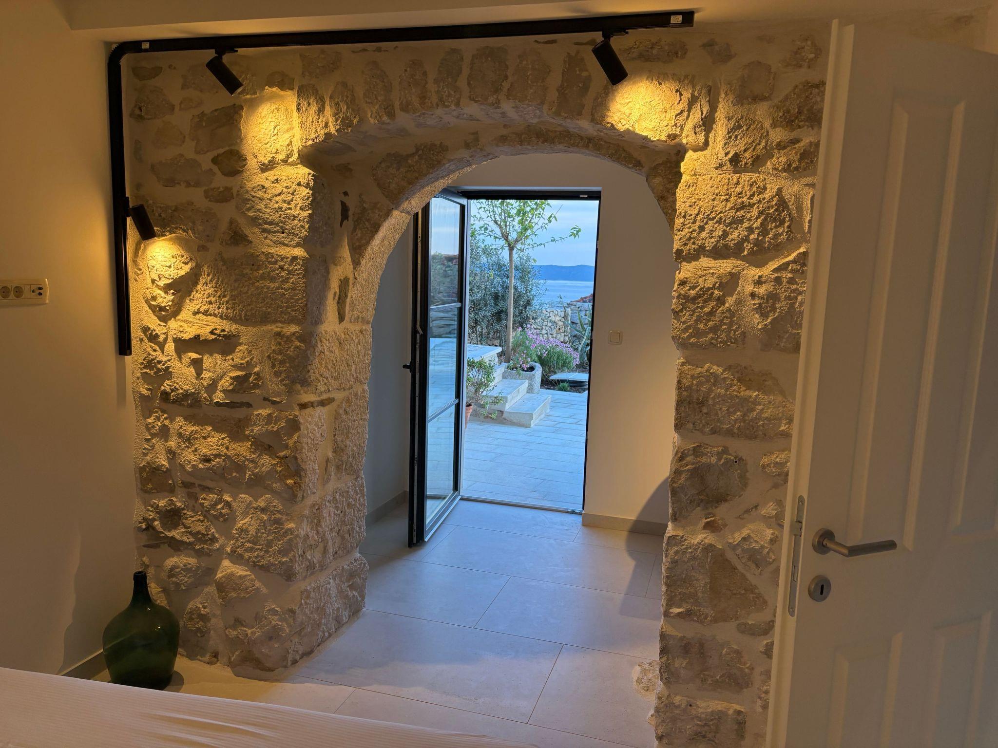 In addition to its location, this beautiful villa offers its guests a holiday in the unforgettable ambience of an old Dalmatian farmhouse, which was renovated in 2025 in a very modern way, respecting the tradition of old Dalmatian architecture. In the villa there are three very modernly equipped bedrooms, each with its own bathroom and toilet, as well as a very modern kitchen, dining area and living room. The rooms have traditional stone walls that create a cosy atmosphere where you can enjoy romantic sunsets with a glass of wine. On the ground floor there are two bedrooms each with its own bathroom, from here you can access the beautiful courtyard with the heated pool and sun loungers and garden with rosemary, laurel and lavender. The third bedroom is located on the top floor and also has its own bathroom and large balcony with beautiful sea views. On the first floor there is a living room with sofa, TV, very modern equipped kitchen and dining area, which leads to a balcony with sea view, which has a barbecue and a table for 8 people.