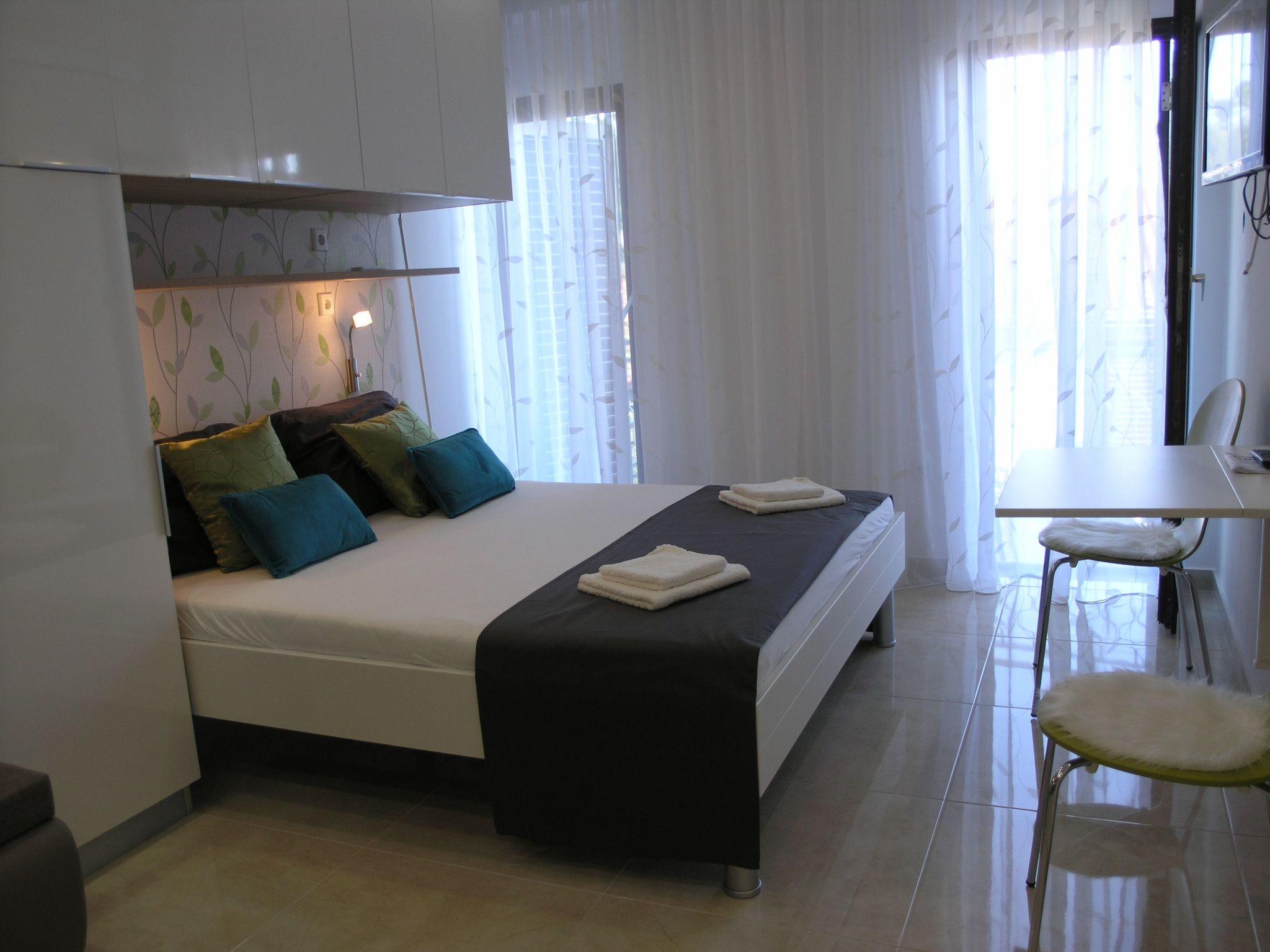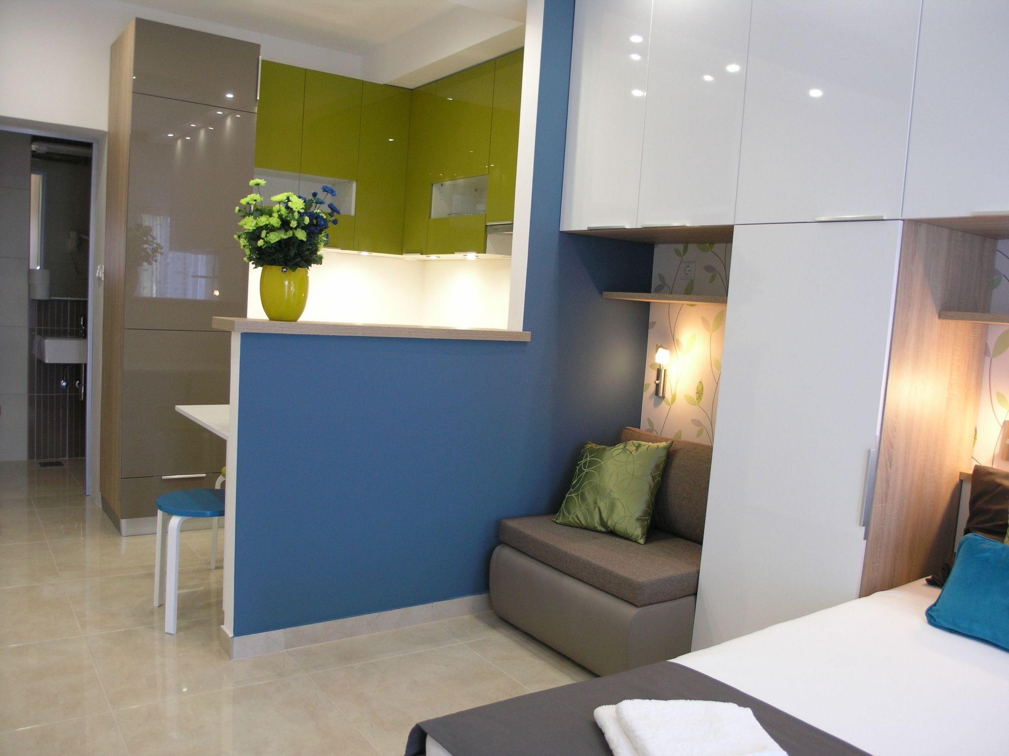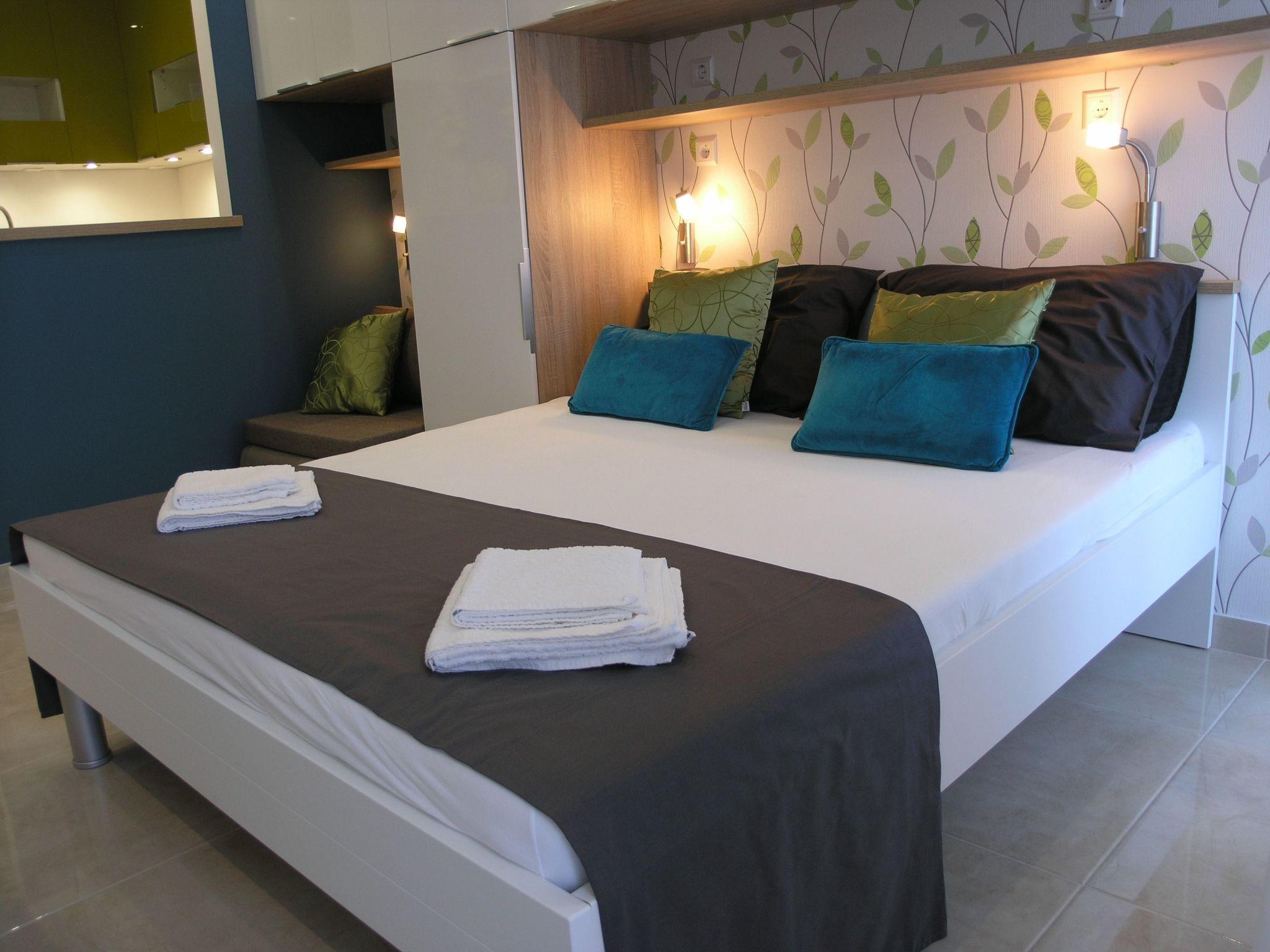 Brand new renovated studio apartment for 2+1. New kitchen has a big fridge with three deep freeze drawers, oven, induction cooker with 4 rings and a lot of space for passionate cooks. You have toaster, coffe and tea pot and most kitchen accessories for cooking. You have air-condition, flat TV with satelite programs as wel as local programs. In the bathroom you have a hair dryer. From the balcony is a beautiful view to sea, mountain Biokovo and Podgora.