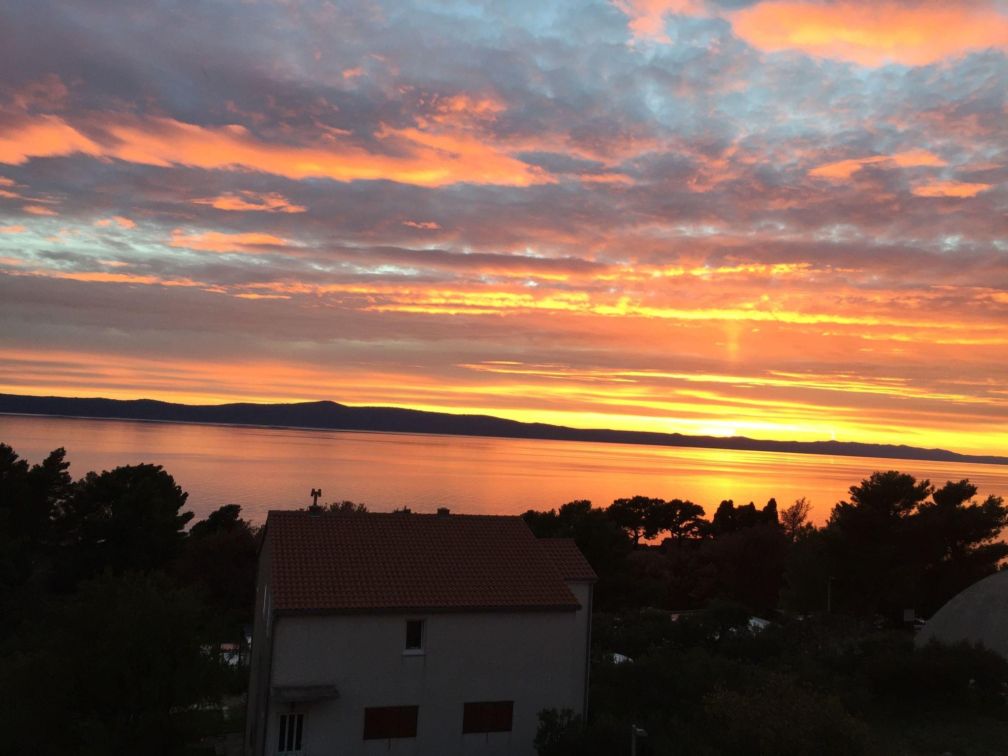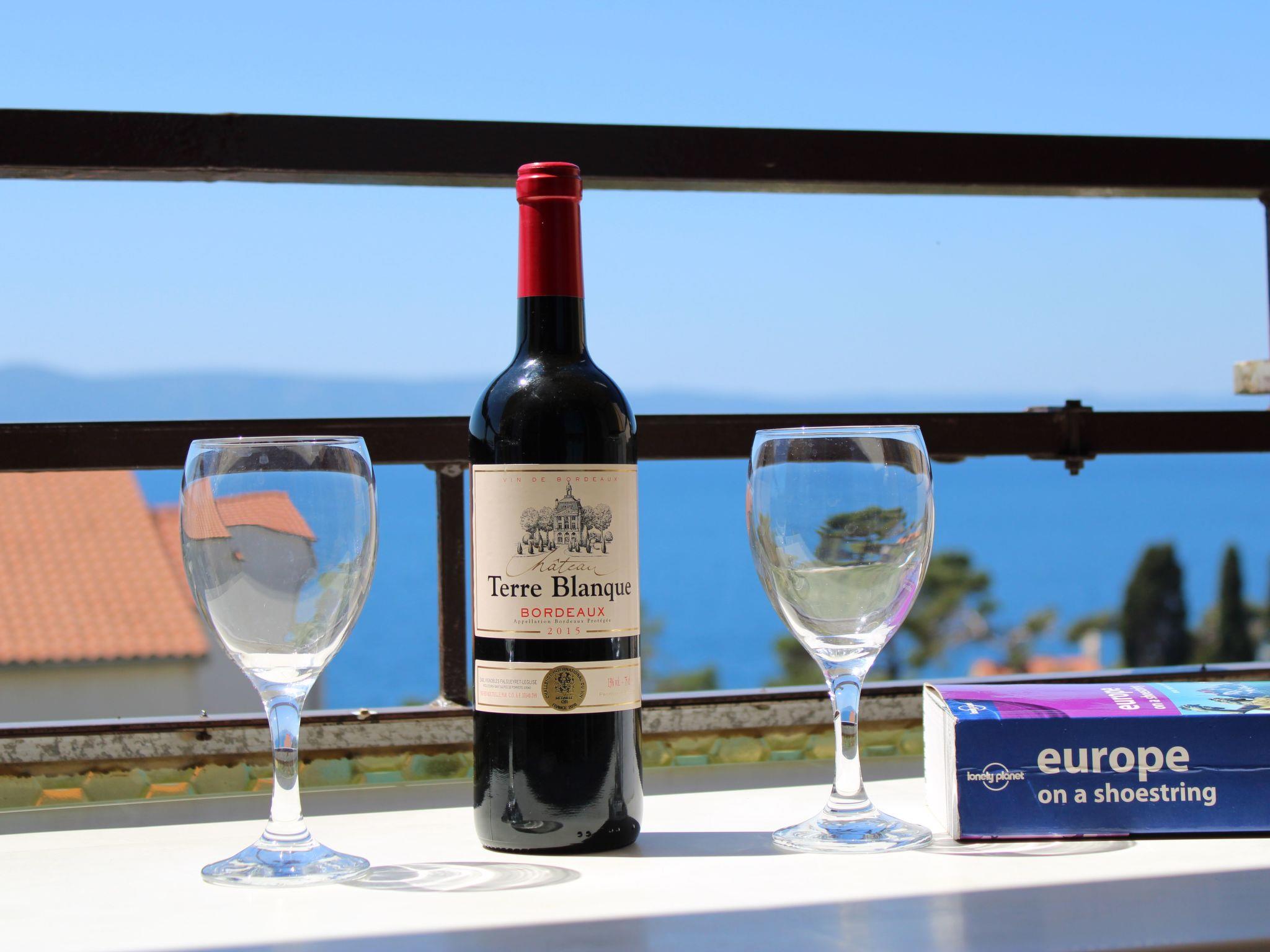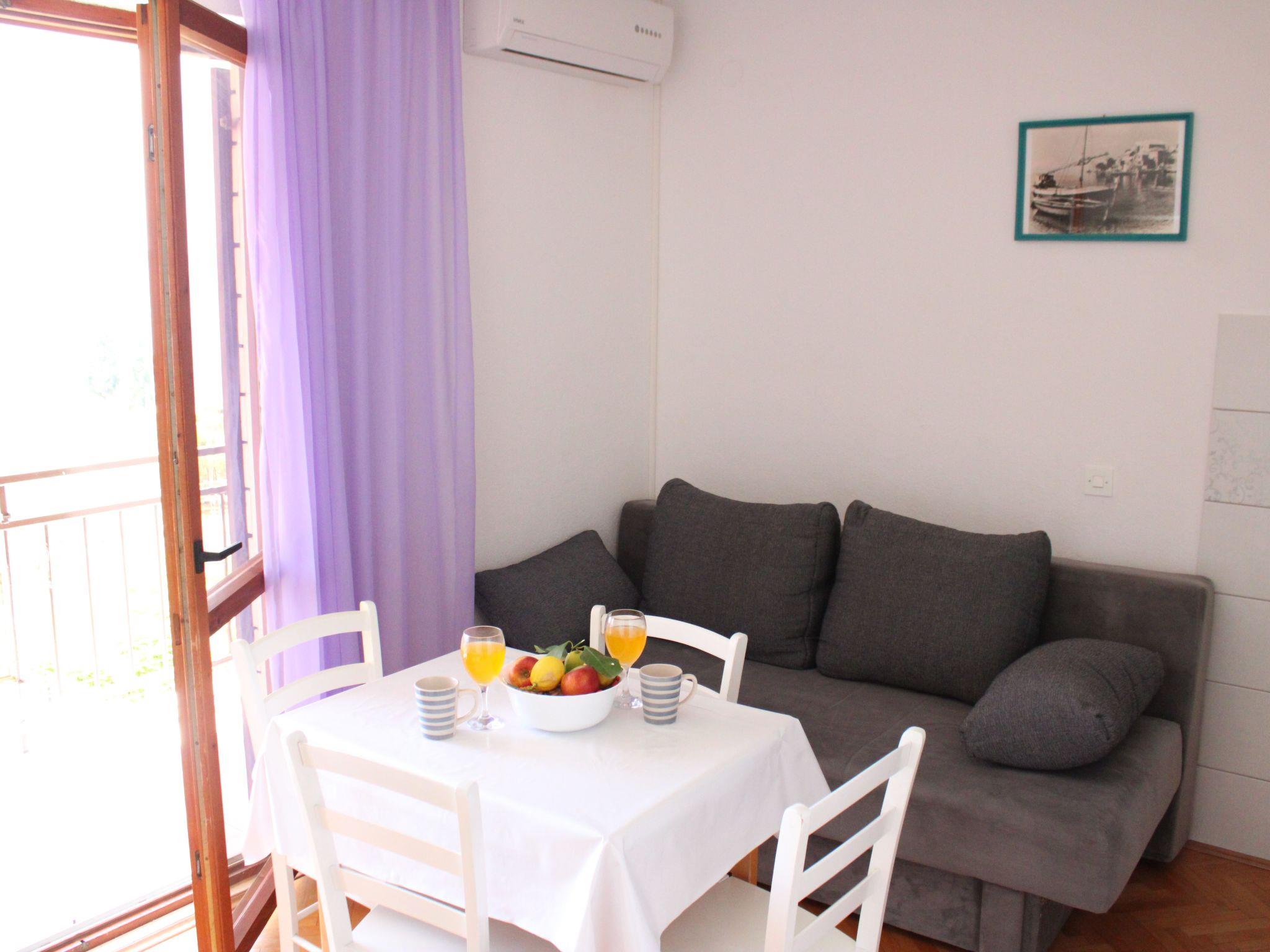 The living room opens onto the private sunny balcony with a table and chairs. You can end a long day on the beach here with a glass of Croatian wine and a panoramic view over the bay. If you arrive by car, you can use the secure parking space right in front of the house.