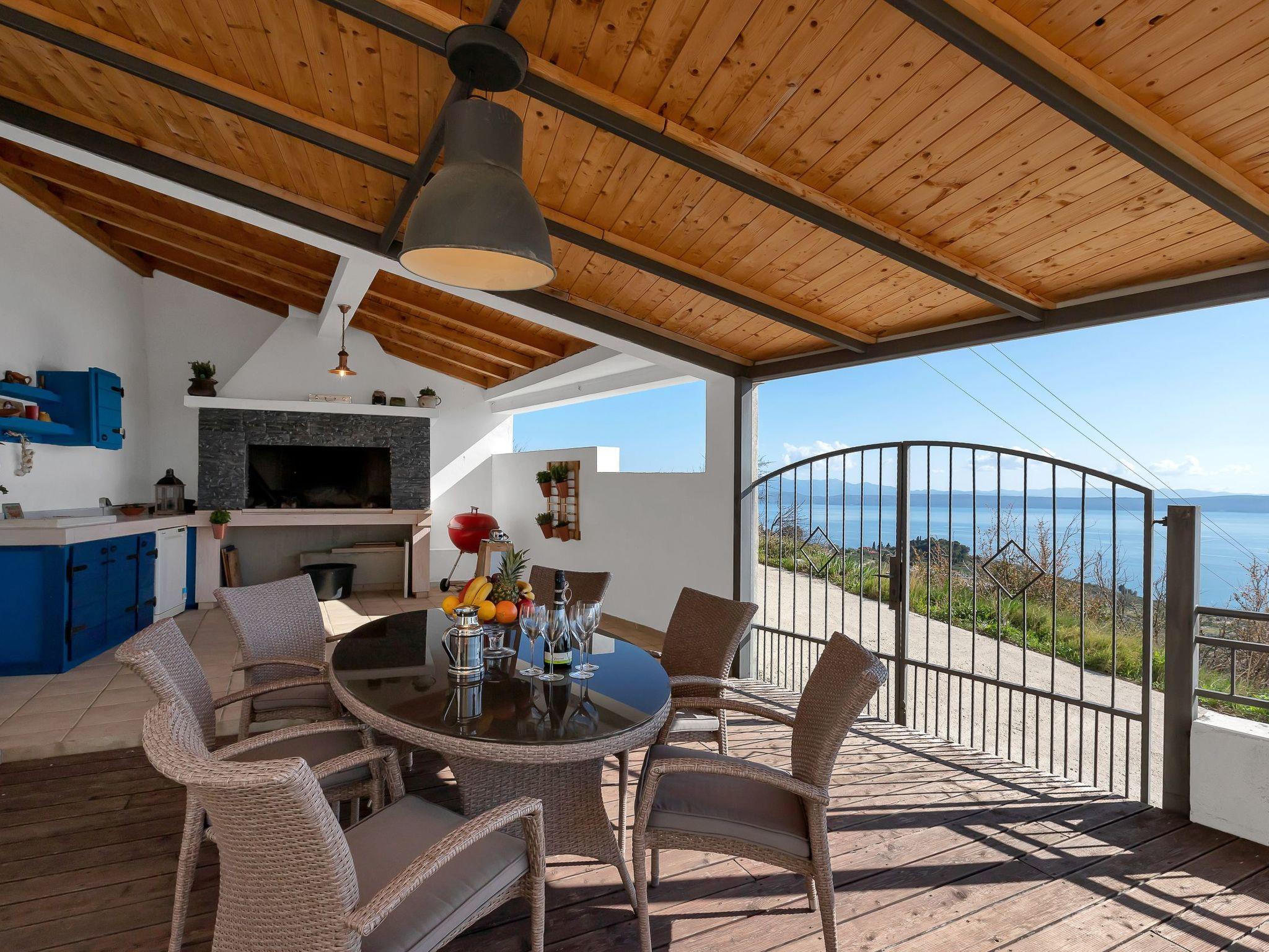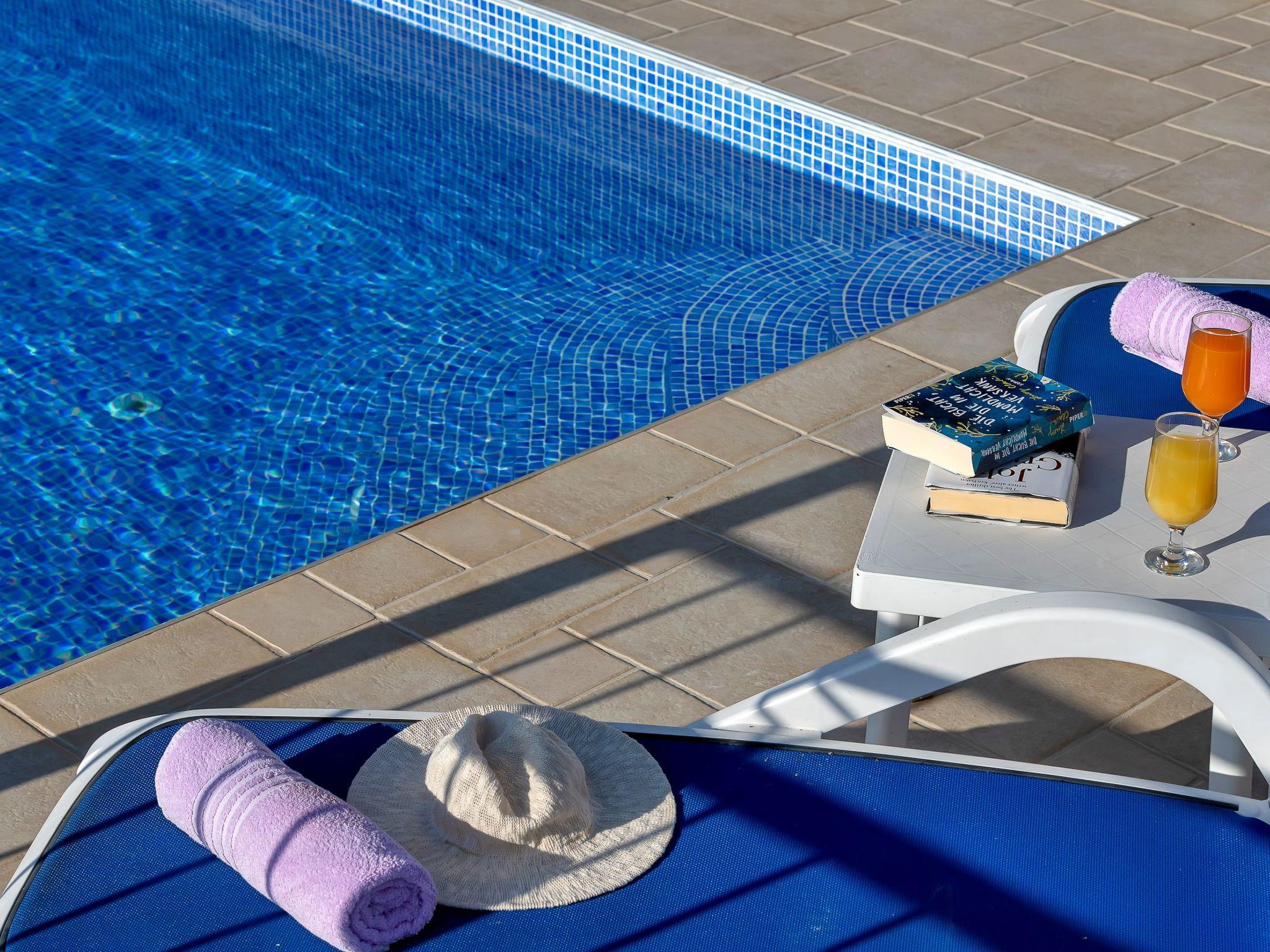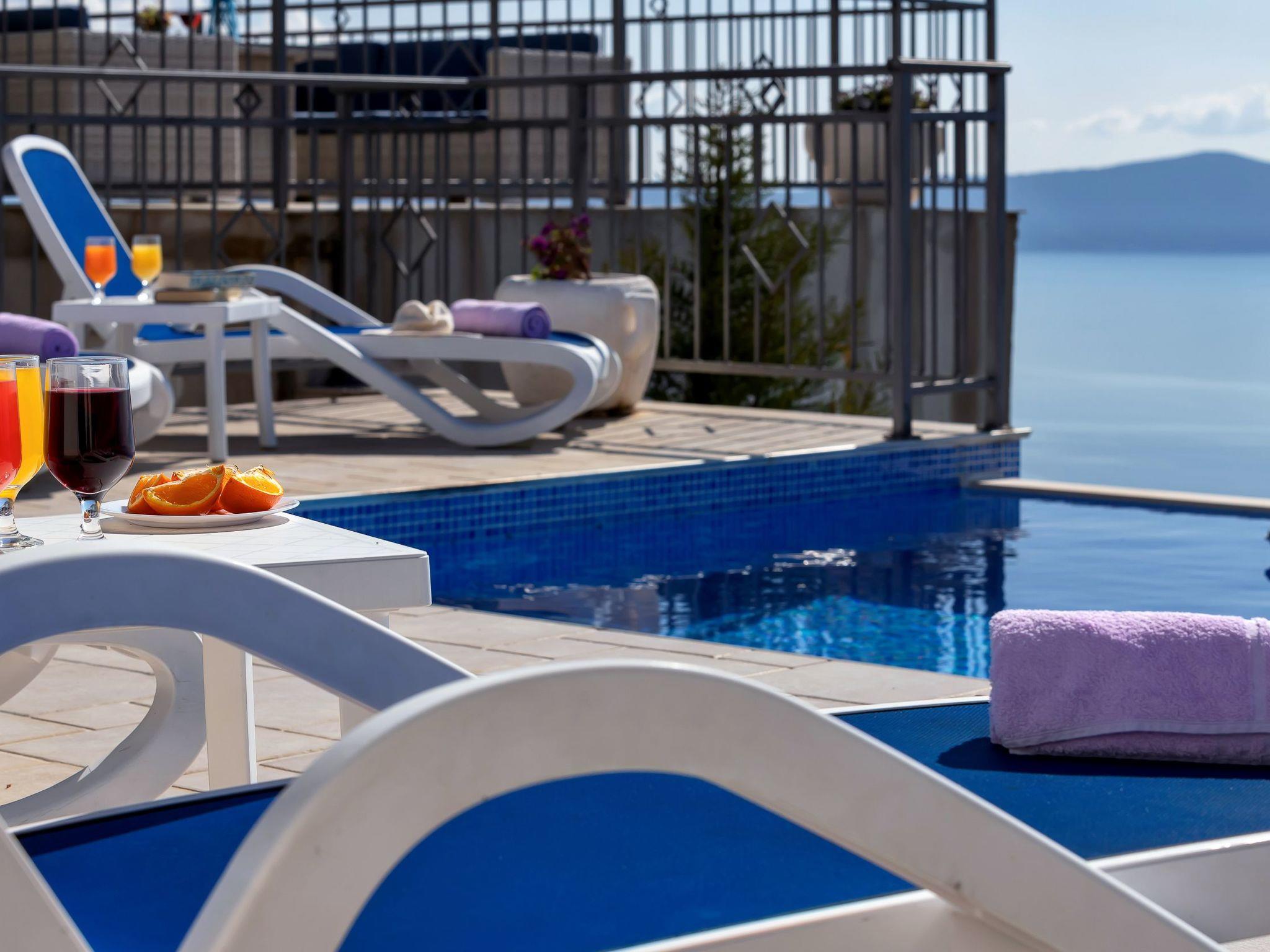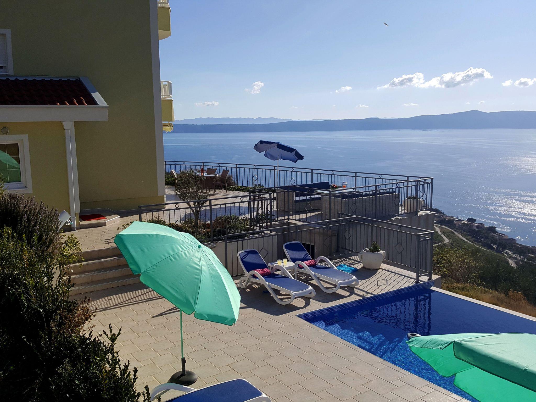 Outside there are a big terrace with a table and chairs for six people, a roofed summer kitchen with a gas grill and sink, and as a highlight the 30m² infinity pool. There are four sun loungers. Three private parking spaces are available.