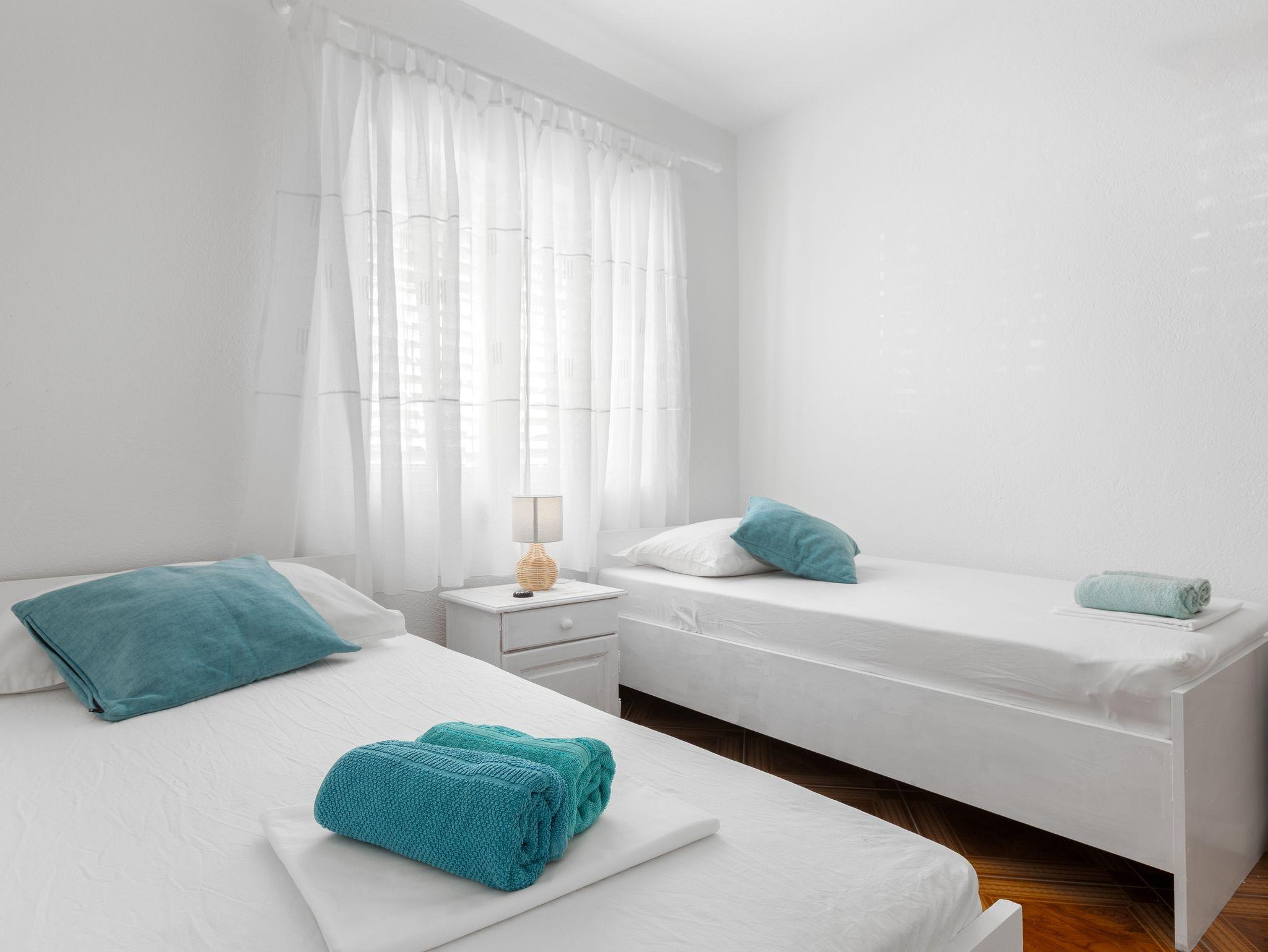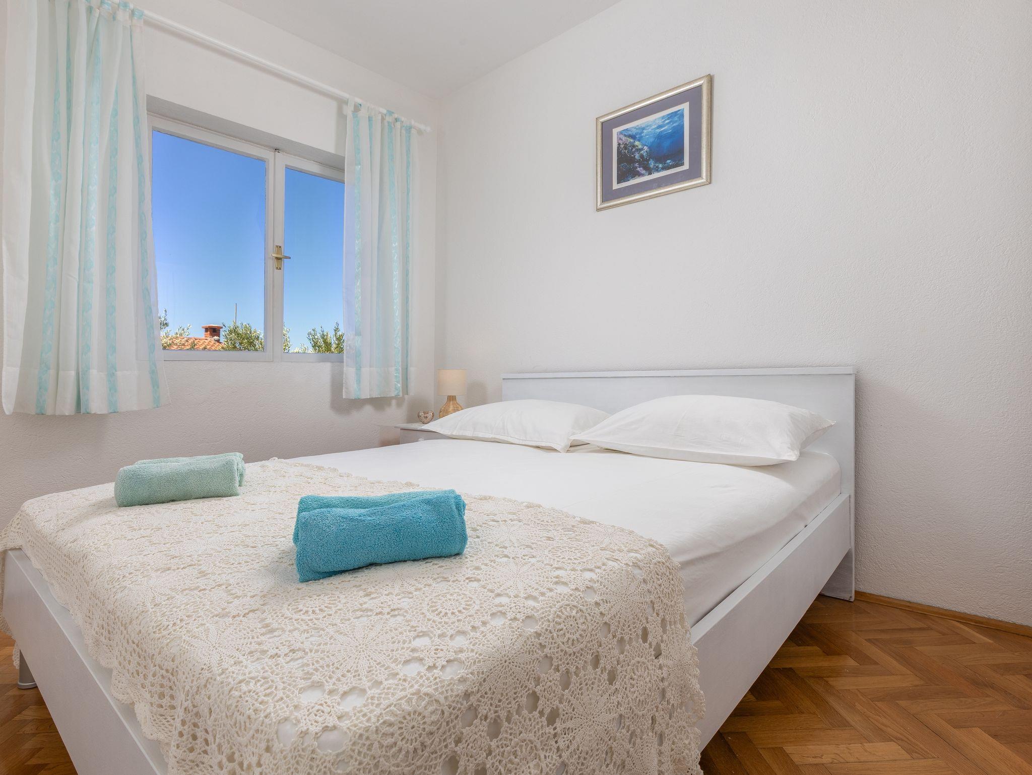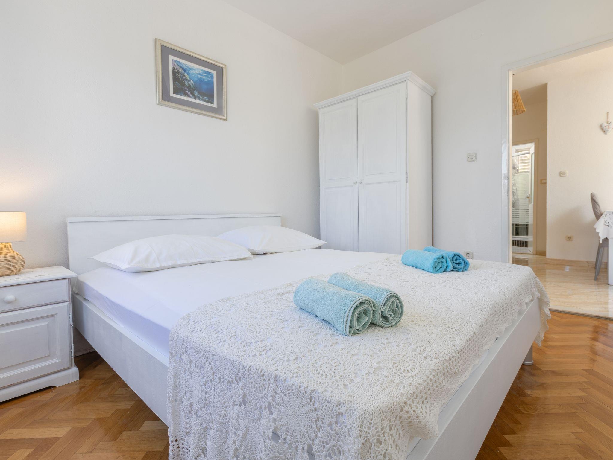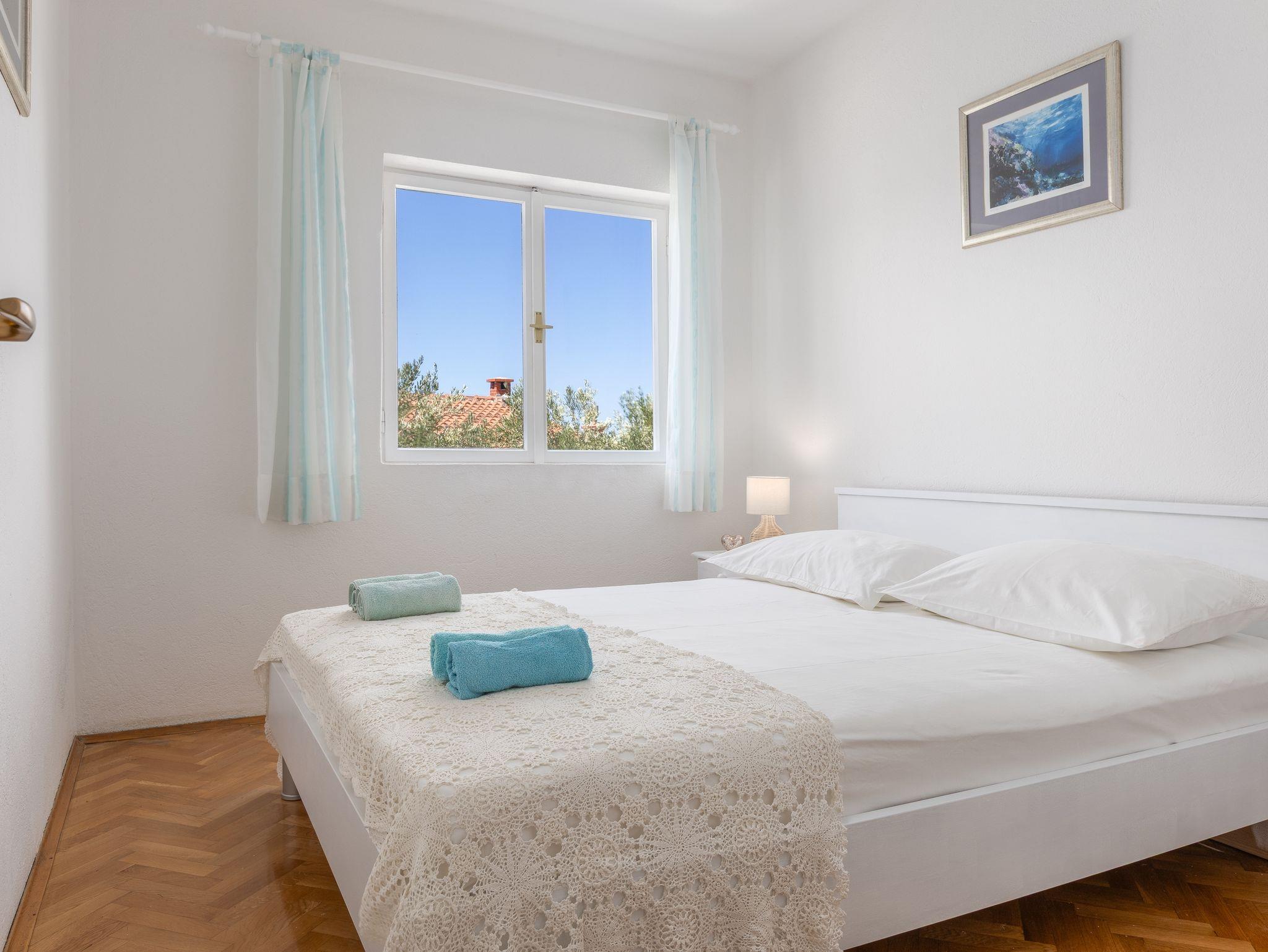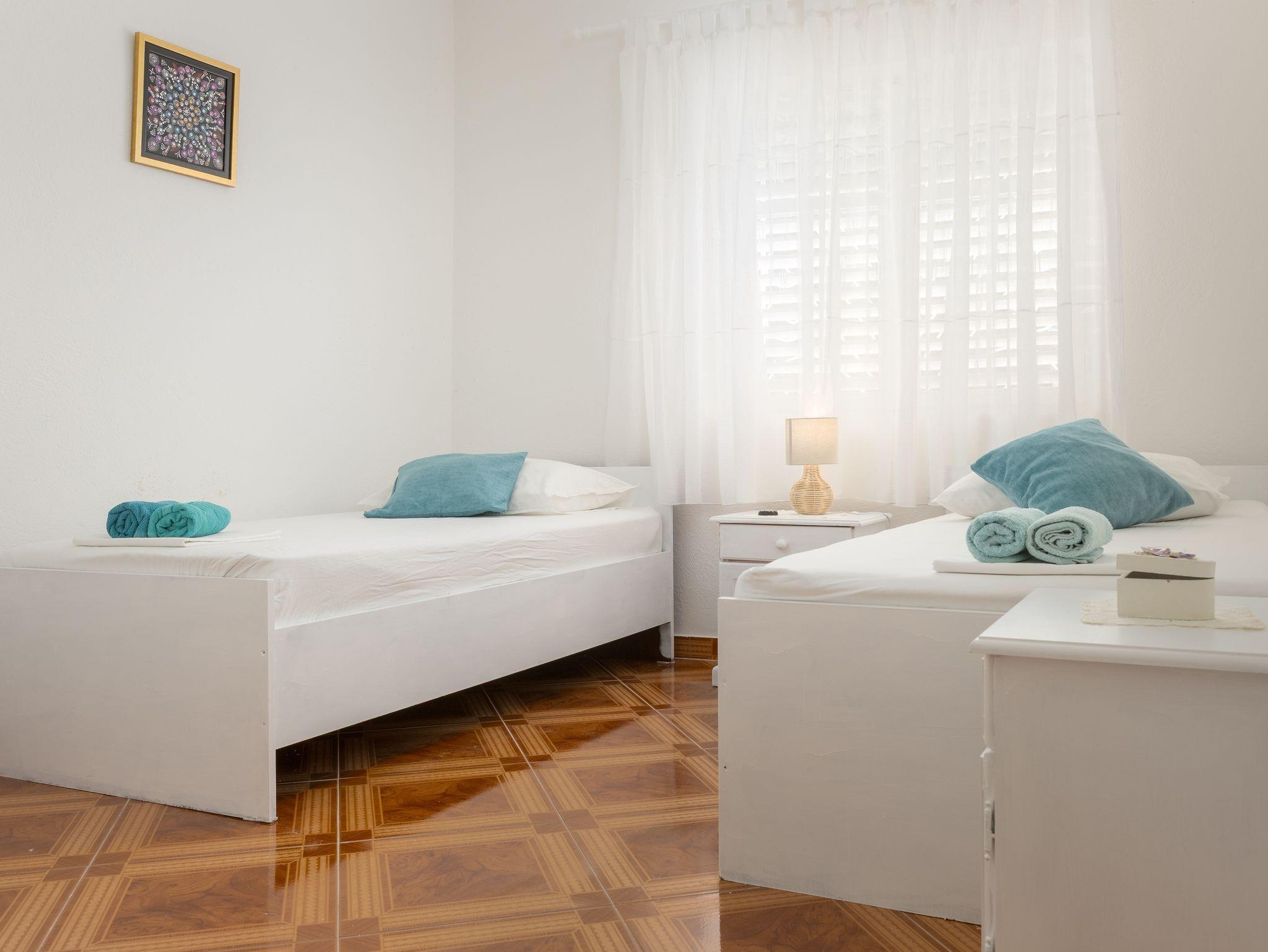 Ferienwohnung bietet Platz für 5 Gäste. Die Betten sind in Schlafzimmern, die es 2 gibt, und in Wohnzimmer, innerhalb einer Gesamtfläche von 50m2, angeordnet. Die Gäste haben eine eigene Terrasse zur Verfügung, auf der sie in warmen Sommernächten genießen können. Das Apartment bietet Meerblick. IM PREIS INBEGRIFFEN: Kurtaxe, Endreinigung, Klimatisierung, Parkplatz, Internet, Wäschewaschen, Kinderbett, Bügeleisen, Bügelbrett, Föhn. VERBINDLICHE ZUSÄTZLICHE KOSTEN: Aufzahlung für Kurzaufenthalte (prozentualer Zuschlag pro Nächtigungsanzahl: 30% - 1, 20% - 2, 10% - 3). Die Verfügbarkeit zusätzlicher Dienstleistungen in Ihrem reservierten Termin und die Preise derselben (falls nicht aufgeführt) müssen im Voraus überprüft werden. Zusätzliche Dienstleistungen die in der Zahlungsaufforderung nicht aufgeführt sind werden direkt beim Vermieter bezahlt, angenommen der Gast nutzt auch diese.