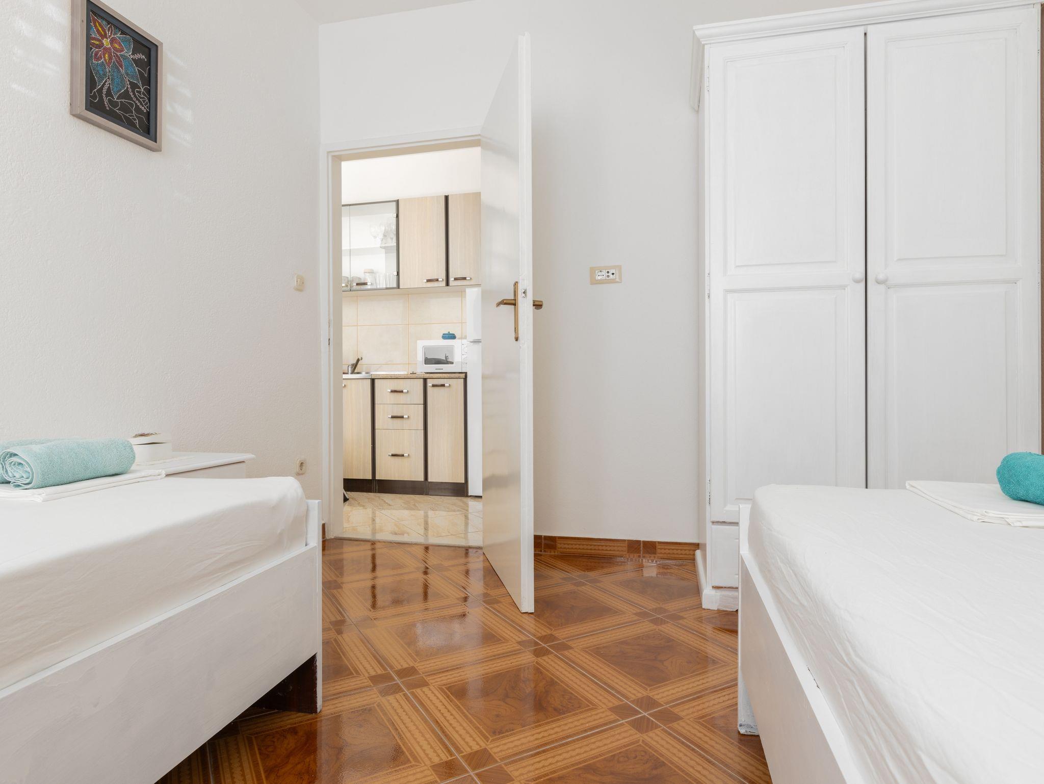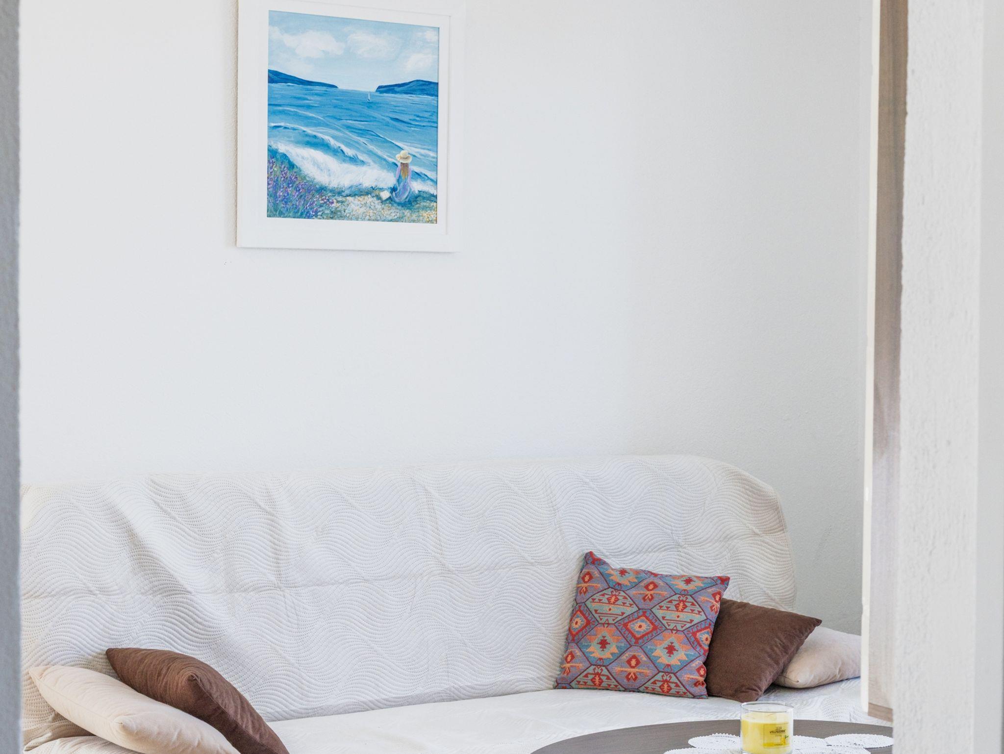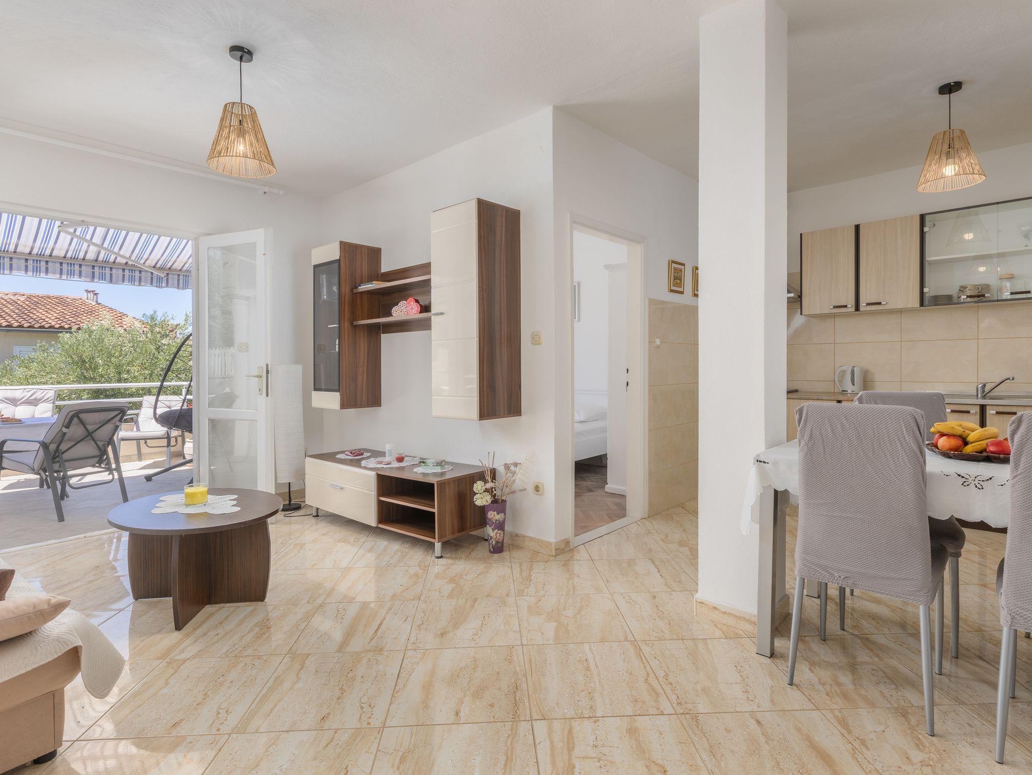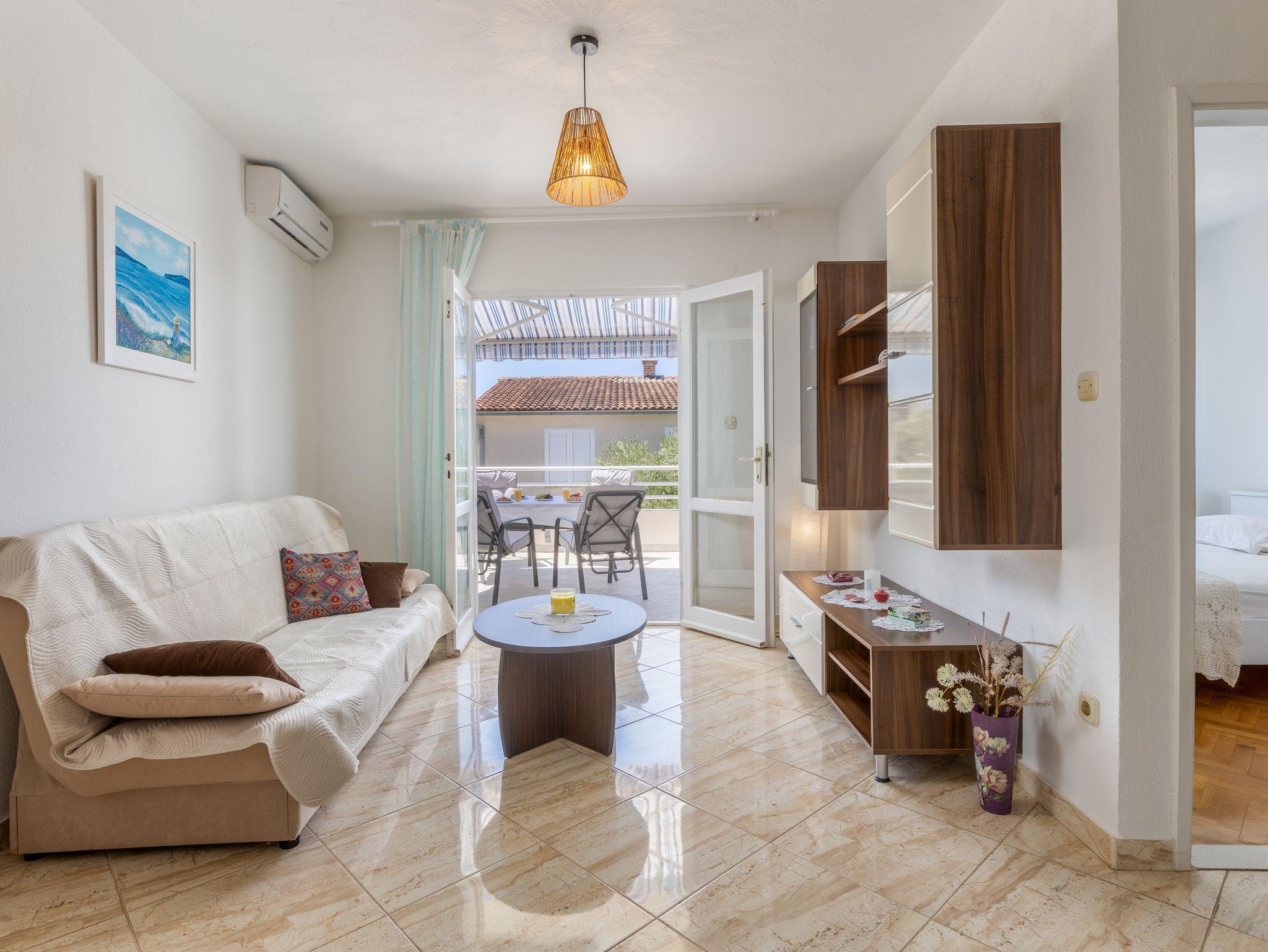 Ferienwohnung bietet Platz für 5 Gäste. Die Betten sind in Schlafzimmern, die es 2 gibt, und in Wohnzimmer, innerhalb einer Gesamtfläche von 50m2, angeordnet. Die Gäste haben eine eigene Terrasse zur Verfügung, auf der sie in warmen Sommernächten genießen können. Das Apartment bietet Meerblick. IM PREIS INBEGRIFFEN: Kurtaxe, Endreinigung, Klimatisierung, Parkplatz, Internet, Wäschewaschen, Kinderbett, Bügeleisen, Bügelbrett, Föhn. VERBINDLICHE ZUSÄTZLICHE KOSTEN: Aufzahlung für Kurzaufenthalte (prozentualer Zuschlag pro Nächtigungsanzahl: 30% - 1, 20% - 2, 10% - 3). Die Verfügbarkeit zusätzlicher Dienstleistungen in Ihrem reservierten Termin und die Preise derselben (falls nicht aufgeführt) müssen im Voraus überprüft werden. Zusätzliche Dienstleistungen die in der Zahlungsaufforderung nicht aufgeführt sind werden direkt beim Vermieter bezahlt, angenommen der Gast nutzt auch diese.