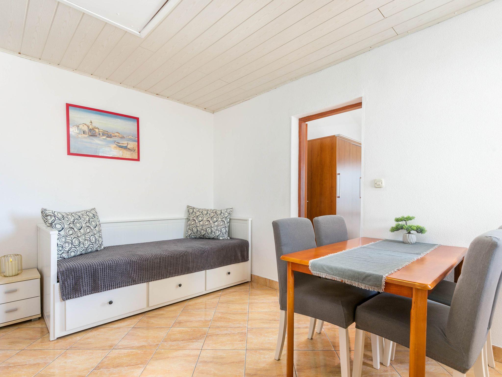 Ferienwohnung bietet Platz für 4 Gäste. Die Betten sind in Schlafzimmern, die es 2 gibt, innerhalb einer Gesamtfläche von 42m2, angeordnet. Die Gäste haben einen eigenen Balkon zur Verfügung, auf der sie in warmen Sommernächten genießen können. Das Apartment bietet Meerblick. Es ist erlaubt, Speisen auf dem Gemeinschafts-Grill vorzubereiten. IM PREIS INBEGRIFFEN: Kurtaxe, Endreinigung, Klimatisierung, Parkplatz, Internet, Wäschewaschen, Kinderbett, Bügeleisen, Bügelbrett. VERBINDLICHE ZUSÄTZLICHE KOSTEN: Aufzahlung für Kurzaufenthalte (prozentualer Zuschlag pro Nächtigungsanzahl: 30% - 1, 20% - 2, 10% - 3). Die Verfügbarkeit zusätzlicher Dienstleistungen in Ihrem reservierten Termin und die Preise derselben (falls nicht aufgeführt) müssen im Voraus überprüft werden. Zusätzliche Dienstleistungen die in der Zahlungsaufforderung nicht aufgeführt sind werden direkt beim Vermieter bezahlt, angenommen der Gast nutzt auch diese. Ermäßigung auf den Grundpreis: Gratistag 14=13 (bei einem Aufenthalt von 14 Tagen oder mehr erhalten Sie einen Gratistag für den Aufenthalt bis 31.12.26).