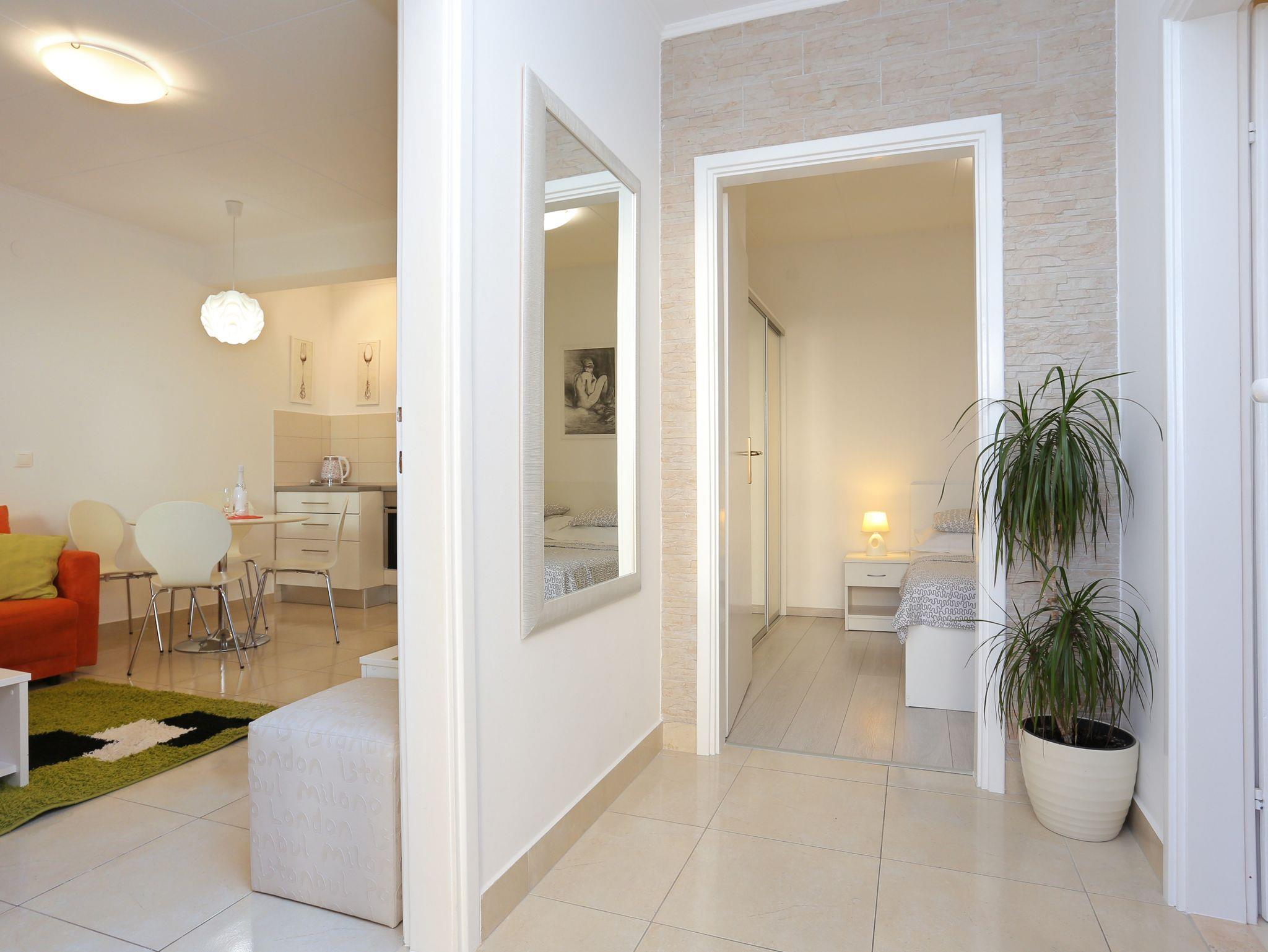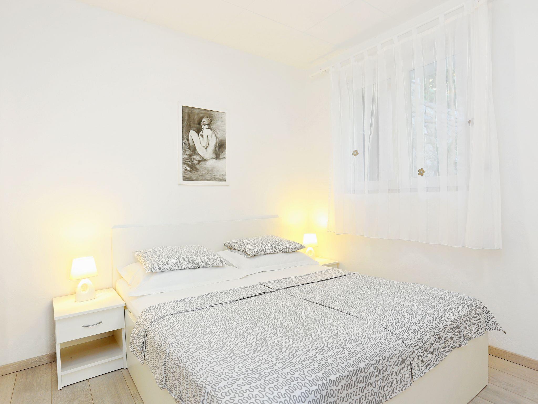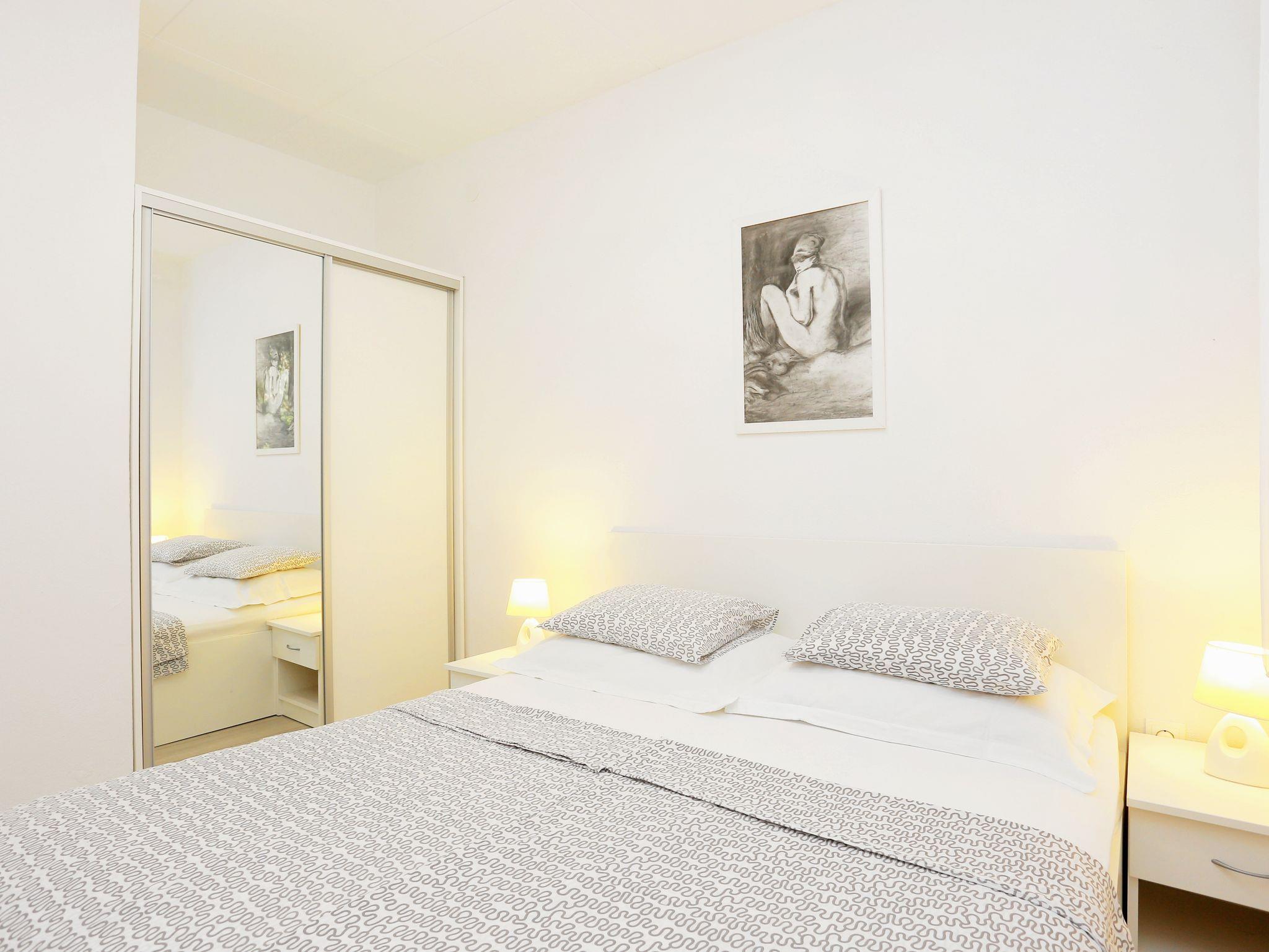 Ferienwohnung bietet Platz für 4 Gäste. Die Betten sind in Schlafzimmern, die es 1 gibt, und in Wohnzimmer, innerhalb einer Gesamtfläche von 31m2, angeordnet. Die Gäste haben eine eigene Terrasse zur Verfügung, auf der sie in warmen Sommernächten genießen können. Das Apartment bietet Meerblick. Es ist erlaubt, Speisen auf dem Gemeinschafts-Grill vorzubereiten. IM PREIS INBEGRIFFEN: Kurtaxe, Endreinigung, Klimatisierung, Parkplatz, Internet, Kinderbett, Bügeleisen, Föhn. VERBINDLICHE ZUSÄTZLICHE KOSTEN: Aufzahlung für Kurzaufenthalte (prozentualer Zuschlag pro Nächtigungsanzahl: 30% - 1, 20% - 2, 10% - 3). Die Verfügbarkeit zusätzlicher Dienstleistungen in Ihrem reservierten Termin und die Preise derselben (falls nicht aufgeführt) müssen im Voraus überprüft werden. Zusätzliche Dienstleistungen die in der Zahlungsaufforderung nicht aufgeführt sind werden direkt beim Vermieter bezahlt, angenommen der Gast nutzt auch diese.
