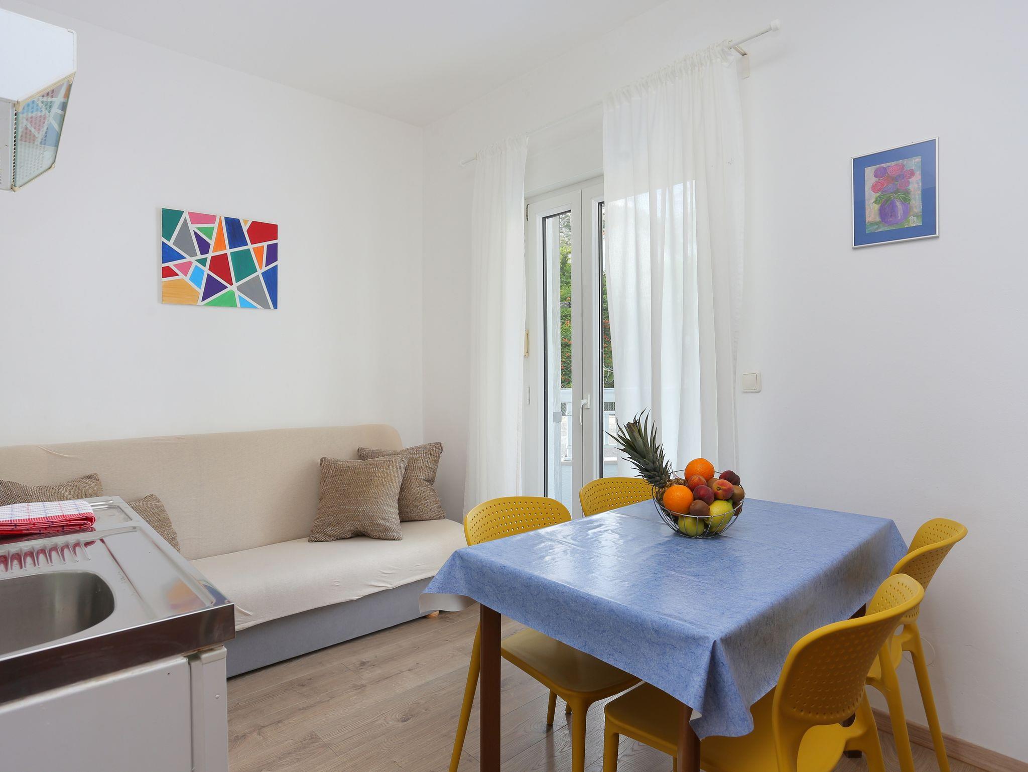 Ferienwohnung bietet Platz für 4 Gäste. Die Betten sind in Schlafzimmern, die es 1 gibt, und in Esszimmer, innerhalb einer Gesamtfläche von 24m2, angeordnet. Die Gäste haben eine eigene Terrasse zur Verfügung, auf der sie in warmen Sommernächten genießen können. IM PREIS INBEGRIFFEN: Kurtaxe, Endreinigung, Klimatisierung, Parkplatz, Internet, Bügeleisen, Bügelbrett, Föhn. VERBINDLICHE ZUSÄTZLICHE KOSTEN: Aufzahlung für Kurzaufenthalte (prozentualer Zuschlag pro Nächtigungsanzahl: 30% - 1, 20% - 2, 10% - 3). UNVERBINDLICHE ZUSÄTZLICHE KOSTEN: Frühstück (7,00 €, 50% Nachlass für Kinder zwischen 4 und 12 Jahren, Kinder bis 4 Jahre sind frei.), Halbpension (15,00 €, 50% Nachlass für Kinder zwischen 4 und 12 Jahren, Kinder bis 4 Jahre sind frei.), Vollpension (23,00 €, 50% Nachlass für Kinder zwischen 4 und 12 Jahren, Kinder bis 4 Jahre sind frei.), Zusatzbett (10,00 € pro Nacht). Die Verfügbarkeit zusätzlicher Dienstleistungen in Ihrem reservierten Termin und die Preise derselben (falls nicht aufgeführt) müssen im Voraus überprüft werden. Zusätzliche Dienstleistungen die in der Zahlungsaufforderung nicht aufgeführt sind werden direkt beim Vermieter bezahlt, angenommen der Gast nutzt auch diese. Ermäßigung auf den Grundpreis: Gratistag 14=13 (bei einem Aufenthalt von 14 Tagen oder mehr erhalten Sie einen Gratistag für den Aufenthalt bis 31.12.26).