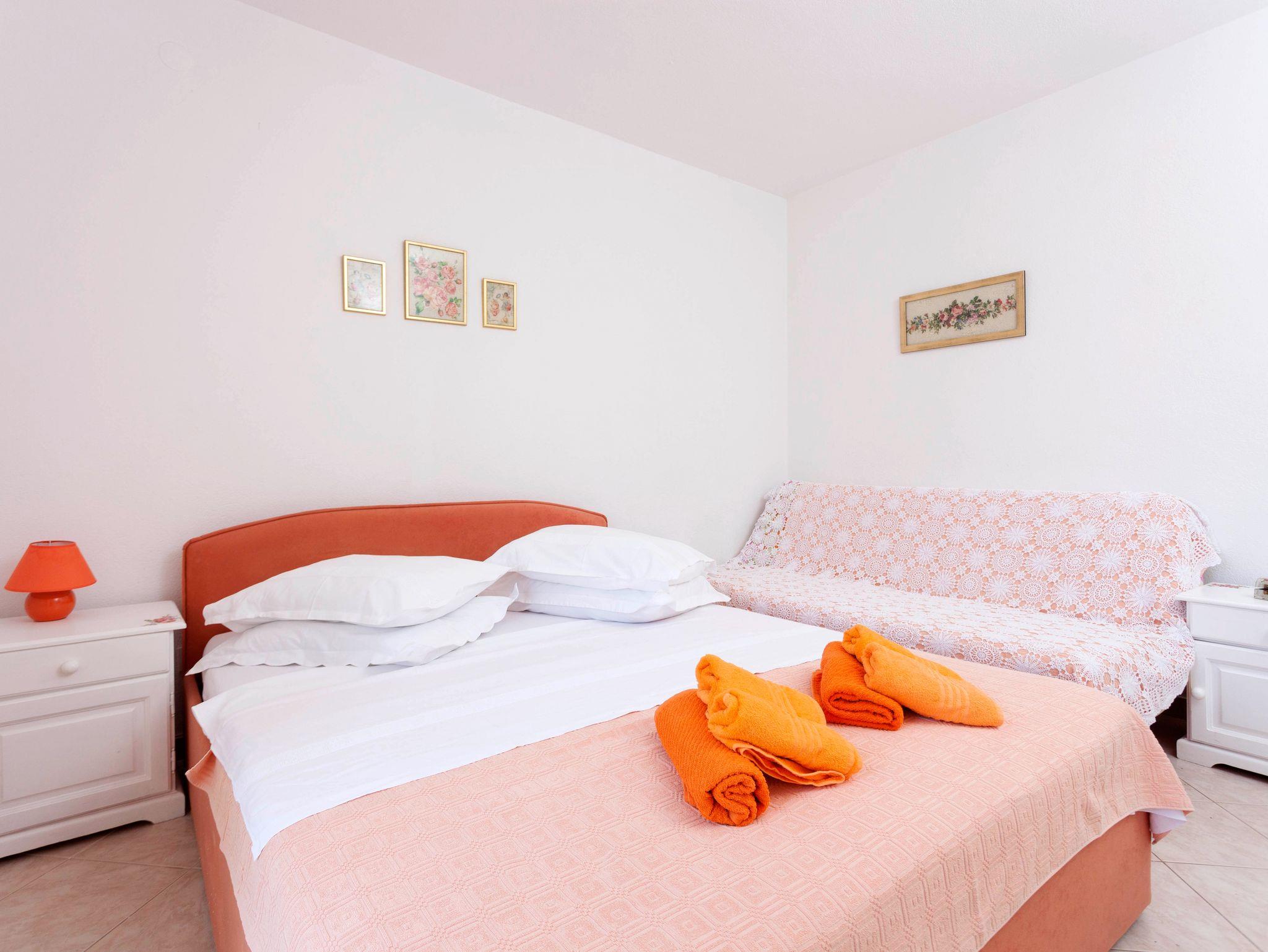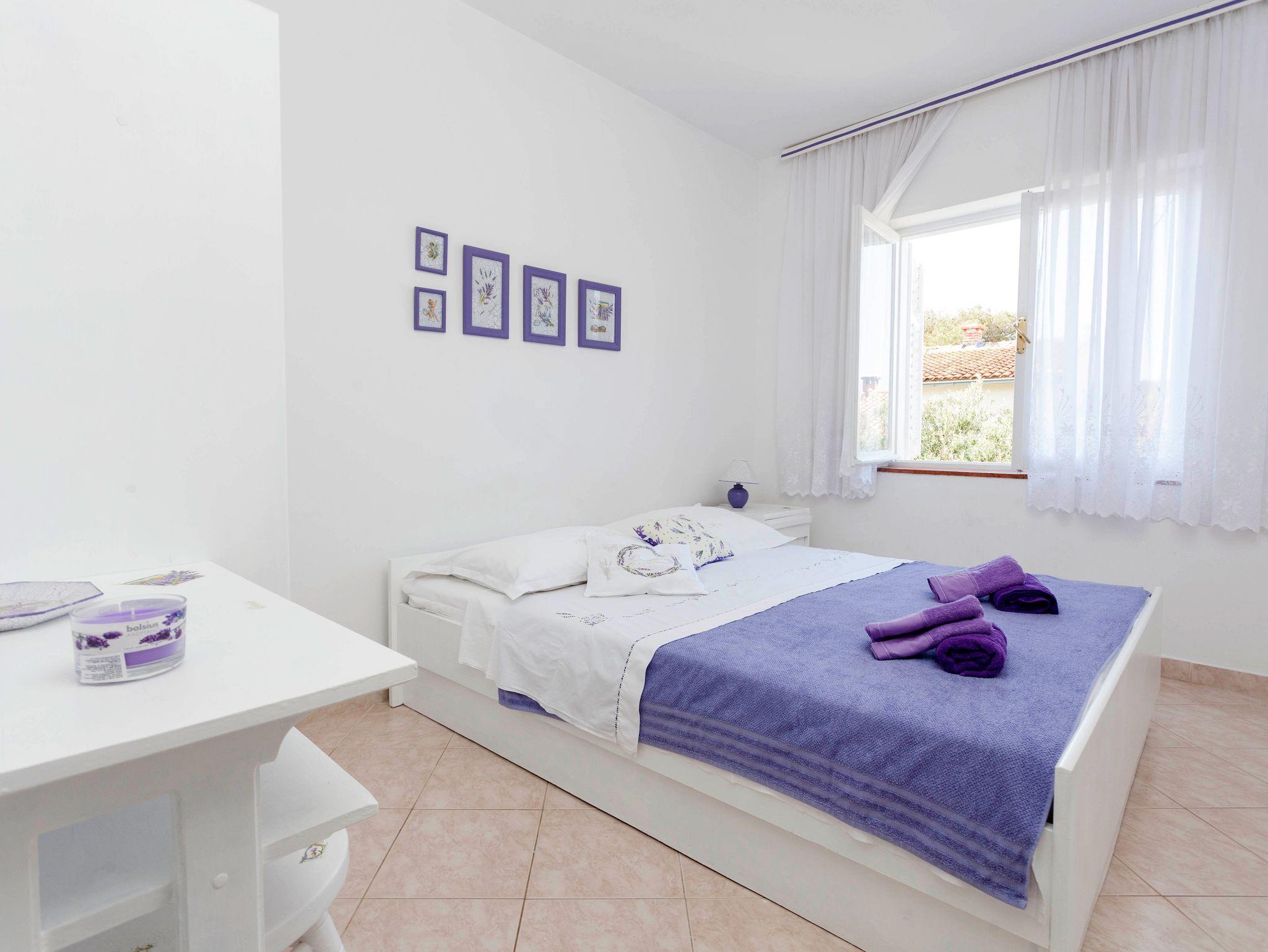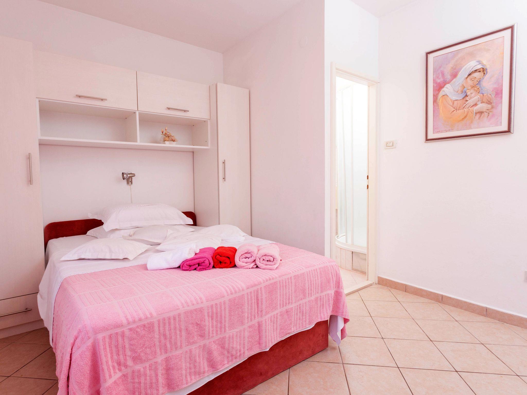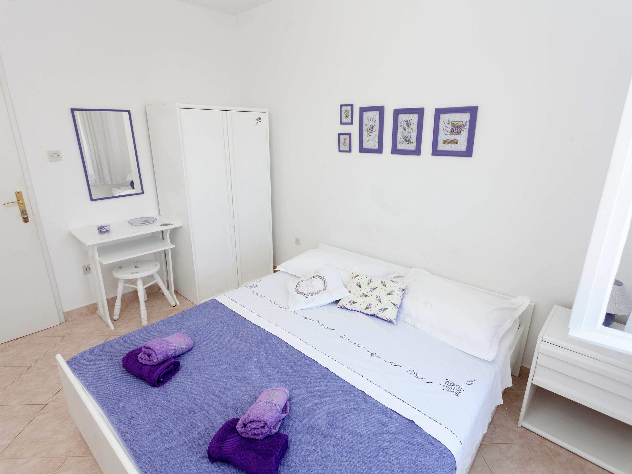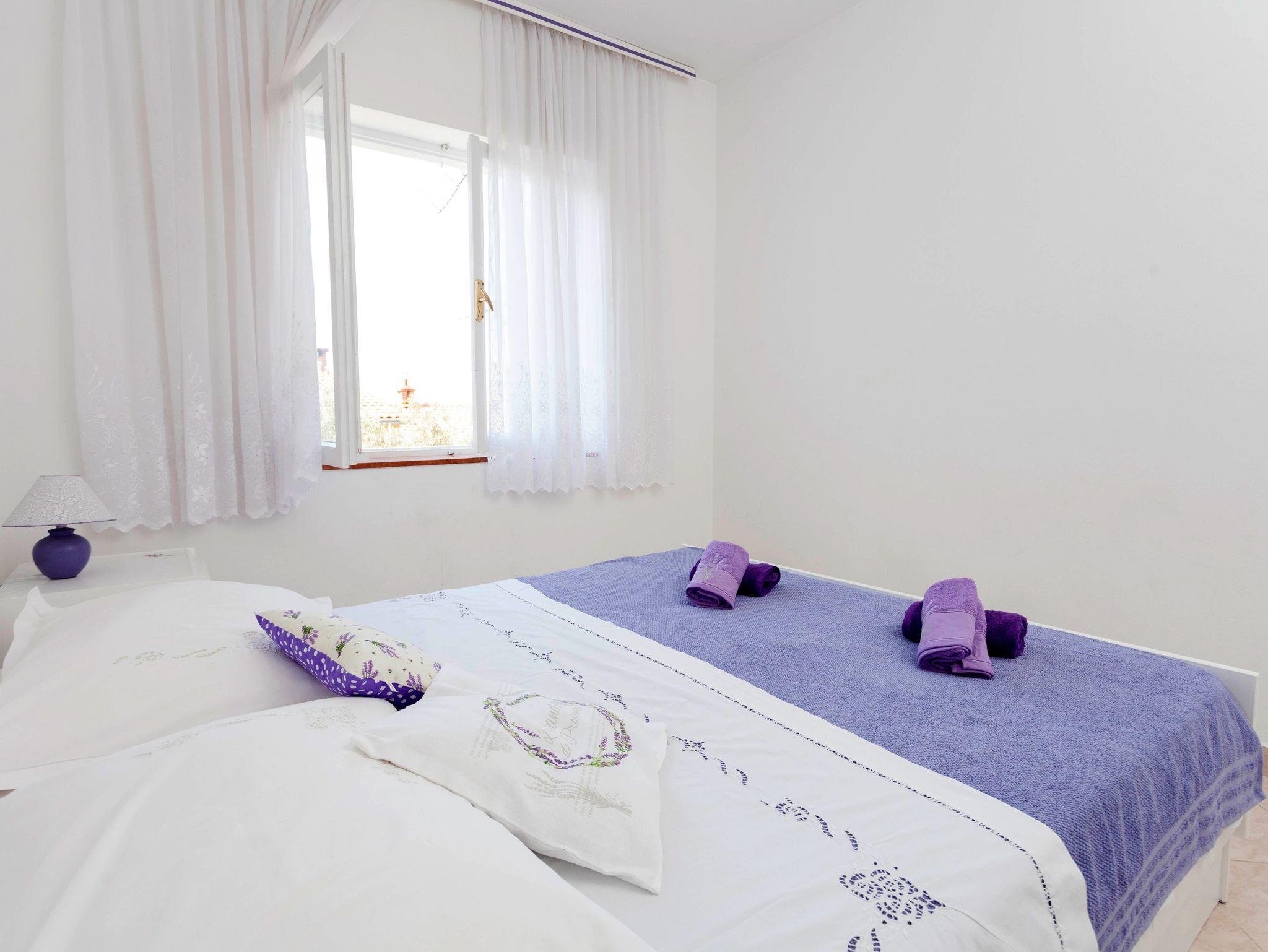 Ferienwohnung bietet Platz für 8 Gäste. Die Betten sind in Schlafzimmern, die es 3 gibt, innerhalb einer Gesamtfläche von 44m2, angeordnet. Die Gäste haben eine eigene Terrasse zur Verfügung, auf der sie in warmen Sommernächten genießen können. Das Apartment bietet Meerblick. Für vollen Genuss und Entspannung gibt es einen privaten Grill für Gäste dieser Unterkunft. Räume der gebuchten Unterkunftseinheit werden nicht in eine Ganze verbunden. Unterkunftseinheit hat Räume, die von dem Rest der Einheit abgetrennt werden. Eingang in die Unterkunftseinheit ist nicht mit einer Tür von anderen Räumen des Objektes getrennt. IM PREIS INBEGRIFFEN: Kurtaxe, Endreinigung, Klimatisierung, Parkplatz, Internet, Wäschewaschen, Kinderbett, Bügeleisen, Bügelbrett, Föhn. VERBINDLICHE ZUSÄTZLICHE KOSTEN: Aufzahlung für Kurzaufenthalte (prozentualer Zuschlag pro Nächtigungsanzahl: 30% - 1, 20% - 2, 10% - 3). Die Verfügbarkeit zusätzlicher Dienstleistungen in Ihrem reservierten Termin und die Preise derselben (falls nicht aufgeführt) müssen im Voraus überprüft werden. Zusätzliche Dienstleistungen die in der Zahlungsaufforderung nicht aufgeführt sind werden direkt beim Vermieter bezahlt, angenommen der Gast nutzt auch diese.