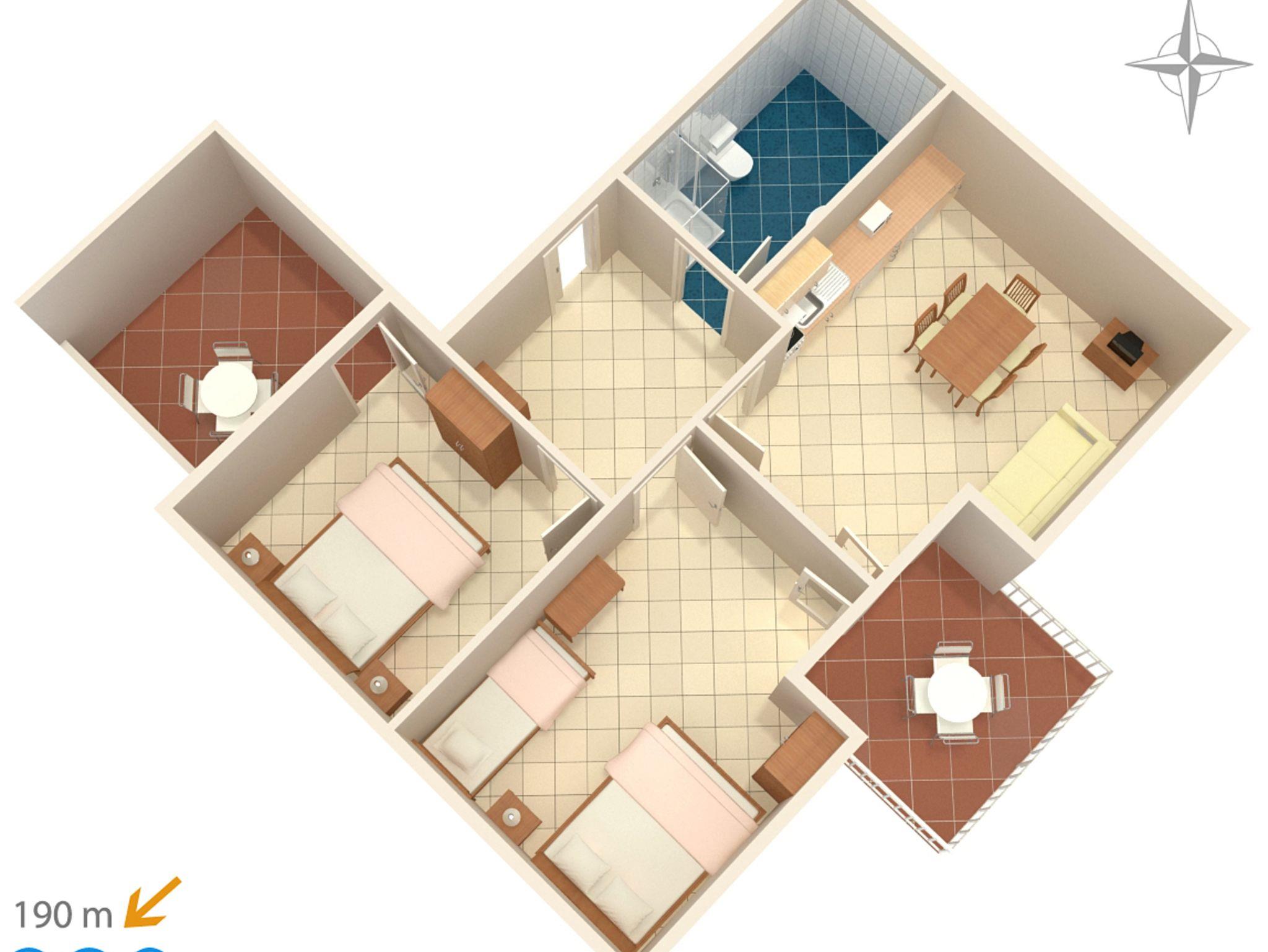 Ferienwohnung bietet Platz für 5 Gäste. Die Betten sind in Schlafzimmern, die es 2 gibt, innerhalb einer Gesamtfläche von 54m2, angeordnet. Die Gäste haben eine eigene Terrasse zur Verfügung, auf der sie in warmen Sommernächten genießen können. Das Apartment bietet Meerblick. IM PREIS INBEGRIFFEN: Kurtaxe, Endreinigung, Klimatisierung, Parkplatz, Internet, Wäschewaschen, Kinderbett, Bügeleisen, Bügelbrett, Föhn. VERBINDLICHE ZUSÄTZLICHE KOSTEN: Aufzahlung für Kurzaufenthalte (prozentualer Zuschlag pro Nächtigungsanzahl: 30% - 1, 20% - 2, 10% - 3). Die Verfügbarkeit zusätzlicher Dienstleistungen in Ihrem reservierten Termin und die Preise derselben (falls nicht aufgeführt) müssen im Voraus überprüft werden. Zusätzliche Dienstleistungen die in der Zahlungsaufforderung nicht aufgeführt sind werden direkt beim Vermieter bezahlt, angenommen der Gast nutzt auch diese.