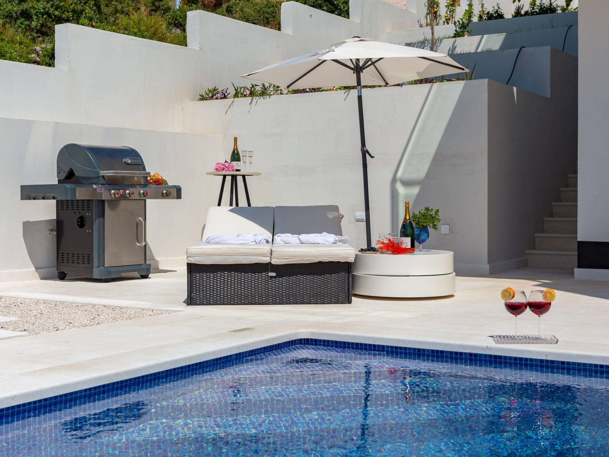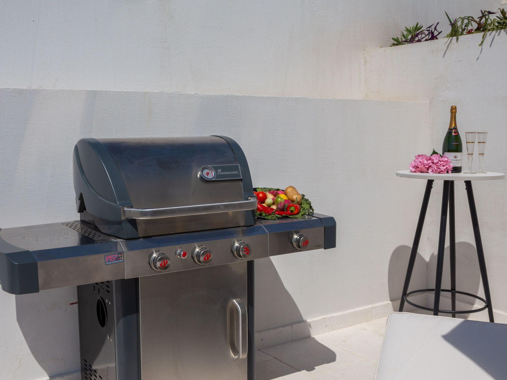 In the outdoor area there is a large dining table and sun loungers for 8 people, the sun loungers have storage tables with a cooling compartment. A large gas barbecue turns the barbecue party into a leisure highlight.