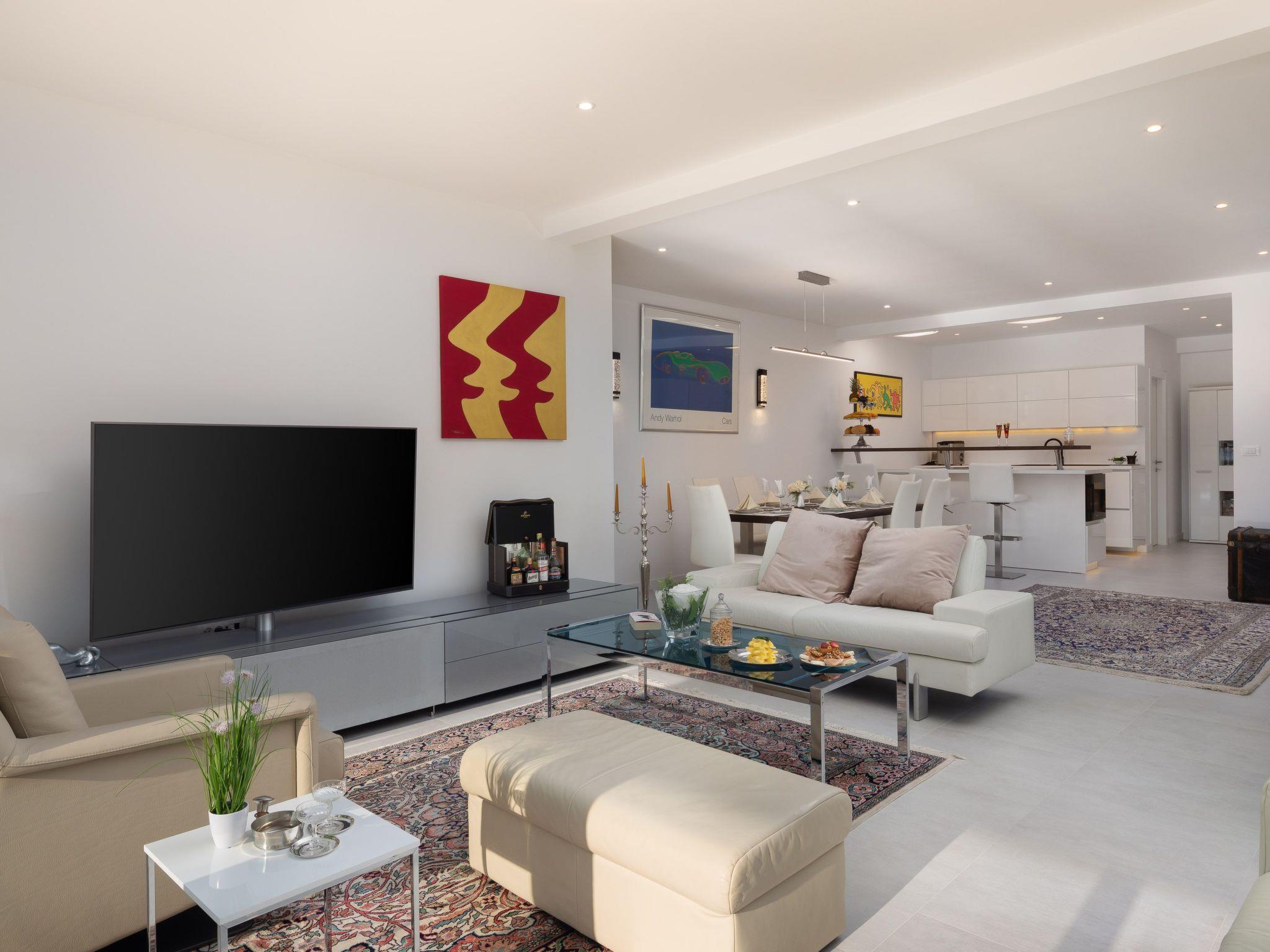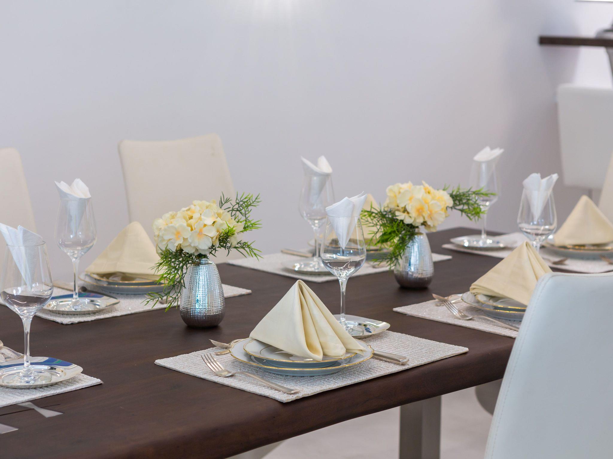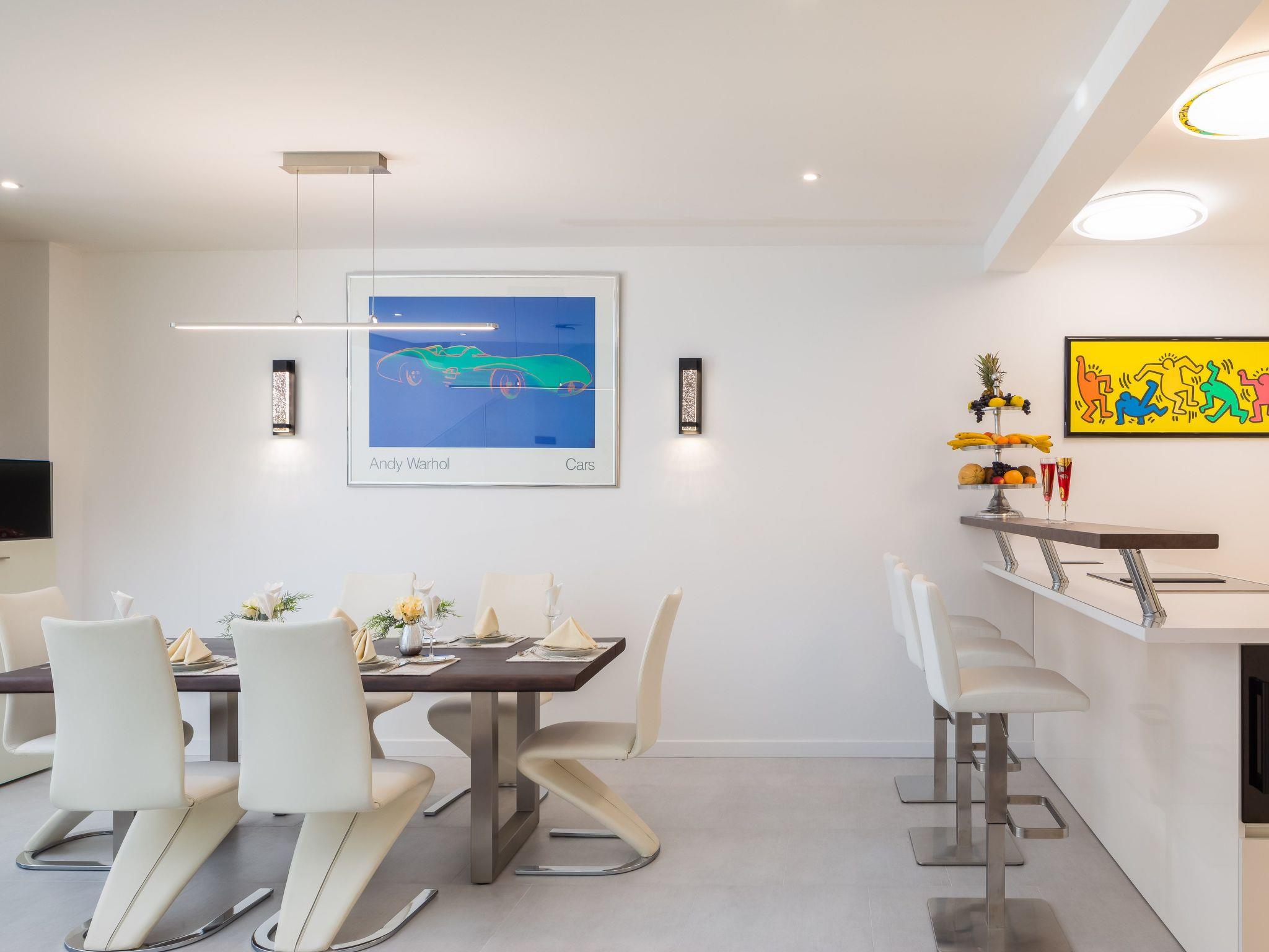 The villa was built in a modern style, all rooms are west-facing and there are stunning sea views from every bedroom. The rooms are all brightly decorated and furnished in a modern maritime style. Each bedroom has a Smart TV with internet access and the ability to watch Netflix, Prime, etc. The living room has a 65-inch screen and a Marshall jukebox that can be used to control Bluetooth and other sources. A total of 220 square metres of living space is available. The large living room with integrated dining room and designer kitchen guarantee pleasant evenings. All modern cooking facilities are available and invite you to enjoy.