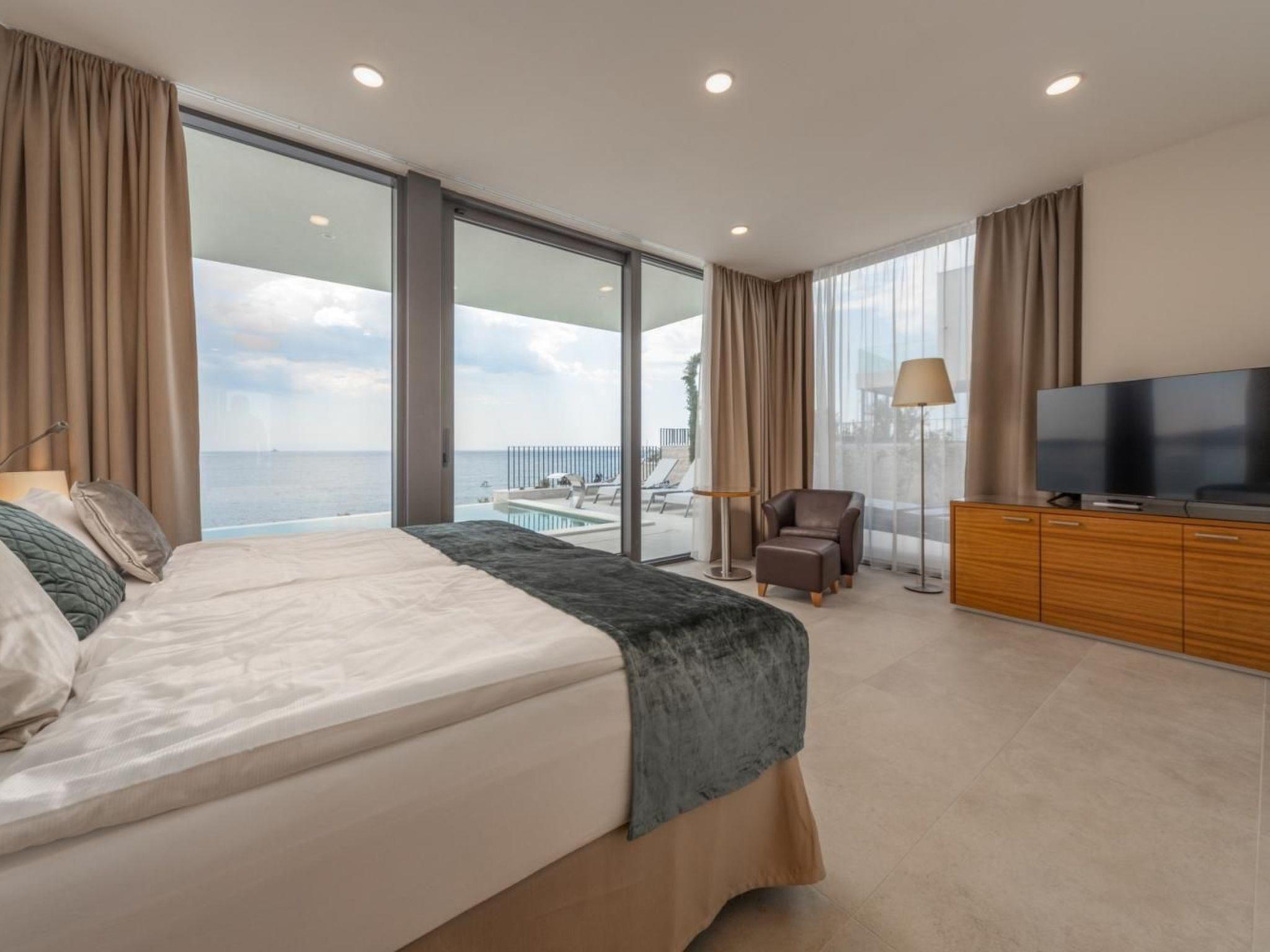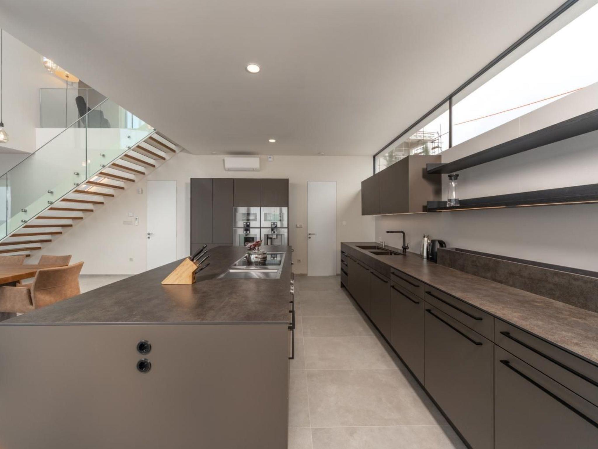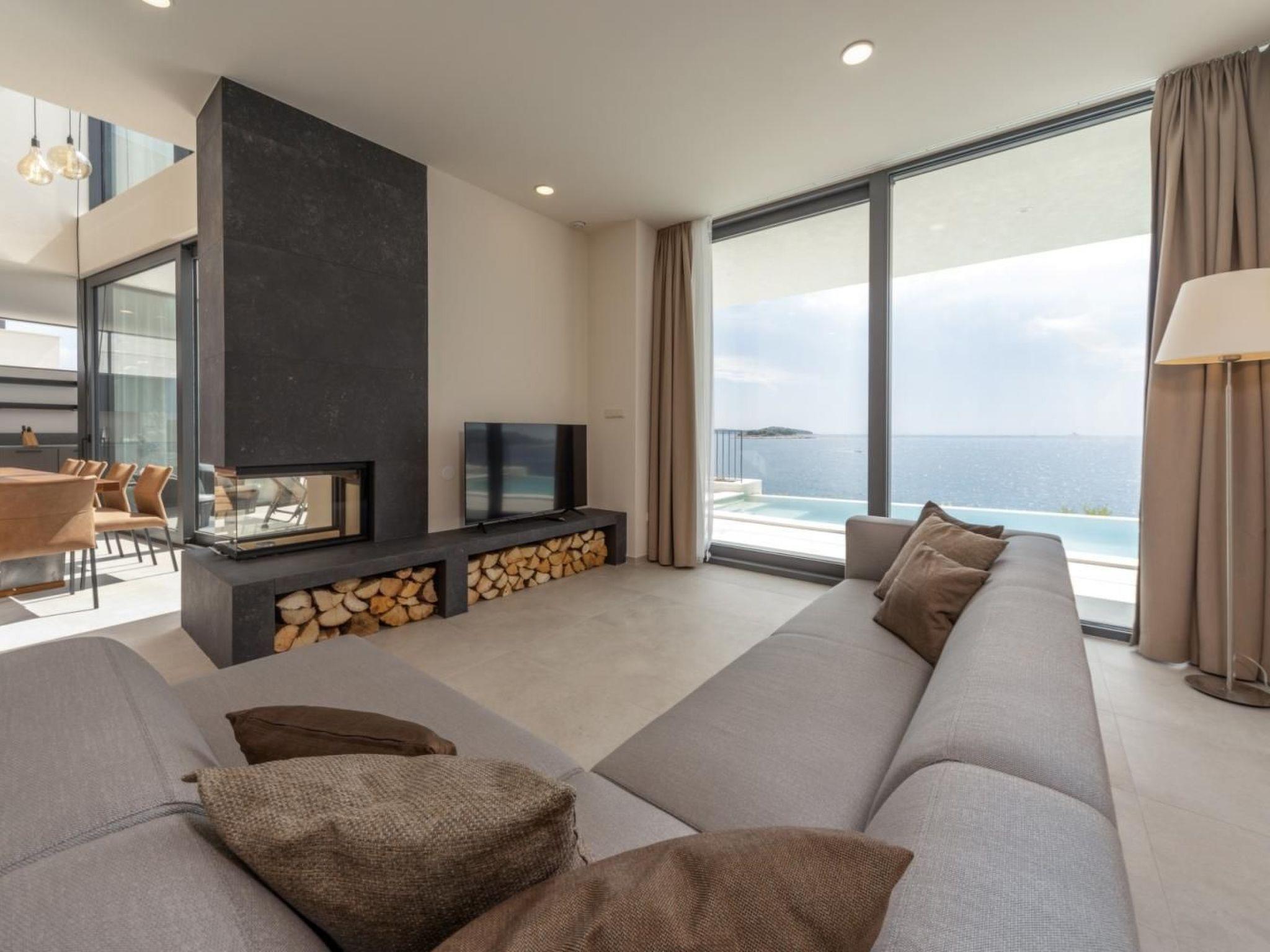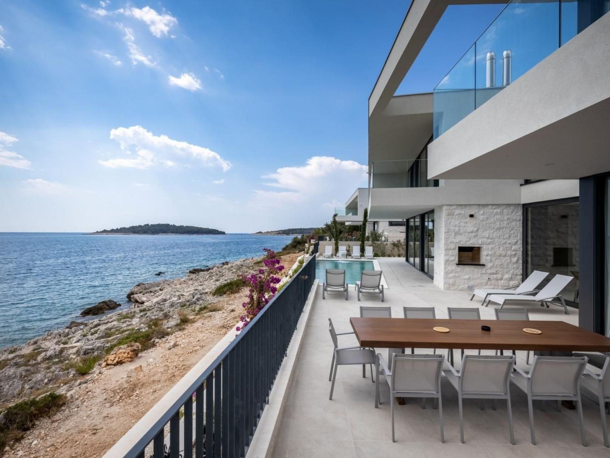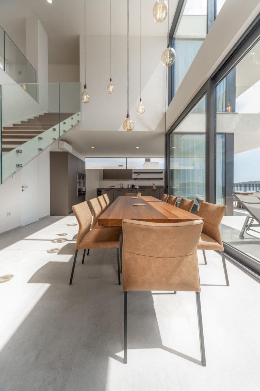 Luxurious postmodern architecture meets the quiet serenity of the Dalmatian coast in the beautiful 395 m2 five-bedroom Villa Esperia. The interior captures the crisp beauty of the Mediterranean, with its open-concept layout, its fresh neutral colours, and large windows welcoming in the generous summer sun. Cooler evenings can be enjoyed around the beautiful living room fireplace or in the outdoor dining area, eating a meal made using the outdoor stone house with fireplace or large modern fully equipped kitchen.