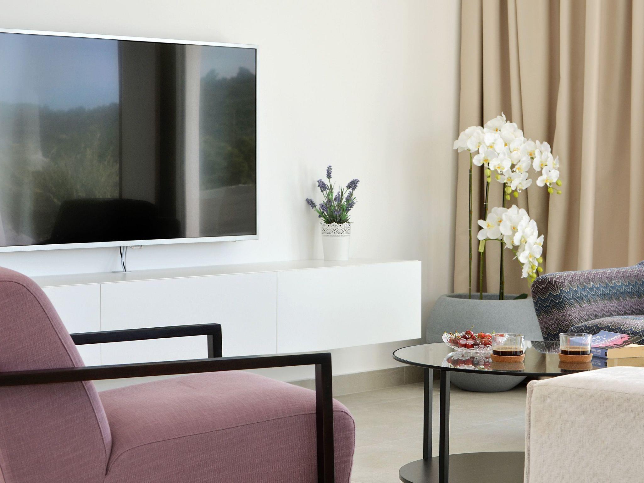 You will enjoy staying in 3 spacious bedrooms, each with a private bathroom complete with modern walk-in showers (plus there is a separate guest toilet). The three bedrooms are furnished with two double beds and two single beds. And there is an extra bed for a child. The modern kitchen is fully equipped and in the living area, you will find an extra-large flatscreen TV. Living space of 160 m².