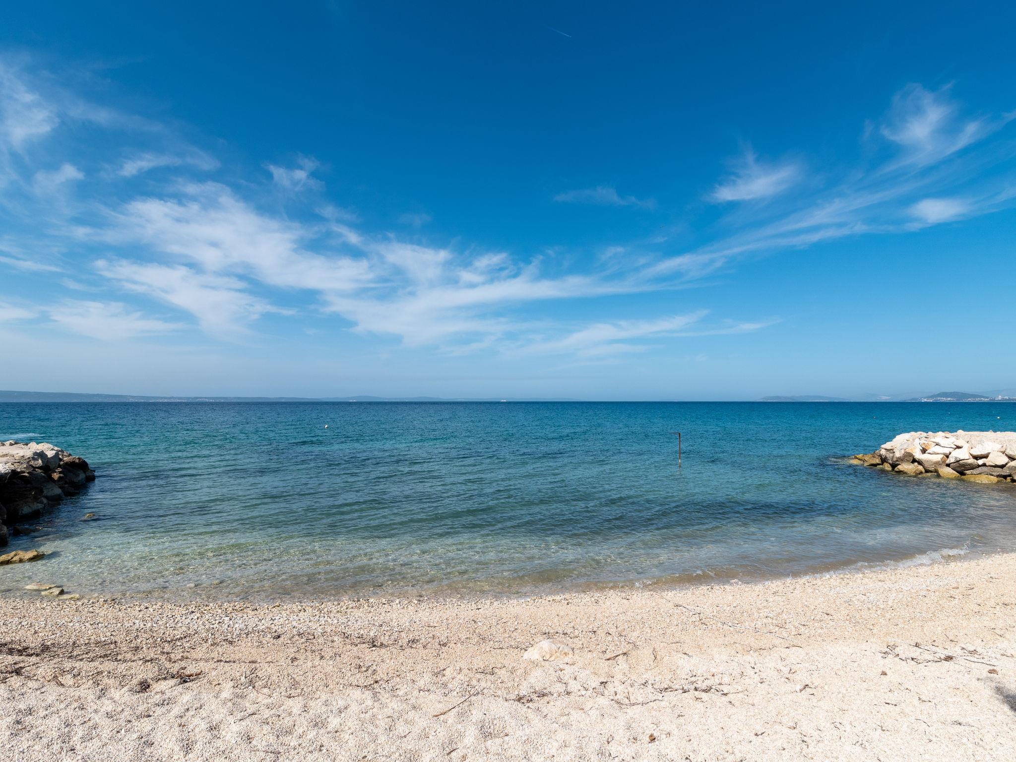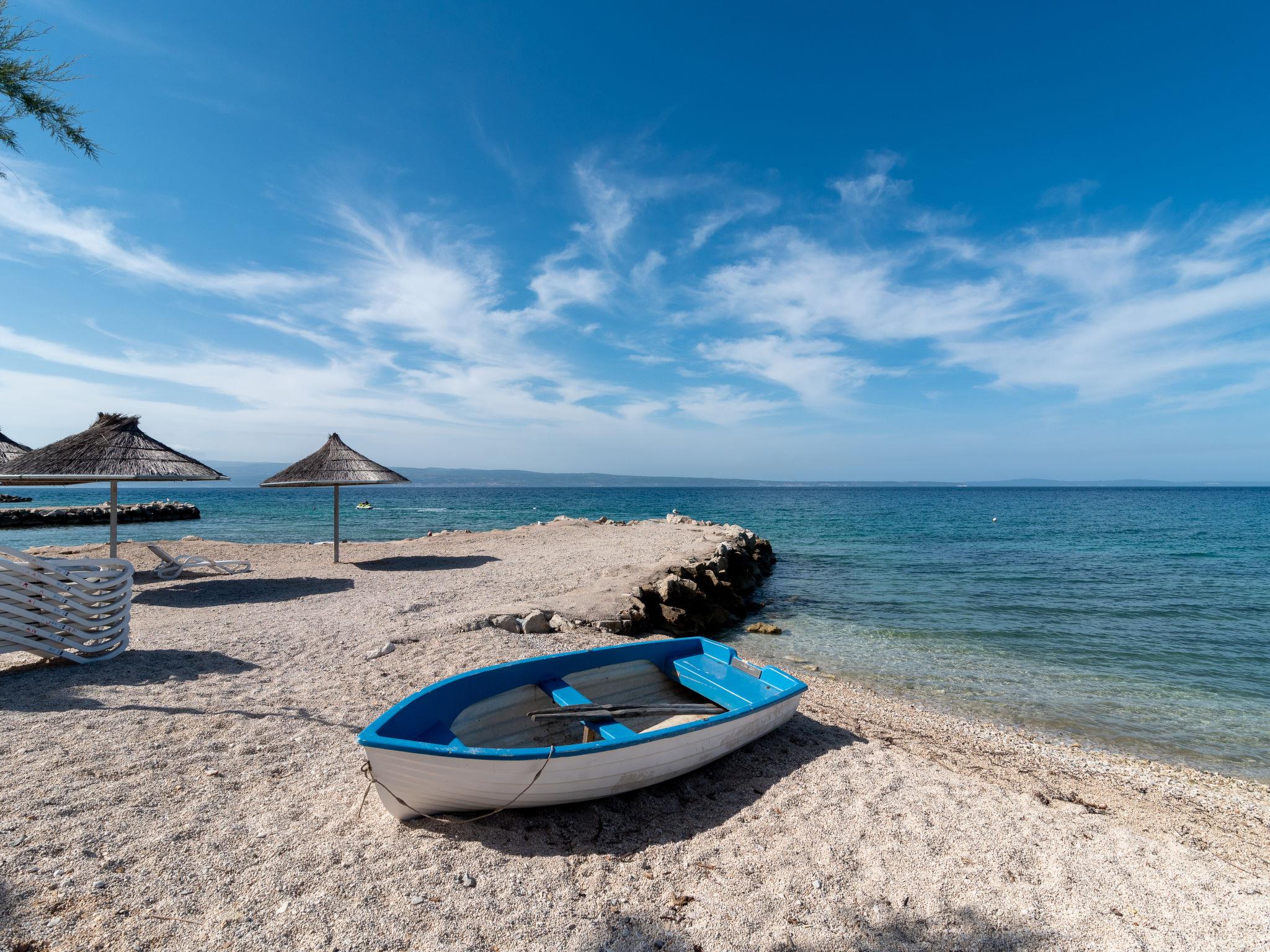 Apartment house. 500 m from the centre of Podstrana, 10 km from the centre of Split, in a sunny position, traffic calmed area, 5 m from the sea, 5 m from the beach, direct access to the beach. For shared use: property 300 m2. In the house: internet access, washing machine (for shared use). Parking at 400 m. Shop 100 m, restaurant 5 m, bus stop 240 m, pebble beach 5 m. Marina 3 km, tennis 3 km, riding stable 4 km. Please note: Loading and unloading of baggage is possible at the holiday house.