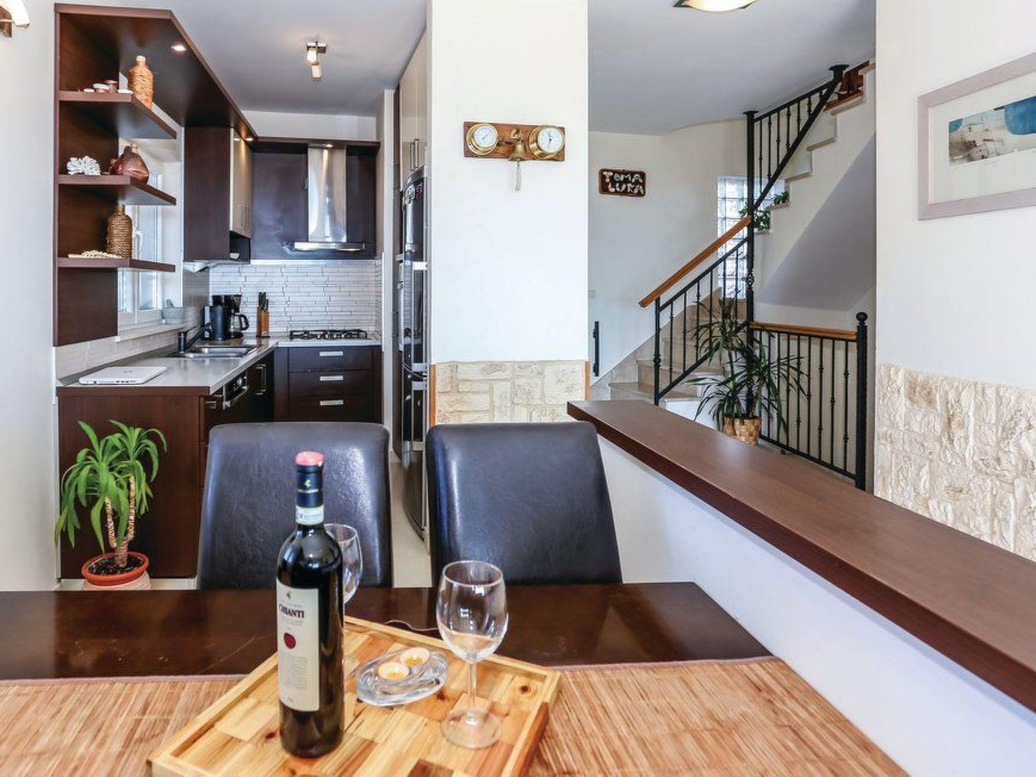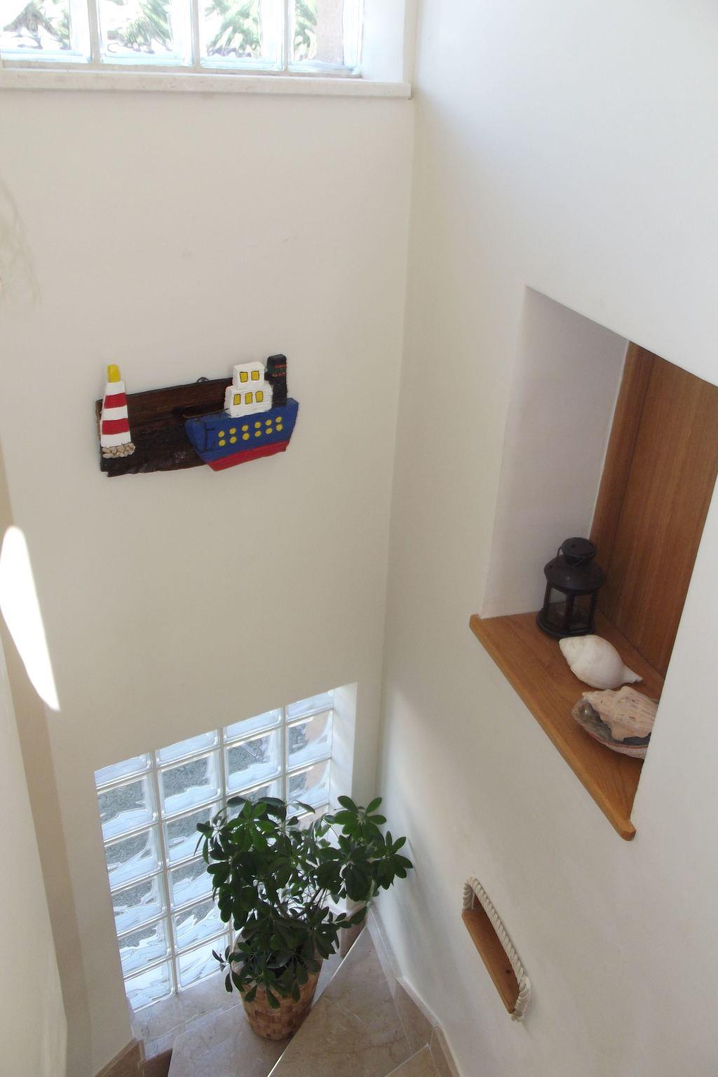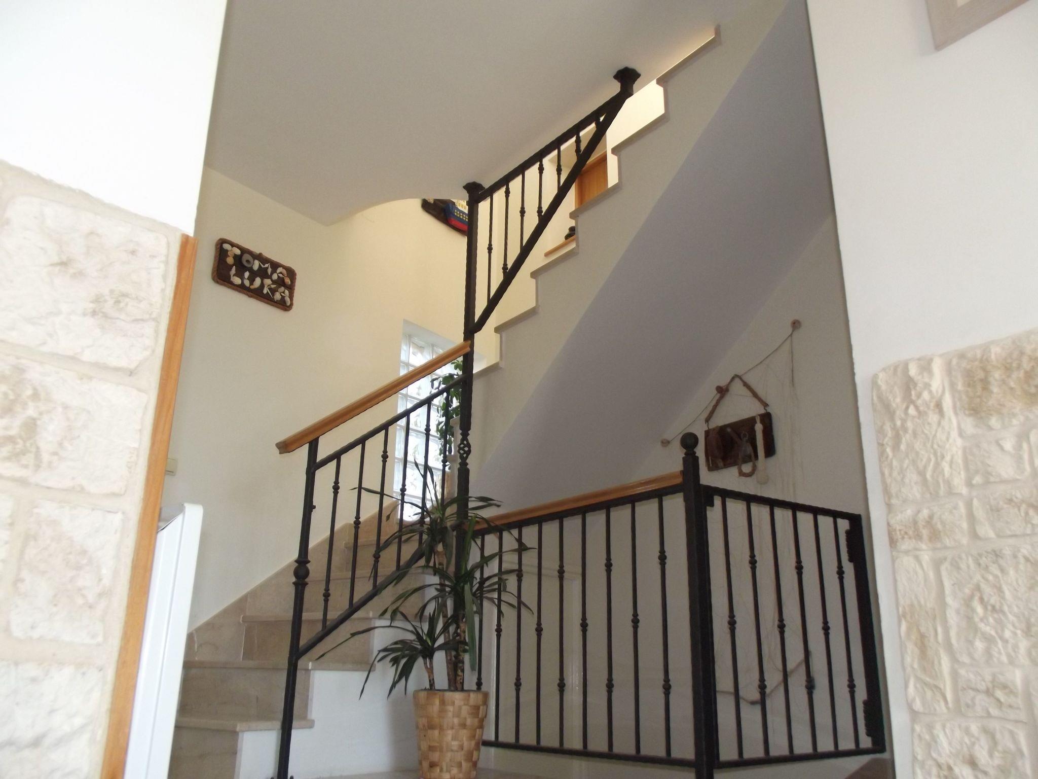 The three-story vacation villa was recently built in 2010 and renovated again in 2012. It is modern and generously equipped for a comfortable stay. The 95 m² living space offers a bright living and dining area with an integrated, open-plan kitchen, three bedrooms, a state-of-the-art bathroom with natural light, and a fitness/games room. On the ground floor, you'll find the air-conditioned (heating and cooling) living area with a large corner sofa, a wall-mounted flat-screen TV with satellite channels, a DVD player, a stereo system, and a cast-iron fireplace for cozy warmth on cooler evenings. A safe is also provided for storing your valuables. The dining area, with a table and four chairs, is separated from the living area by a half-height wall. Right next to it, the wood-colored fitted kitchen features only the latest appliances: a dishwasher, a four-zone gas stove with an elegant stainless steel extractor hood, an electric oven, a refrigerator with a freezer compartment, a microwave, a kettle, a toaster, and a coffee machine. Wide stone staircases lead to the upper floors with the bedrooms, bathroom, and playroom. The three bedrooms are furnished with a 180 cm x 200 cm double bed, a 160 cm x 200 cm double bed, and a 90 cm x 200 cm single bed. The bathroom features a spacious shower cubicle, a wide vanity with a vanity unit and wall mirror, a bidet, and a toilet. In the playroom, not only children will enjoy the pool table. A washing machine and a highchair for a child are available. Upon arrival, you'll find plenty of bed linens and towels provided, and reliable Wi-Fi access is also provided free of charge.