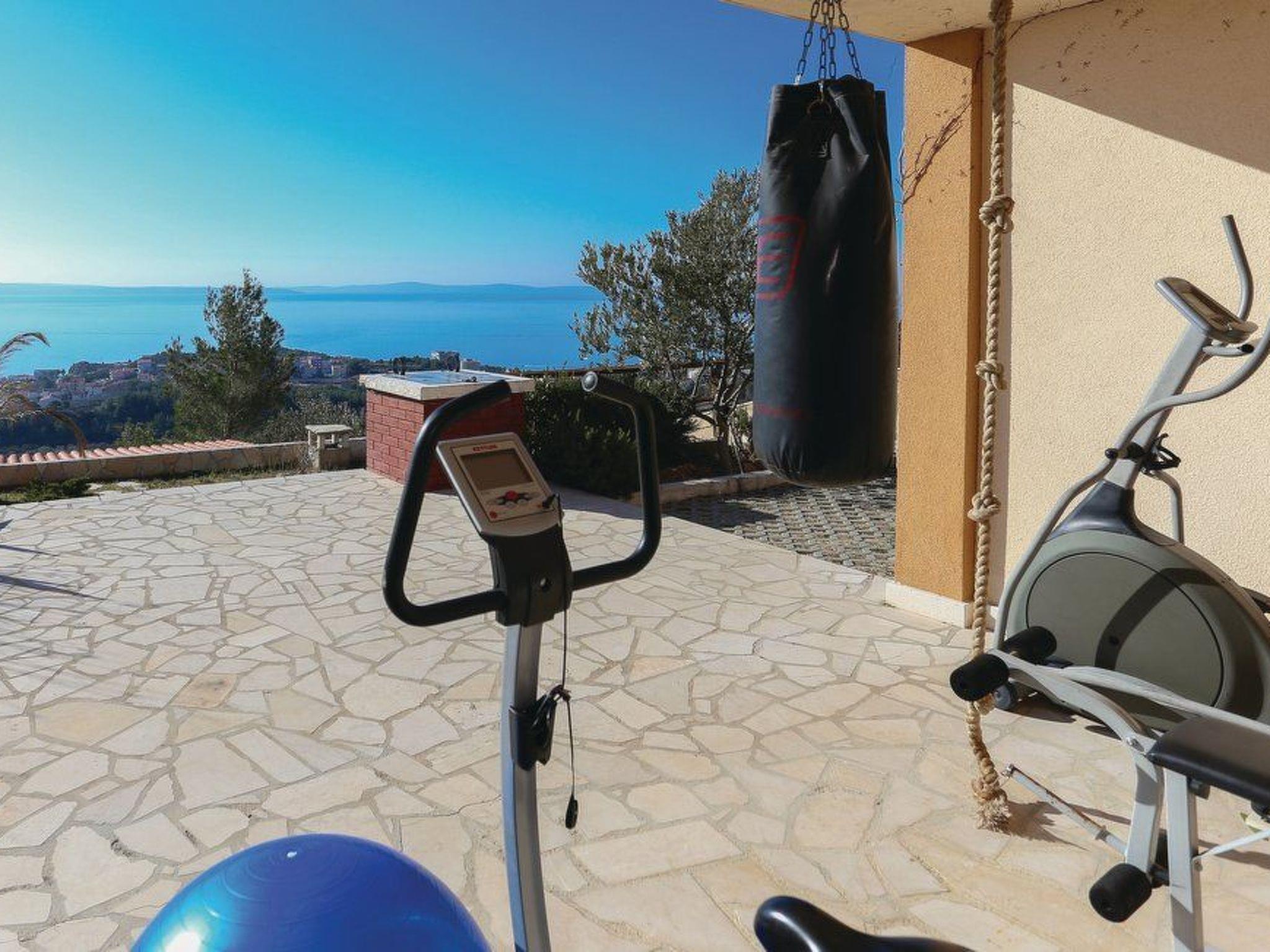 The bedroom on the top floor has access to a large sunny balcony, offering breathtaking panoramic views over the hilly landscape to the sea. And downstairs in the outdoor area, you can relax on one of the sun loungers around your private pool and enjoy the same sea views. Since the pool is illuminated at night, you can still swim laps under the starry sky even late into the evening. The more active vacationers among you can let off steam on the spacious terrace, which is equipped with fitness equipment (exercise bike, press bench, dumbbells and weights, and even a kickboxing punching bag). Afterwards, you can gather for a long barbecue evening to recharge your batteries. A car is recommended during your stay; you can use the secure parking spaces directly in front of your vacation villa.