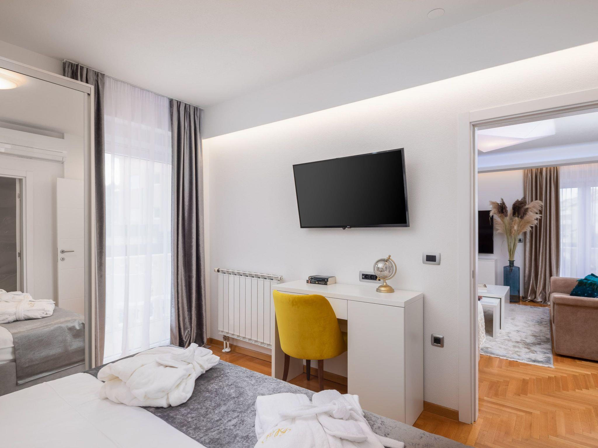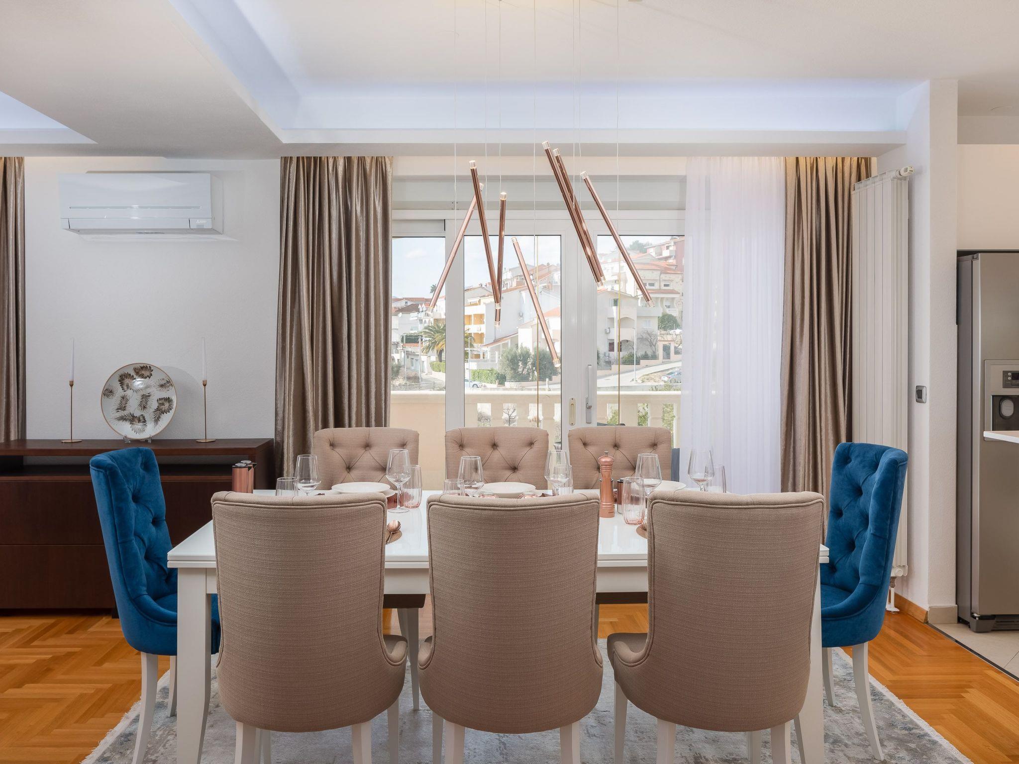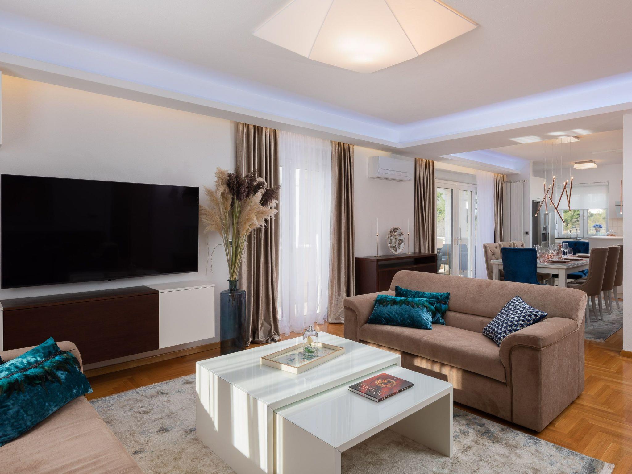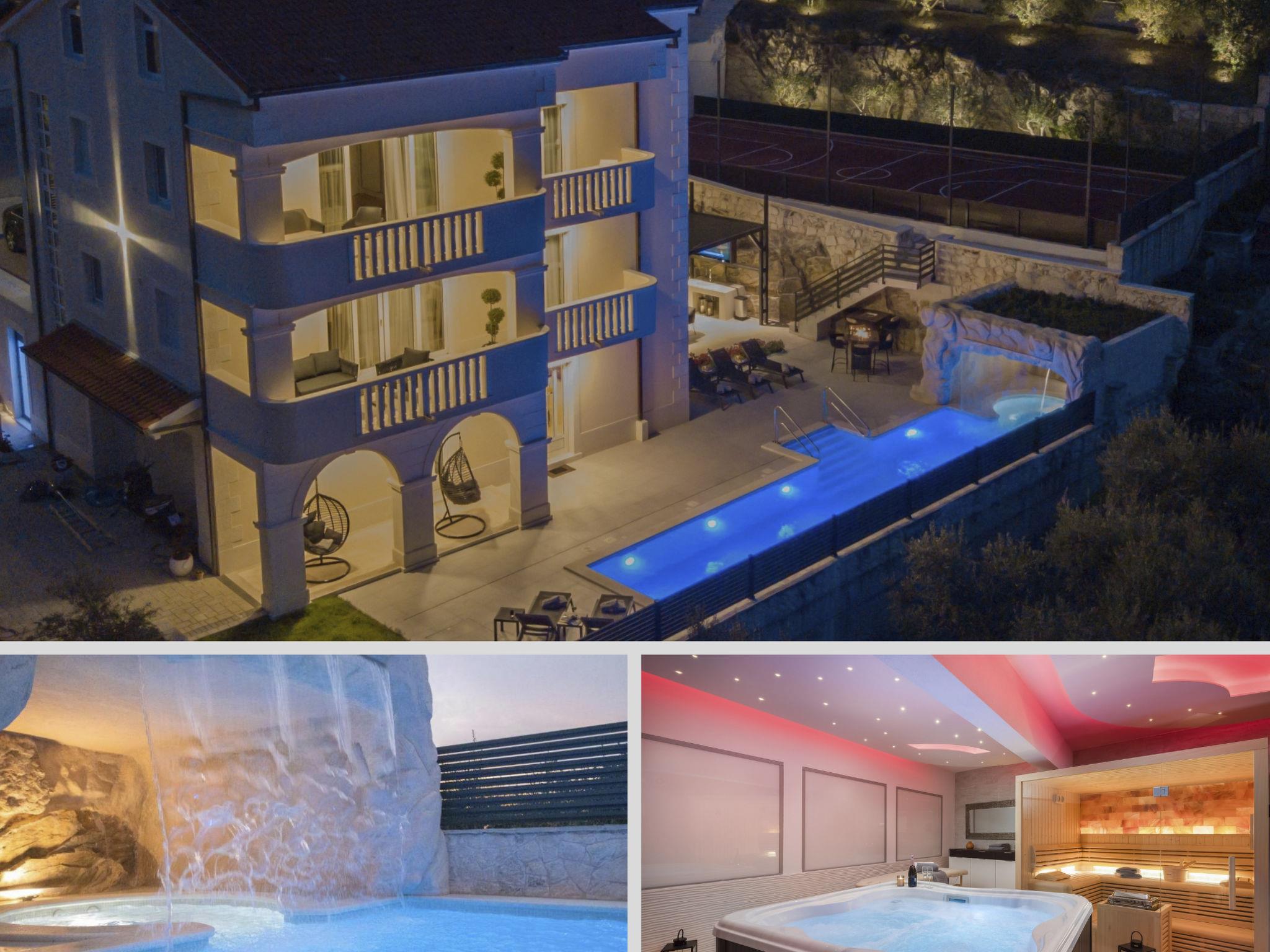 It offers a heated swimming pool with a whirlpool, outdoor shower, sunbathing area and a multipurpose terrain, summer kitchen with brick barbecue, outdoor dining area with flat screen TV and fire pit, an air conditioning and internet connection in every area of the villa. Furthermore, Villa Elais disposes of a playroom, a library, a cinema room, a SPA and a gym. The sumptuous villa can accommodate up to 10 people.