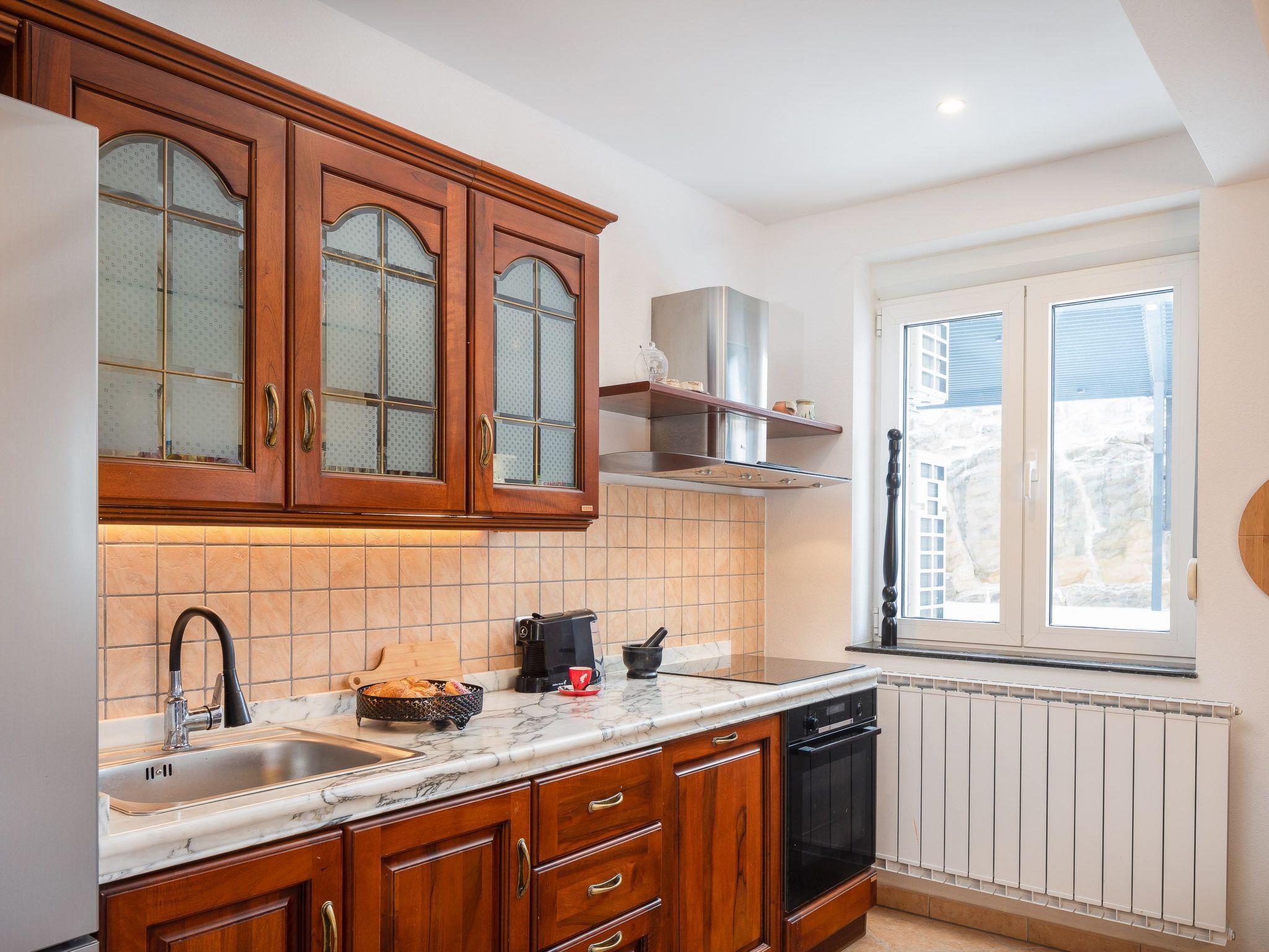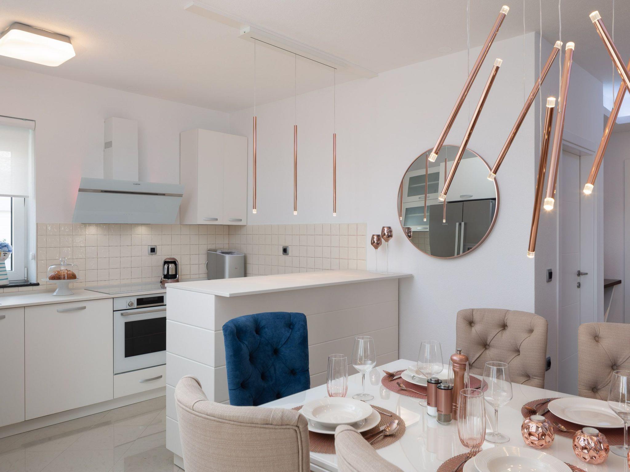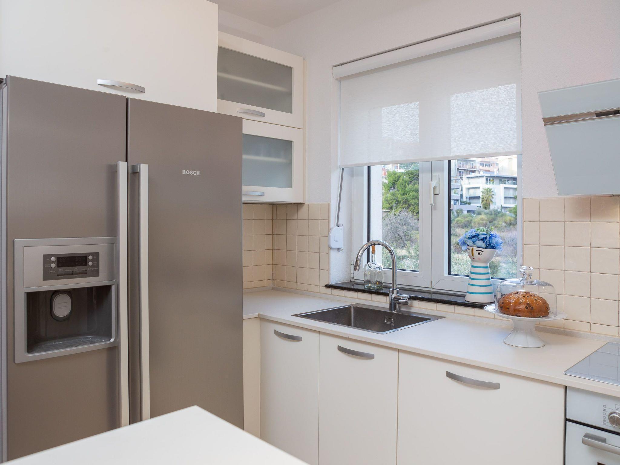 Moving to the ground floor of the villa, you will have at your disposal a fully equipped kitchen with stove top, oven, fridge, dishwasher and other kitchen utilities with a dining area and one bathroom. In addition to the large living rooms and the fully equipped kitchen with direct access to the garden.
