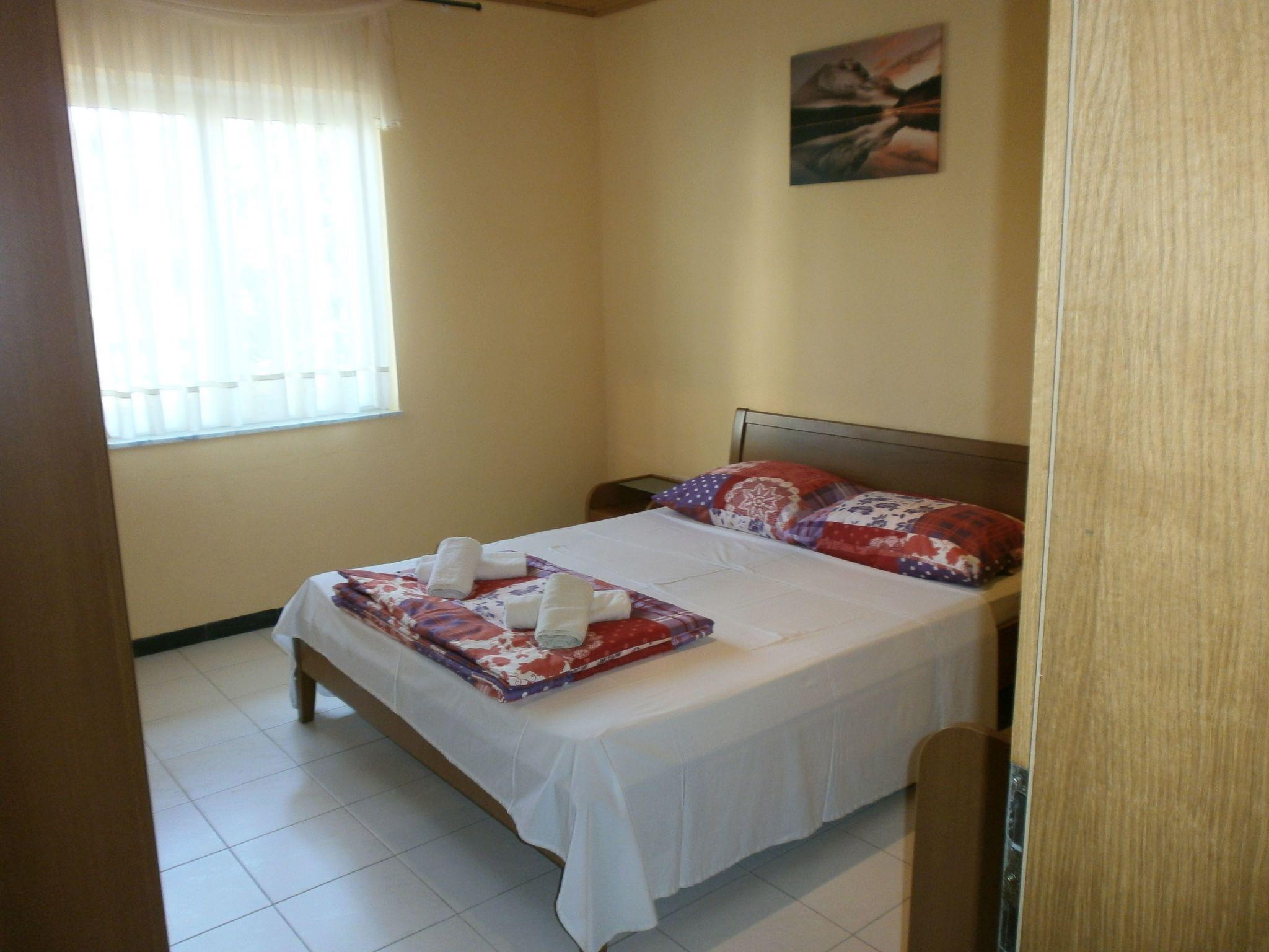 This holiday apartment with around 75m² of living space is on the ground floor of the house and provides ample space for six people. It has a living room with two faux leather sofas (one sofa can be pulled out as a double bed for two adults), a coffee table and satellite TV. The separate kitchen is equipped with an oven, a fridge with a freezer compartment, a sink, a kettle, a coffee machine and a dining table with chairs. The big bedroom is furnished with a double bed 180cm wide, two bedside tables, a cupboard and a dresser with a mirror. The children’s room has two single beds 90cm wide and a wardrobe. The bathroom has a shower, WC, washbasin, bidet and hairdryer.