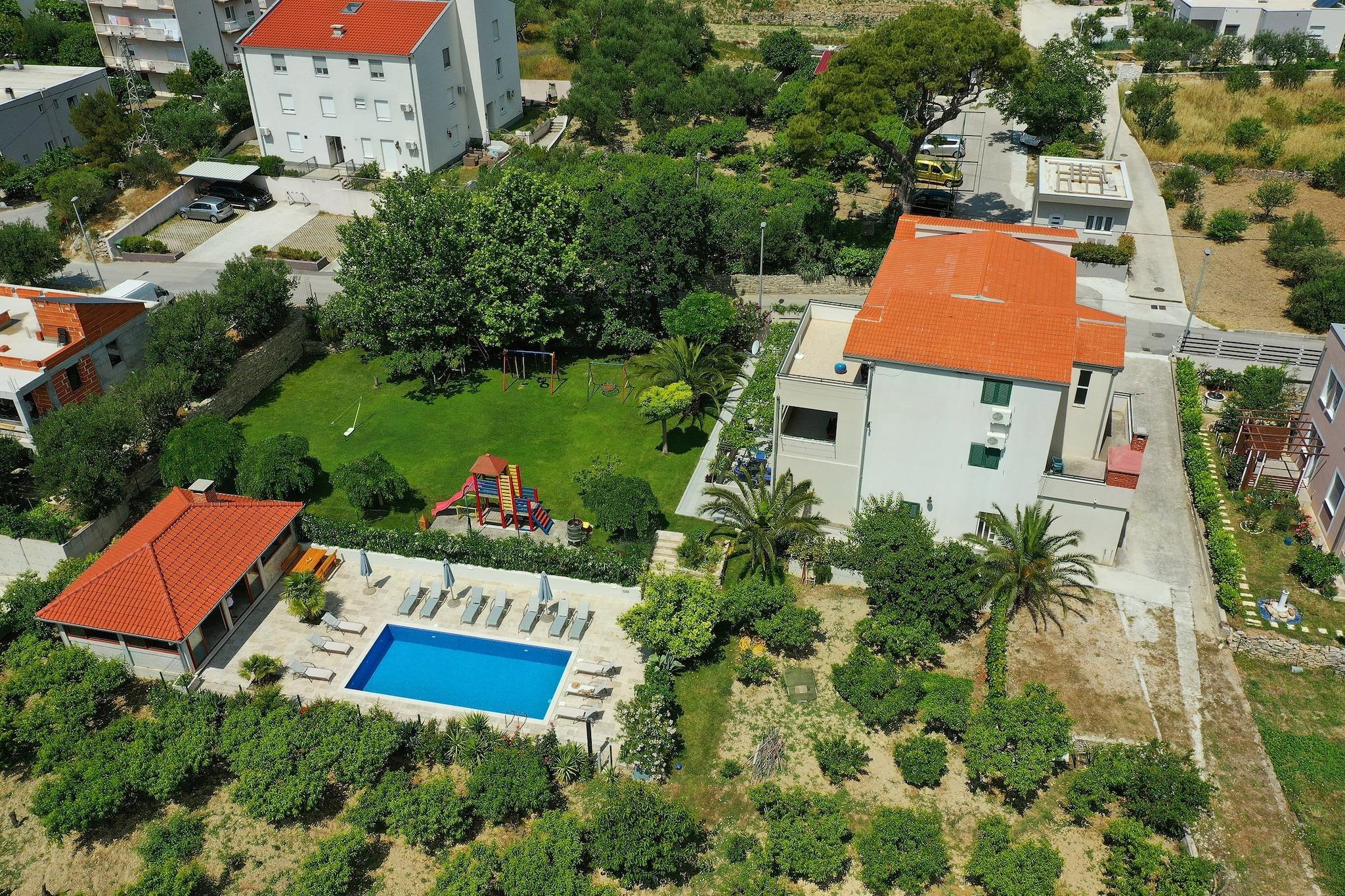 Villa Dvori Viškovi ligger i Podstrana, en ganske lille by på den dalmatiske kyst, cirka 8 km kørsel fra den berømte Split-promenade.Privat udendørs sæsonåben swimmingpool omgivet af en rummelig solterrasse udstyret med liggestole og parasoller, privat have, børnebassin. betalingsplads samt grillfaciliteter og udendørs spiseplads er til din rådighed, hvilket gør dette sted ideelt til en dejlig og afslappende familie- eller venners ferie. Bemærk venligst: Svømmehallen er åben fra 15.04. - 01.11. Bagageopbevaring er mulig før check-in og efter check-out, så du kan udforske stedet lidt mere inden din afgang. Gratis privat parkering er til rådighed, reservation er ikke påkrævet.Denne dejlige syv værelses villa med fem stuer møbleret terrasse og swimmingpool er perfekt egnet til op til tyve personer. Det har gratis WiFi, aircondition samt LCD-tv. Fem stuer kommer med sofa og opholdsområde, og de er kombineret med udstyret køkken og spiseplads. Feriehuset har fem private badeværelser. Vaskemaskine, tørretumbler og strygefaciliteter er til rådighed. På det seneste har Podstrana udviklet sig som en eliteforstad til Split og blevet et attraktivt turistmål på grund af sine dejlige grusstrande, fremragende restauranter, vandre- og cykelstier . Strandene i Podstrana strækker sig over 5 km, så gæsterne vil kunne nyde sol og hav på varme sommerdage. Den nærmeste strand ligger kun 600 m væk, mens købmand og supermarked ligger 500 m væk. Den nærmeste restaurant ligger 200 m fra ejendommen. Busstoppestedet ligger 500 m væk. Split Lufthavn ligger cirka 25 km kørsel fra ejendommen, mens færgehavnen og hovedbusterminalen i Split ligger 8 km derfra.