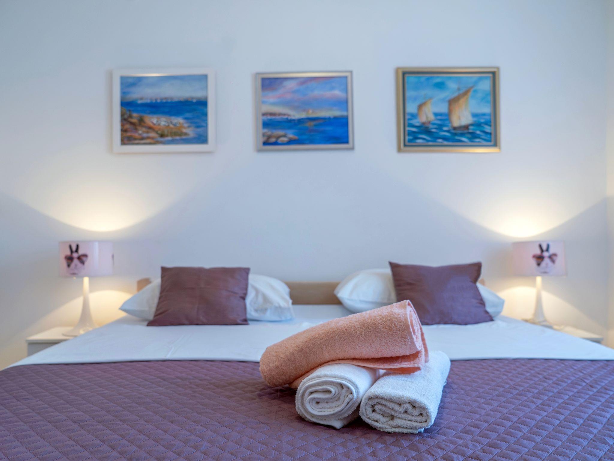 Ferienwohnung bietet Platz für 4 Gäste. Die Betten sind in Schlafzimmern, die es 2 gibt, innerhalb einer Gesamtfläche von 68m2, angeordnet. Die Gäste haben eine eigene Terrasse zur Verfügung, auf der sie in warmen Sommernächten genießen können. Das Apartment bietet Meerblick. Es ist erlaubt, Speisen auf dem Gemeinschafts-Grill vorzubereiten. IM PREIS INBEGRIFFEN: Kurtaxe, Endreinigung, Klimatisierung, Parkplatz, Internet, Bügeleisen, Bügelbrett, Föhn, Sonnenschirm, Liegestühle. VERBINDLICHE ZUSÄTZLICHE KOSTEN: Aufzahlung für Kurzaufenthalte (prozentualer Zuschlag pro Nächtigungsanzahl: 30% - 1, 20% - 2, 10% - 3). UNVERBINDLICHE ZUSÄTZLICHE KOSTEN: 1 Bett für Kinder (20,00 € Person/Tag). Die Verfügbarkeit zusätzlicher Dienstleistungen in Ihrem reservierten Termin und die Preise derselben (falls nicht aufgeführt) müssen im Voraus überprüft werden. Zusätzliche Dienstleistungen die in der Zahlungsaufforderung nicht aufgeführt sind werden direkt beim Vermieter bezahlt, angenommen der Gast nutzt auch diese. Ermäßigung auf den Grundpreis: Gratistag 14=13 (bei einem Aufenthalt von 14 Tagen oder mehr erhalten Sie einen Gratistag für den Aufenthalt bis 31.12.26).