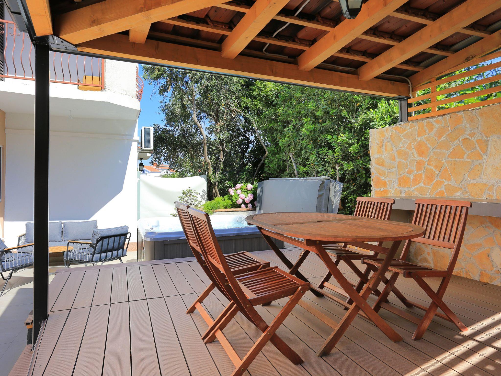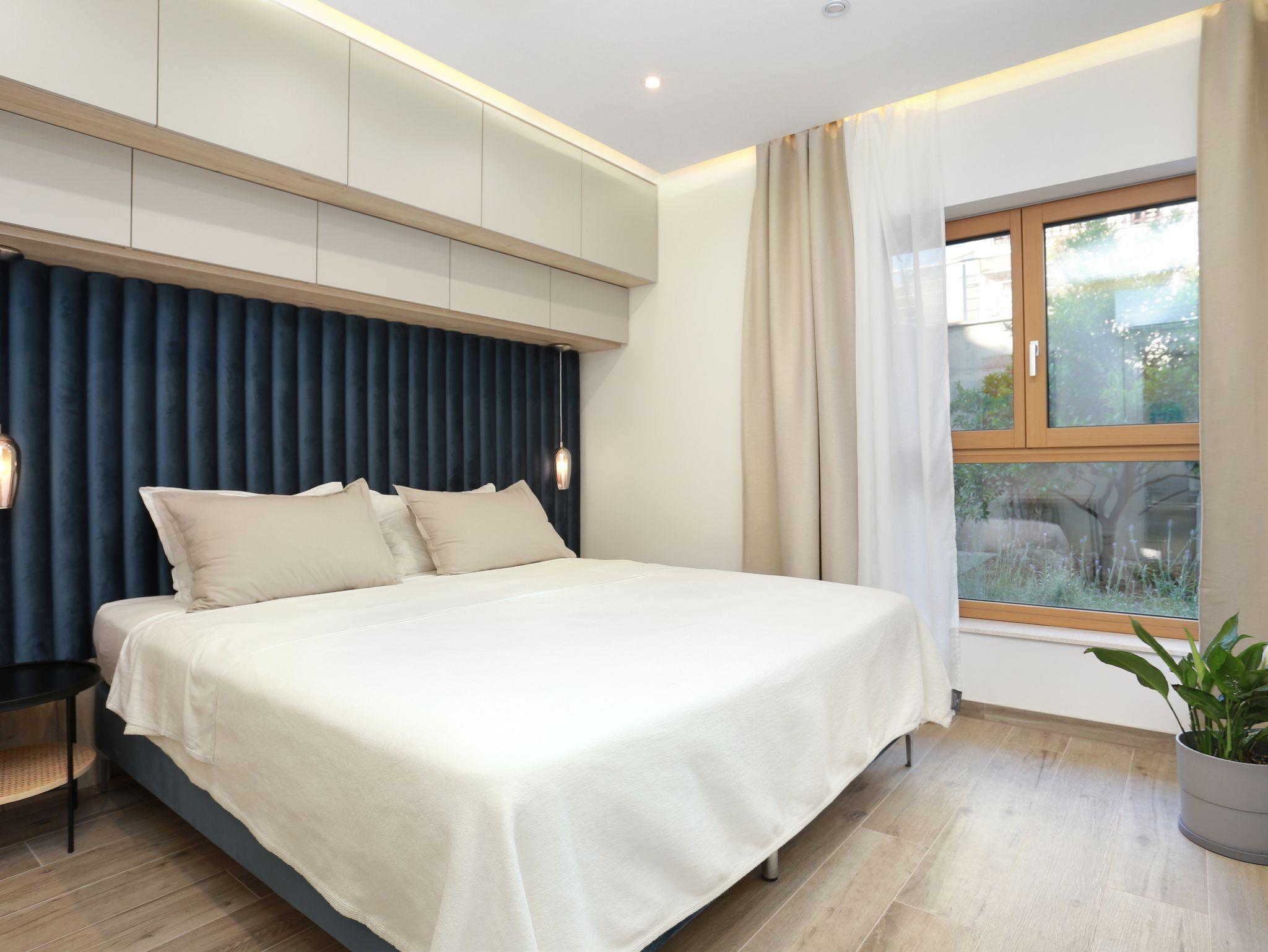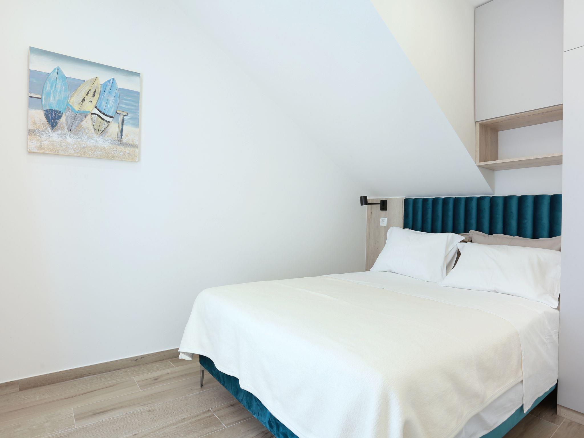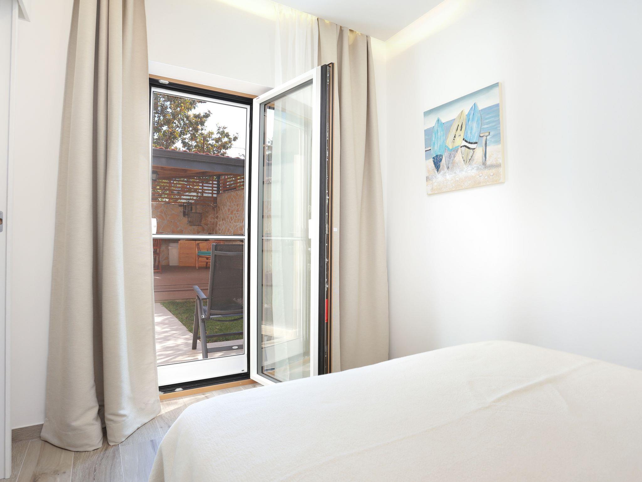 Ferienwohnung bietet Platz für 5 Gäste. Die Betten sind in Schlafzimmern, die es 2 gibt, und in Wohnzimmer, innerhalb einer Gesamtfläche von 51m2, angeordnet. Die Gäste haben eine eigene Terrasse zur Verfügung, auf der sie in warmen Sommernächten genießen können. Für vollen Genuss und Entspannung gibt es einen privaten Grill für Gäste dieser Unterkunft. IM PREIS INBEGRIFFEN: Kurtaxe, Endreinigung, Klimatisierung, Parkplatz, Internet. VERBINDLICHE ZUSÄTZLICHE KOSTEN: Aufzahlung für Kurzaufenthalte (prozentualer Zuschlag pro Nächtigungsanzahl: 30% - 1, 20% - 2, 10% - 3). UNVERBINDLICHE ZUSÄTZLICHE KOSTEN: Wäschewaschen (10,00 € Waschen). Die Verfügbarkeit zusätzlicher Dienstleistungen in Ihrem reservierten Termin und die Preise derselben (falls nicht aufgeführt) müssen im Voraus überprüft werden. Zusätzliche Dienstleistungen die in der Zahlungsaufforderung nicht aufgeführt sind werden direkt beim Vermieter bezahlt, angenommen der Gast nutzt auch diese. Ermäßigung auf den Grundpreis: Gratistag 14=13 (bei einem Aufenthalt von 14 Tagen oder mehr erhalten Sie einen Gratistag für den Aufenthalt bis 31.12.26).