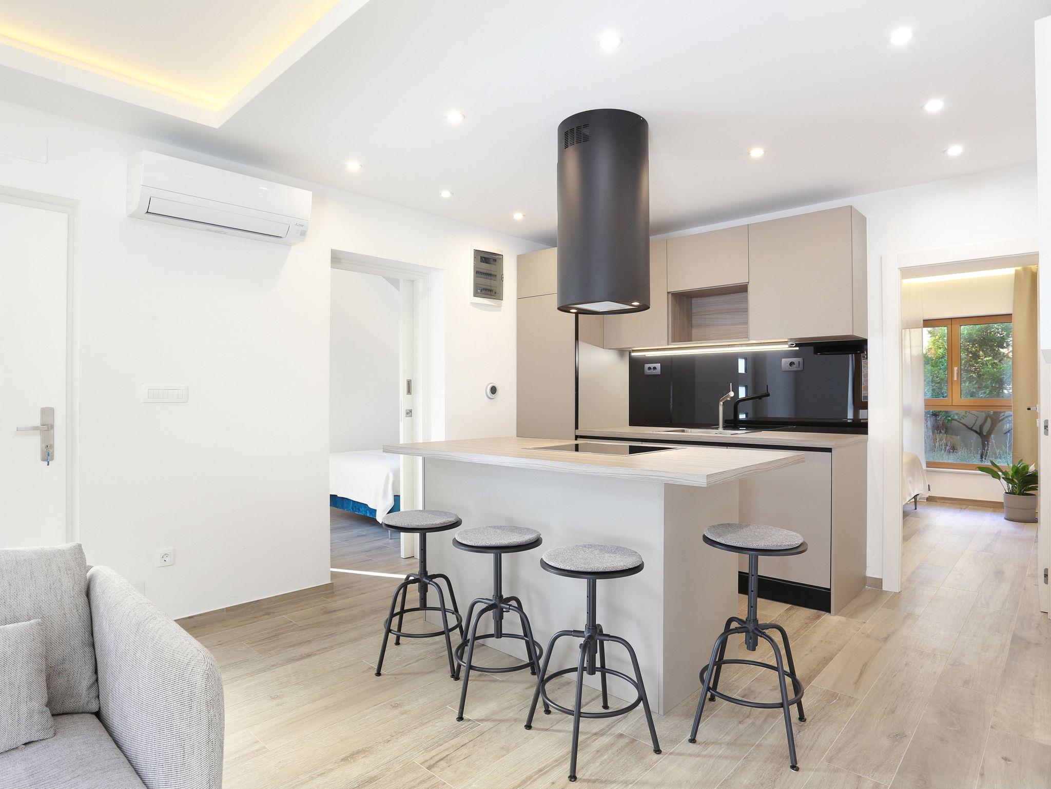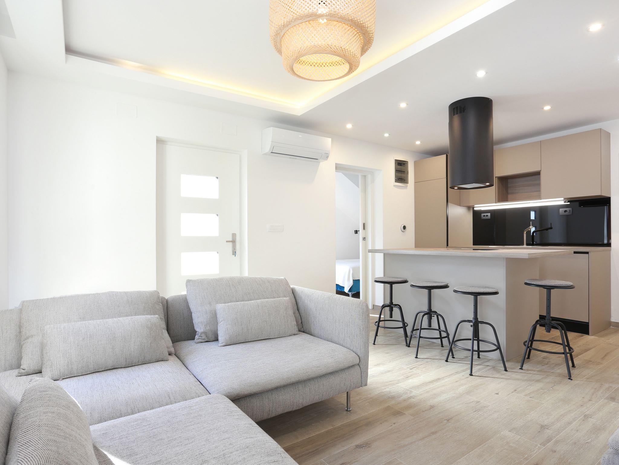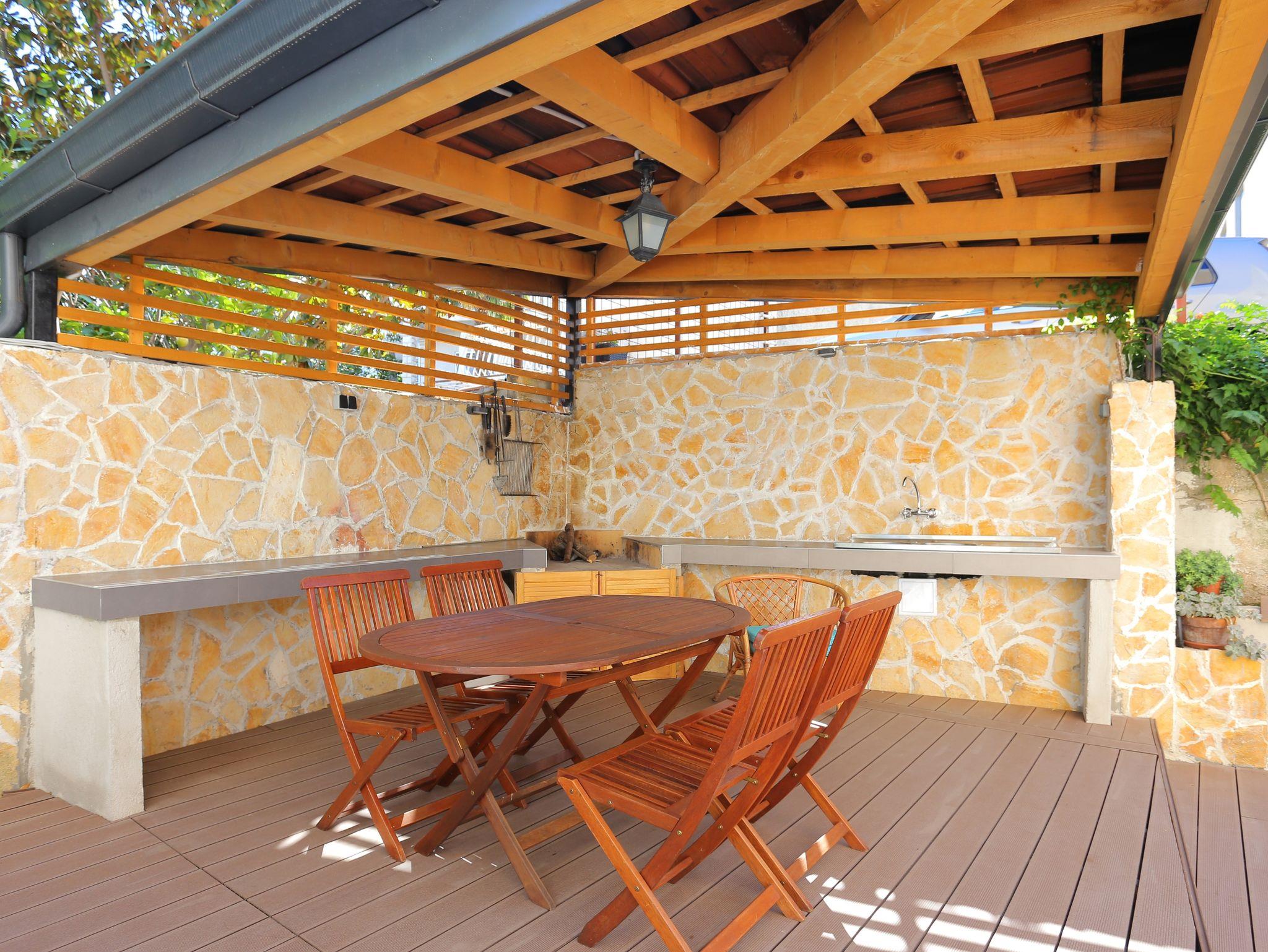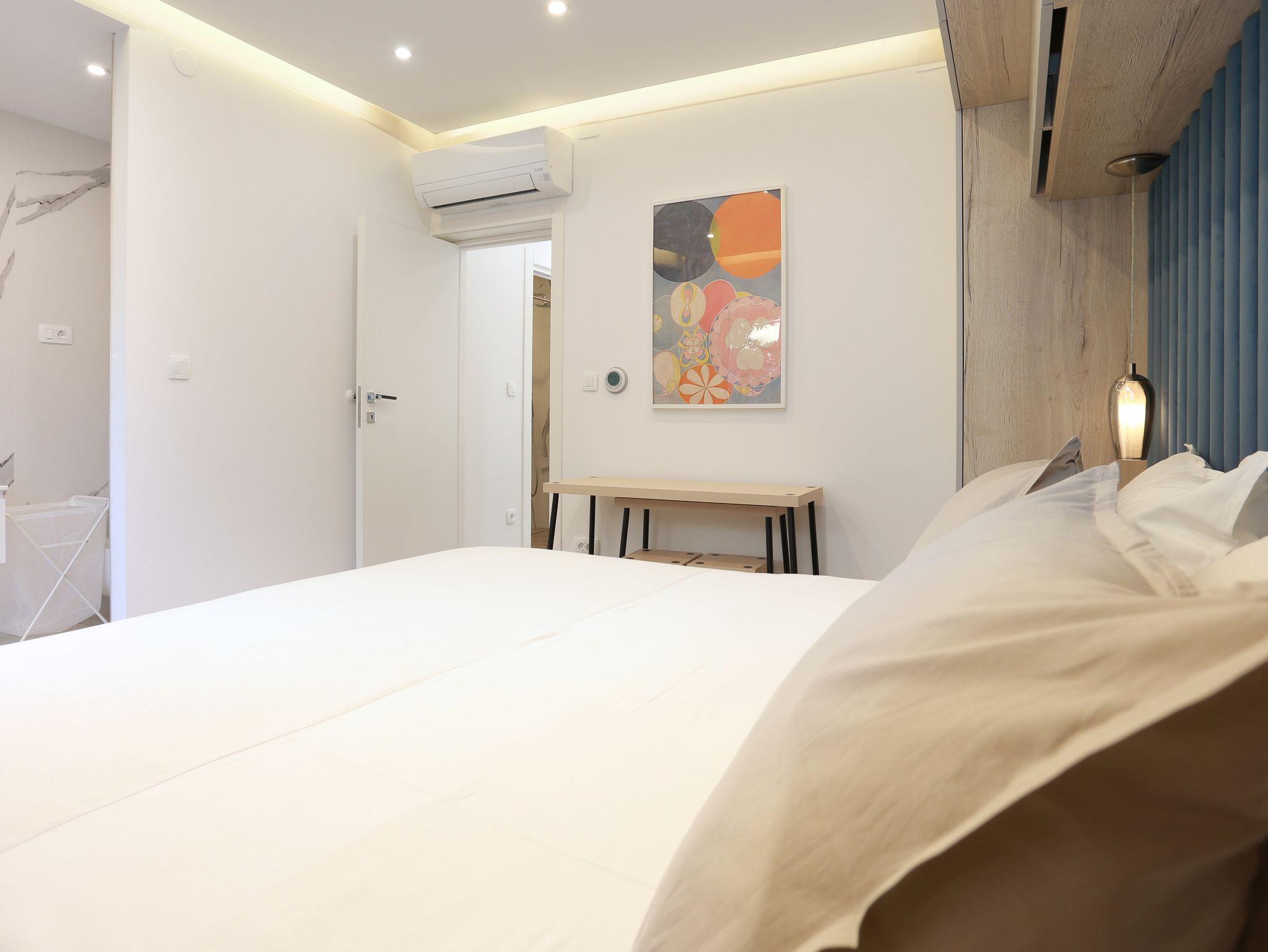 Ferienwohnung bietet Platz für 5 Gäste. Die Betten sind in Schlafzimmern, die es 2 gibt, und in Wohnzimmer, innerhalb einer Gesamtfläche von 51m2, angeordnet. Die Gäste haben eine eigene Terrasse zur Verfügung, auf der sie in warmen Sommernächten genießen können. Für vollen Genuss und Entspannung gibt es einen privaten Grill für Gäste dieser Unterkunft. IM PREIS INBEGRIFFEN: Kurtaxe, Endreinigung, Klimatisierung, Parkplatz, Internet. VERBINDLICHE ZUSÄTZLICHE KOSTEN: Aufzahlung für Kurzaufenthalte (prozentualer Zuschlag pro Nächtigungsanzahl: 30% - 1, 20% - 2, 10% - 3). UNVERBINDLICHE ZUSÄTZLICHE KOSTEN: Wäschewaschen (10,00 € Waschen). Die Verfügbarkeit zusätzlicher Dienstleistungen in Ihrem reservierten Termin und die Preise derselben (falls nicht aufgeführt) müssen im Voraus überprüft werden. Zusätzliche Dienstleistungen die in der Zahlungsaufforderung nicht aufgeführt sind werden direkt beim Vermieter bezahlt, angenommen der Gast nutzt auch diese. Ermäßigung auf den Grundpreis: Gratistag 14=13 (bei einem Aufenthalt von 14 Tagen oder mehr erhalten Sie einen Gratistag für den Aufenthalt bis 31.12.26).