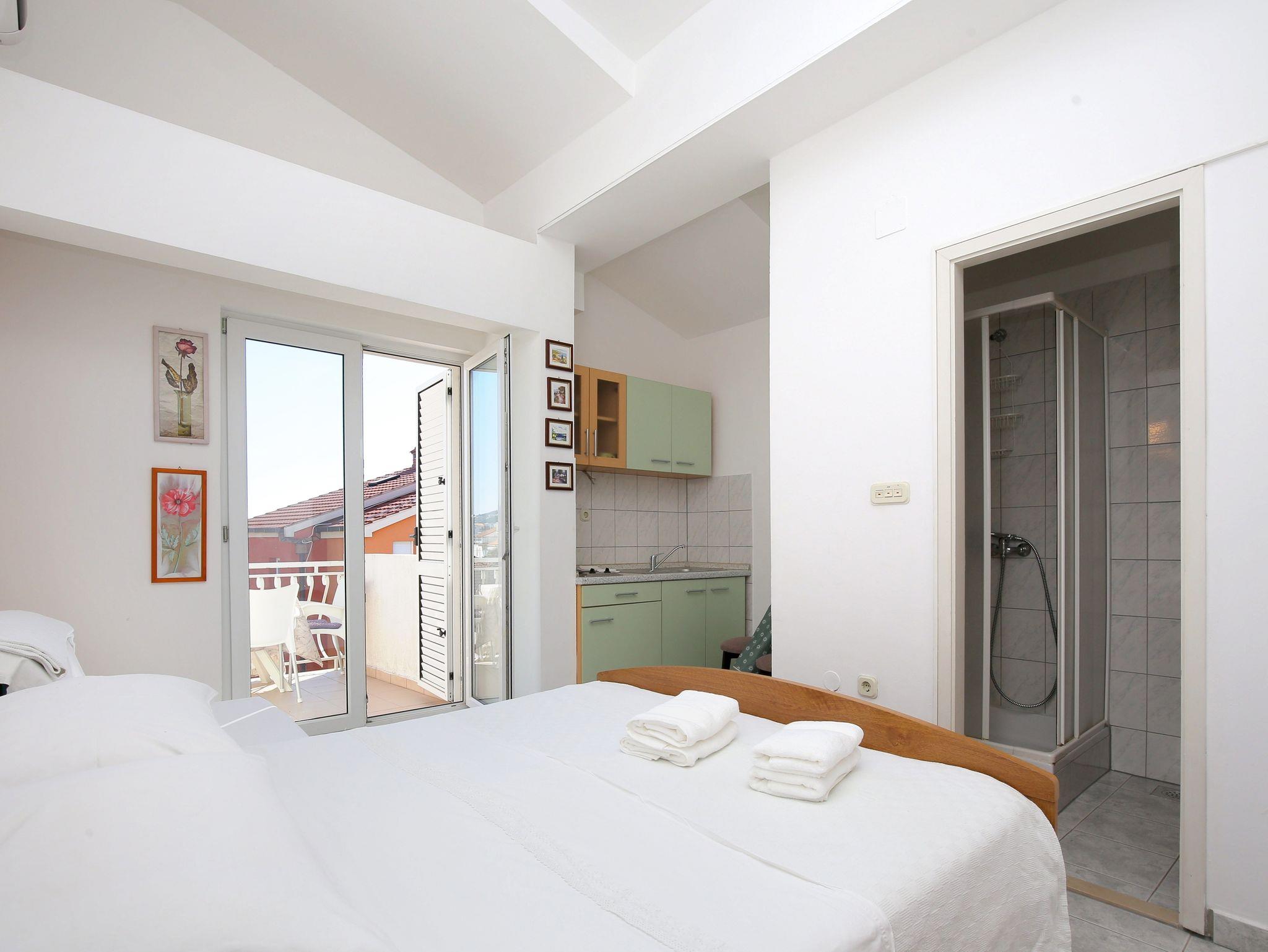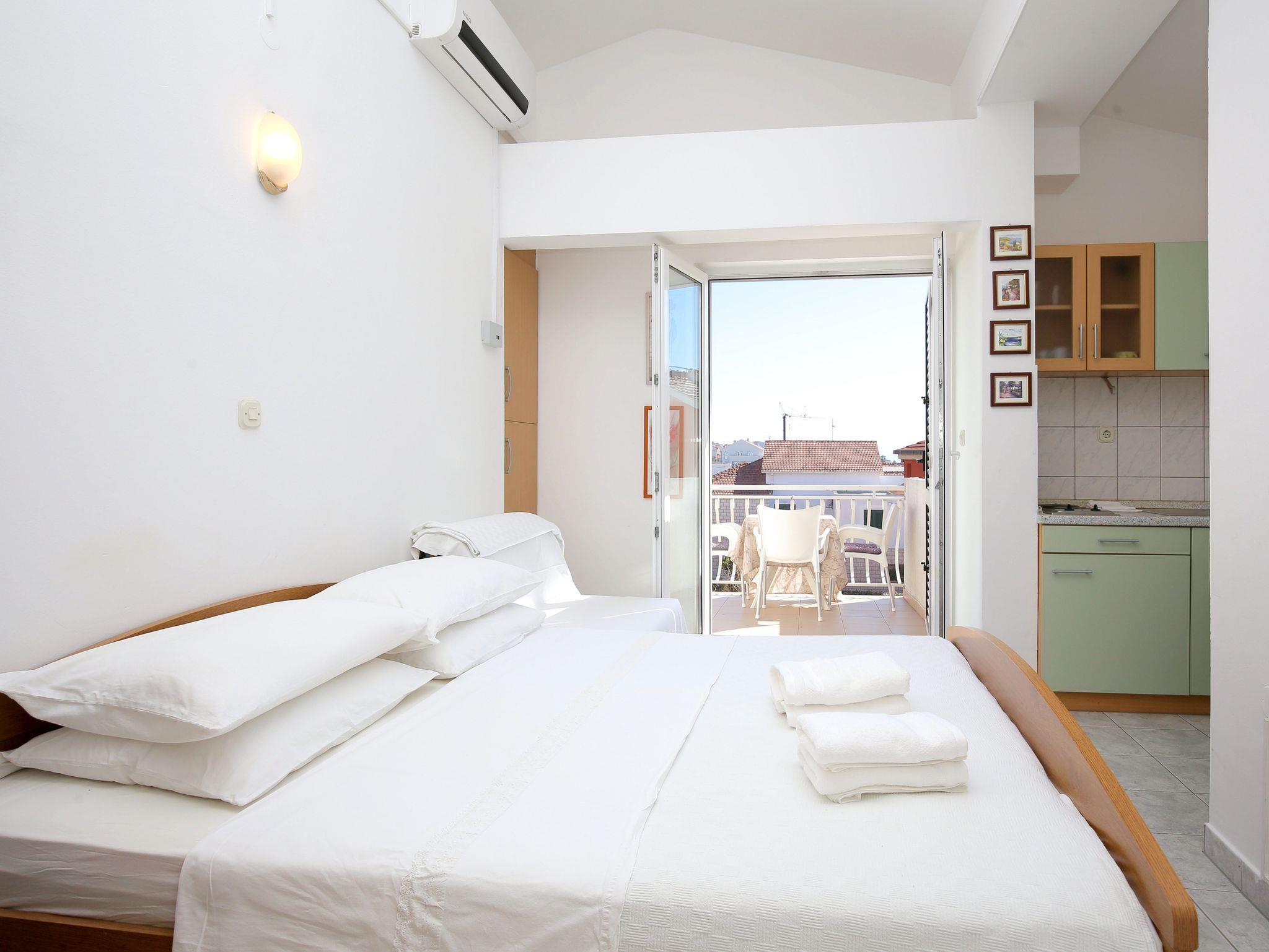 Studio bietet Platz für 2 Gäste. Die Betten sind in Schlafzimmern, die es 1 gibt, innerhalb einer Gesamtfläche von 17m2, angeordnet. Die Gäste haben eine eigene Terrasse zur Verfügung, auf der sie in warmen Sommernächten genießen können. Das Studio-Apartment bietet Meerblick. Es ist erlaubt, Speisen auf dem Gemeinschafts-Grill vorzubereiten. IM PREIS INBEGRIFFEN: Kurtaxe, Endreinigung, Klimatisierung, Parkplatz, Internet, Wäschewaschen, Bügeleisen, Bügelbrett, Föhn, tragbarer Grill, 1 Bett für Kinder (im Preis enthalten). Die Verfügbarkeit zusätzlicher Dienstleistungen in Ihrem reservierten Termin und die Preise derselben (falls nicht aufgeführt) müssen im Voraus überprüft werden. Zusätzliche Dienstleistungen die in der Zahlungsaufforderung nicht aufgeführt sind werden direkt beim Vermieter bezahlt, angenommen der Gast nutzt auch diese. Ermäßigung auf den Grundpreis: Gratistag 14=13 (bei einem Aufenthalt von 14 Tagen oder mehr erhalten Sie einen Gratistag für den Aufenthalt bis 31.12.26).