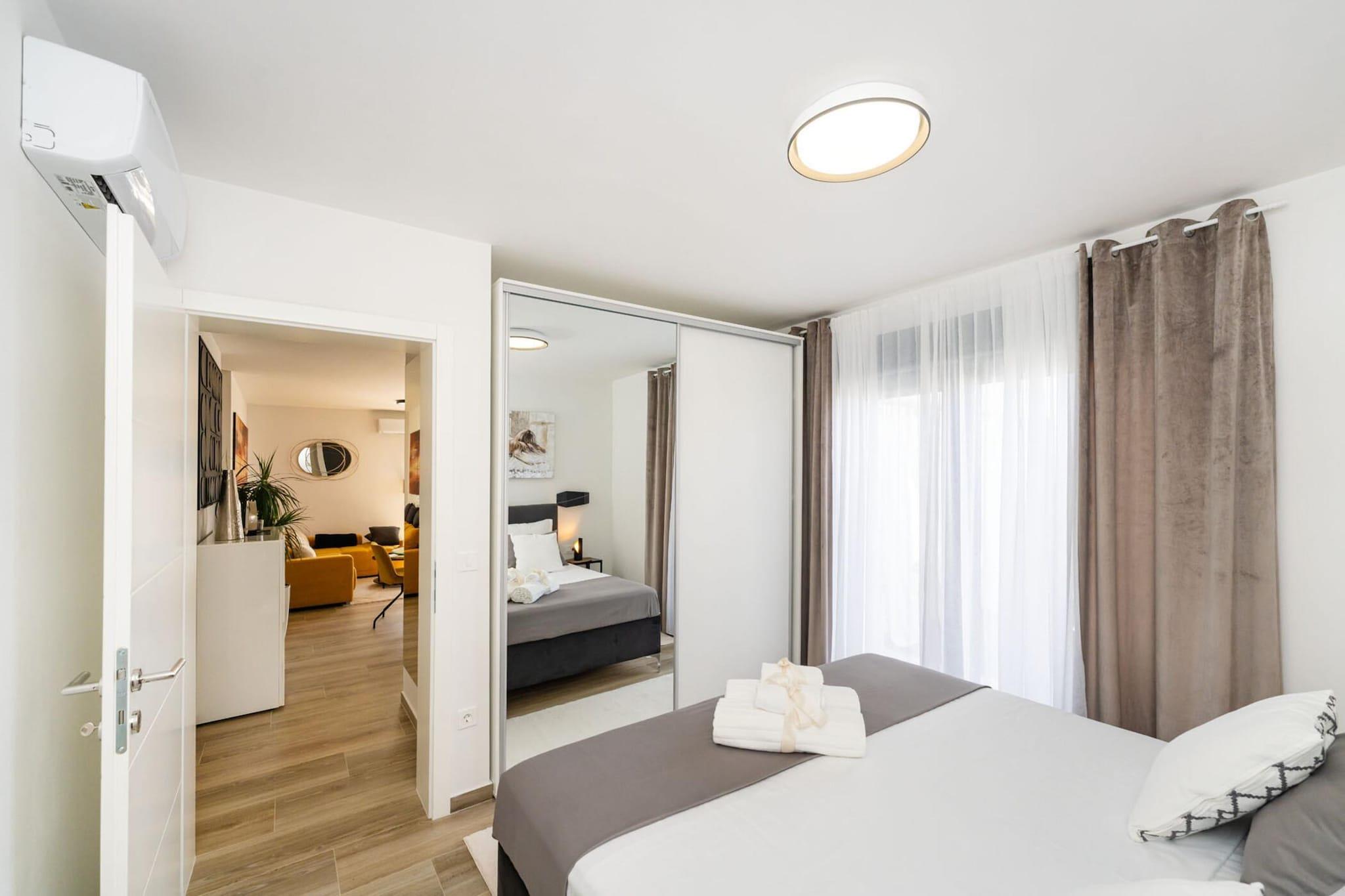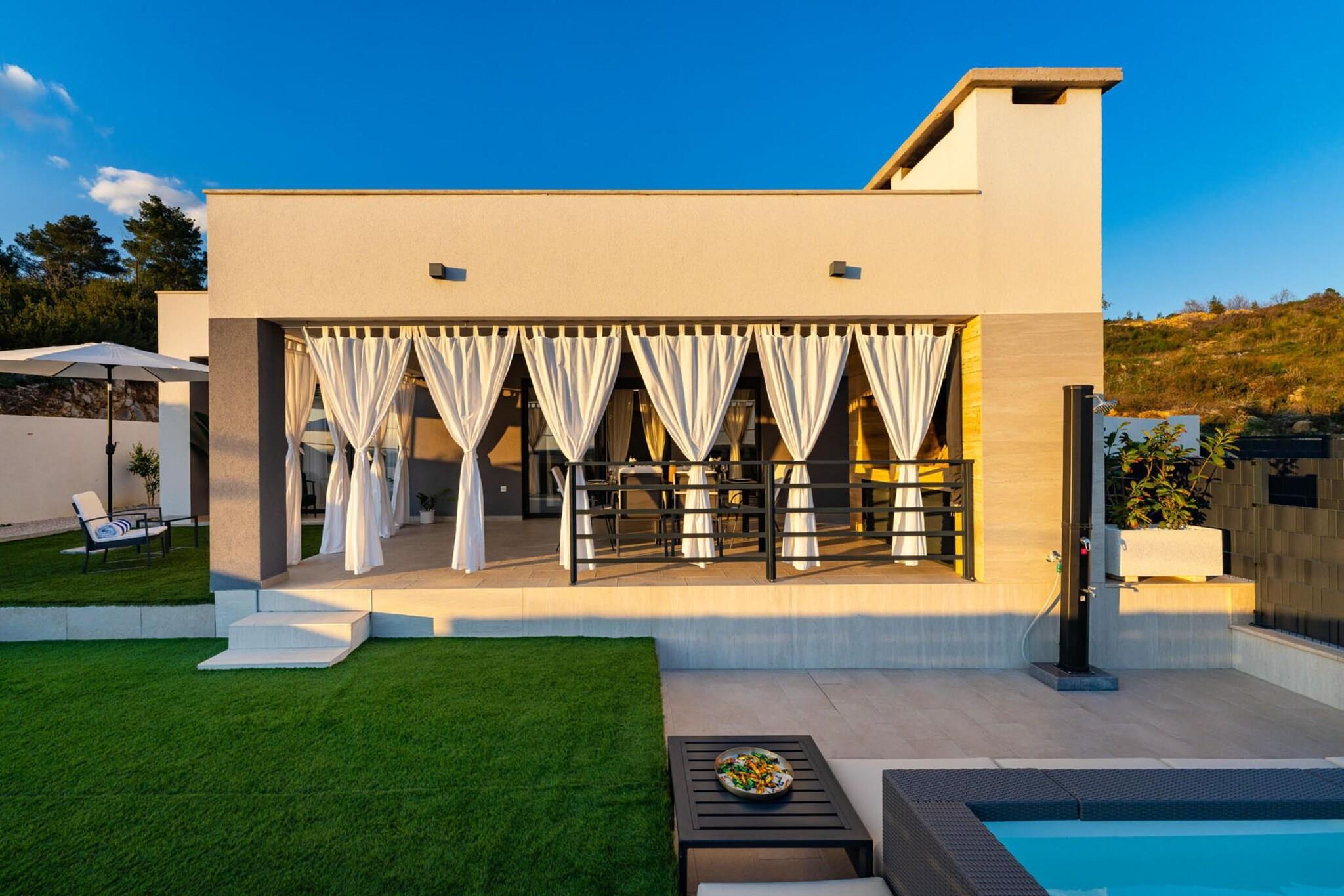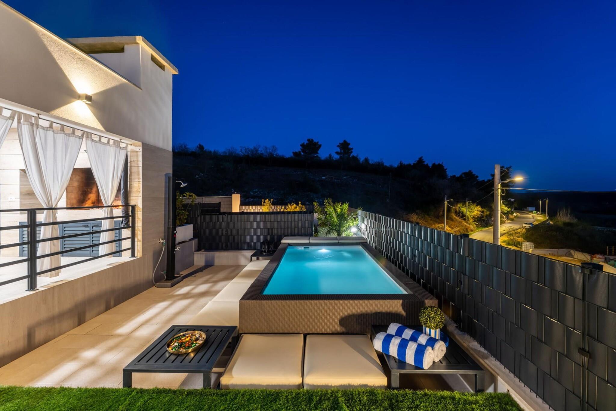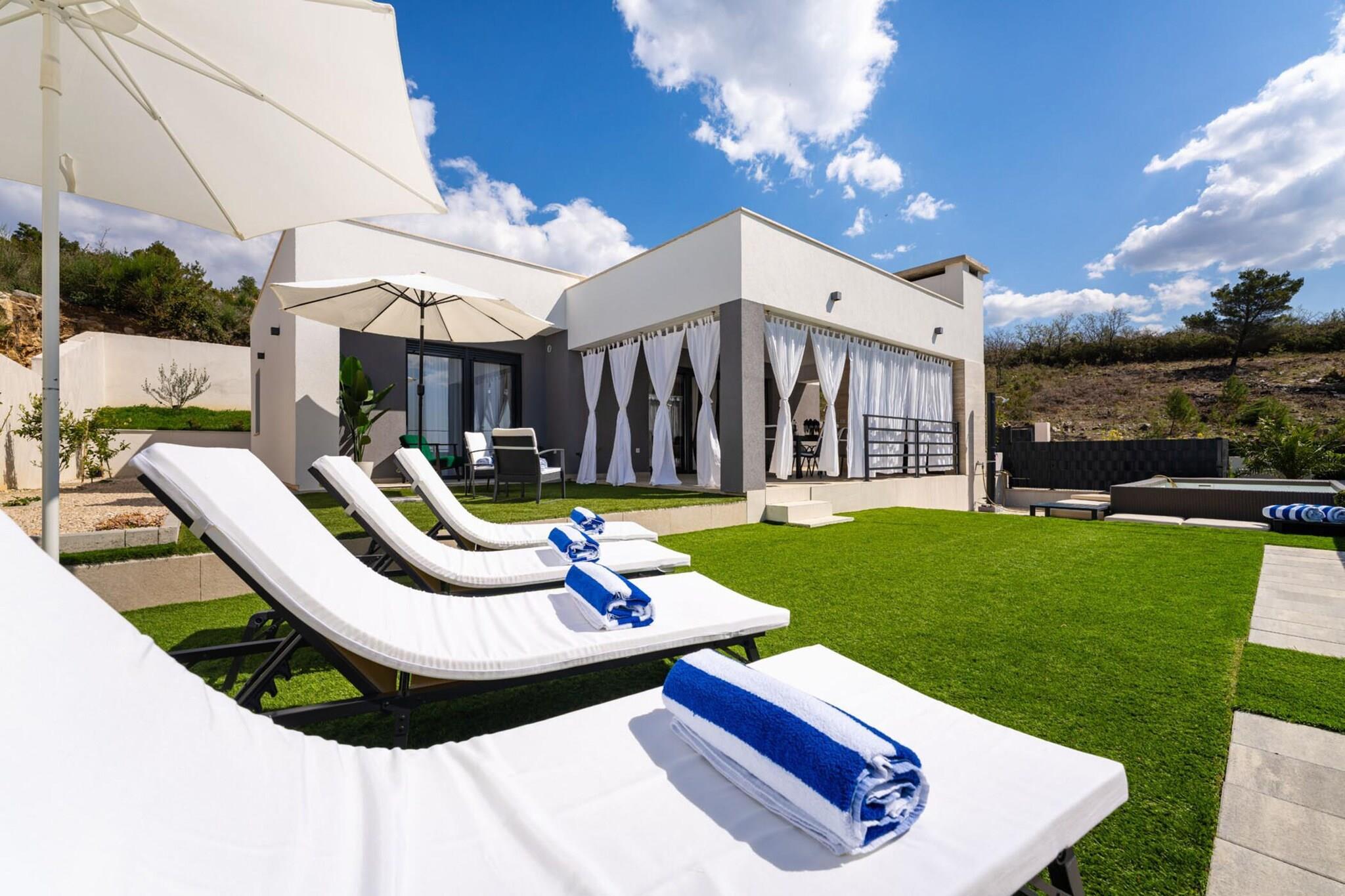 Slap af i dette moderne feriehus i den rolige landsby Podvrsje. Beliggende på en bakke, tilbyder det en betagende panoramaudsigt over Adriaterhavet og det omgivende landskab. Huset er ideelt til familier eller små grupper, kan rumme op til 6 personer og tilbyder en privat opvarmet pool, en terrasse med havudsigt og stilfulde interiører designet med komfort og bekvemmelighed for øje. Indvendigt er der to klimatiserede soveværelser, et moderne badeværelse, et ekstra toilet og en åben stue med spiseplads og direkte adgang til terrassen. Det fuldt udstyrede køkken har opvaskemaskine, kaffemaskine og alle nødvendige apparater. Udenfor kan du nyde den møblerede terrasse med grill, liggestole og skyggefuld spiseplads – det perfekte sted at slappe af ved poolen eller nyde hyggelige aftenmåltider med udsigt. Beliggende mindre end 3 km fra den nærmeste sandstrand i Ljubac og tæt på Razanac, Zadar, Nin og øen Pag, er denne villa det perfekte udgangspunkt for at udforske Dalmatien og kystens charme, samtidig med at den tilbyder fuldstændig privatliv og ro.