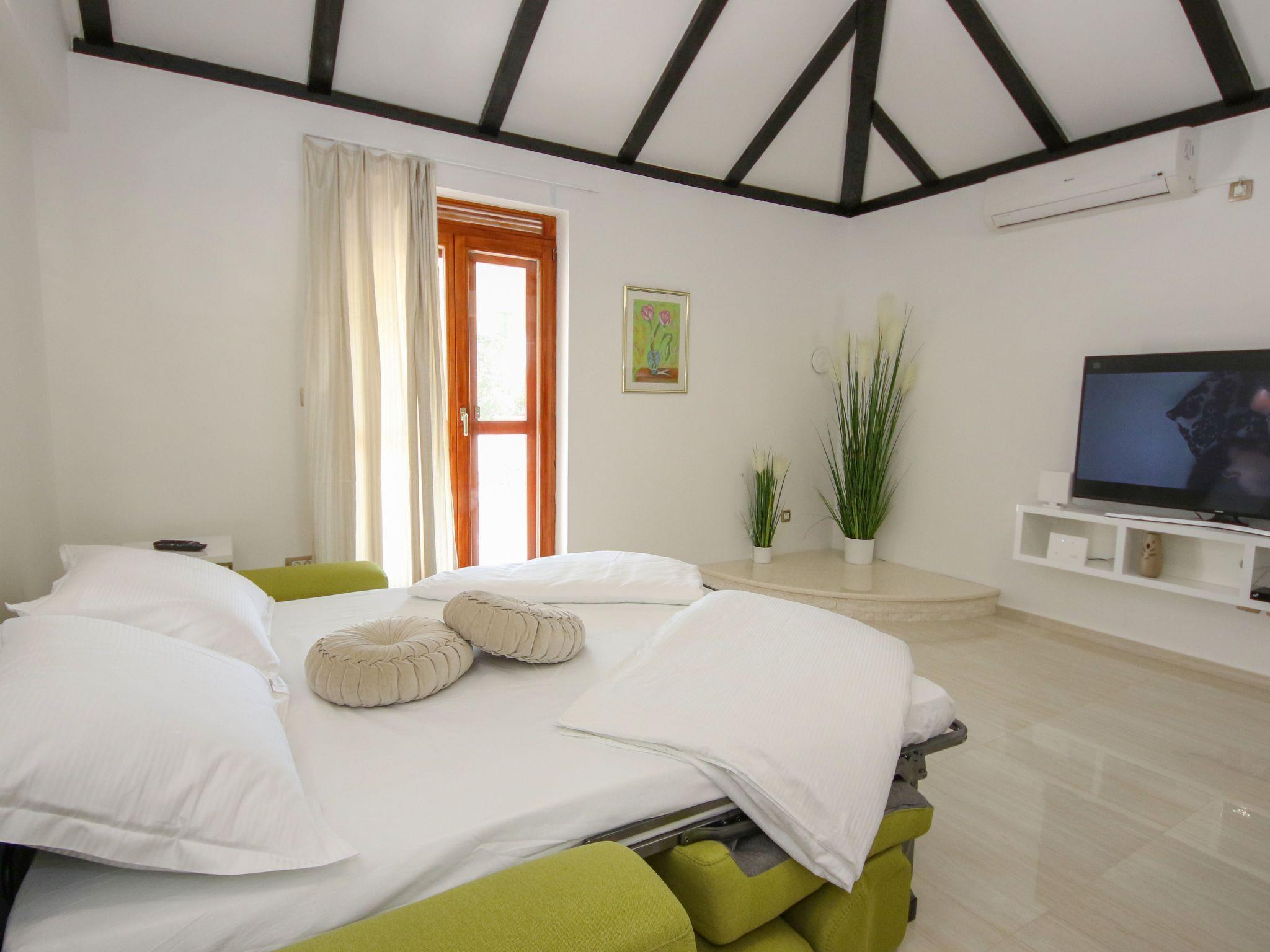 Countryside villa Gabriel can accommodate up to 8 guests in 3 bedrooms with one having an en-suite bathroom. Air-conditioning spreads throughout the property and maintains a cool temperature in the hot summer days. There are another 2 bathrooms available for guests. The spa area is a special feature of the house and it has a toilet, Jacuzzi and a sauna. Guests can also use the pool table, darts as well as table tennis.
